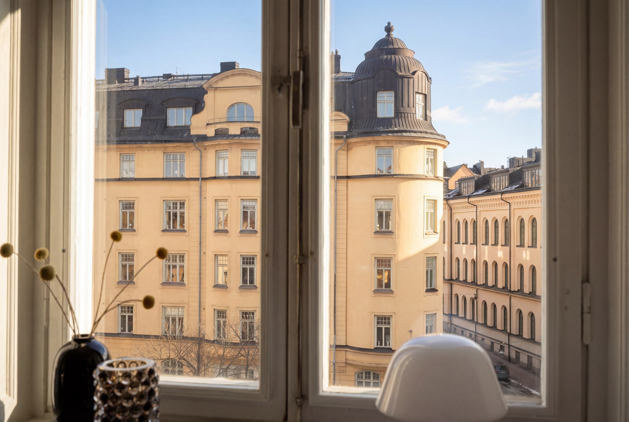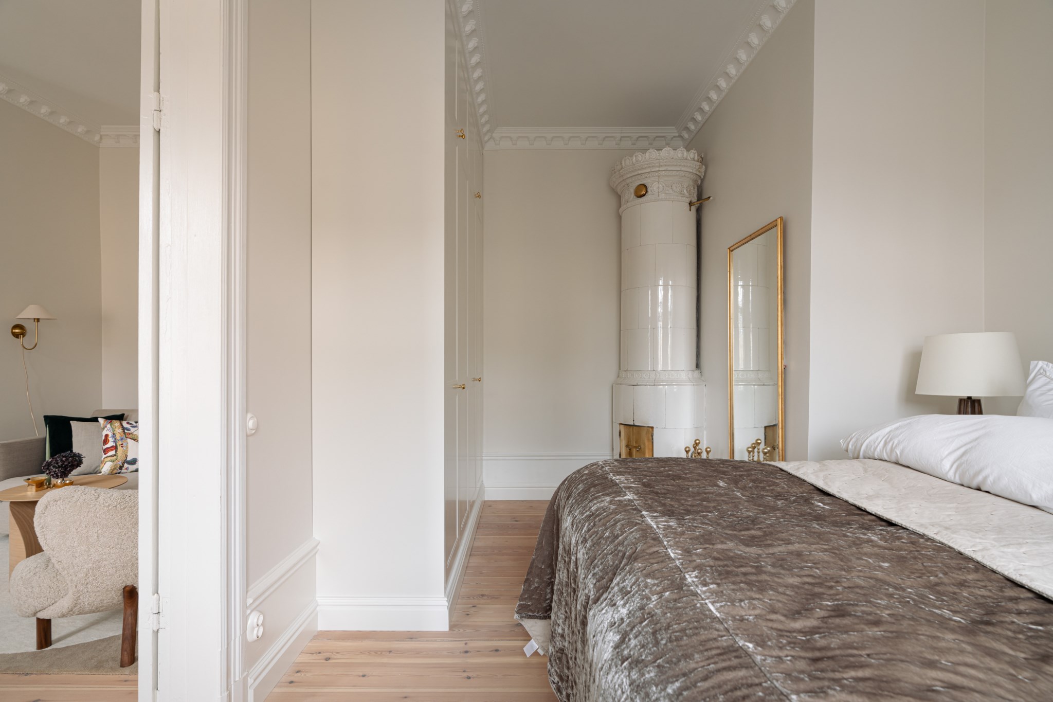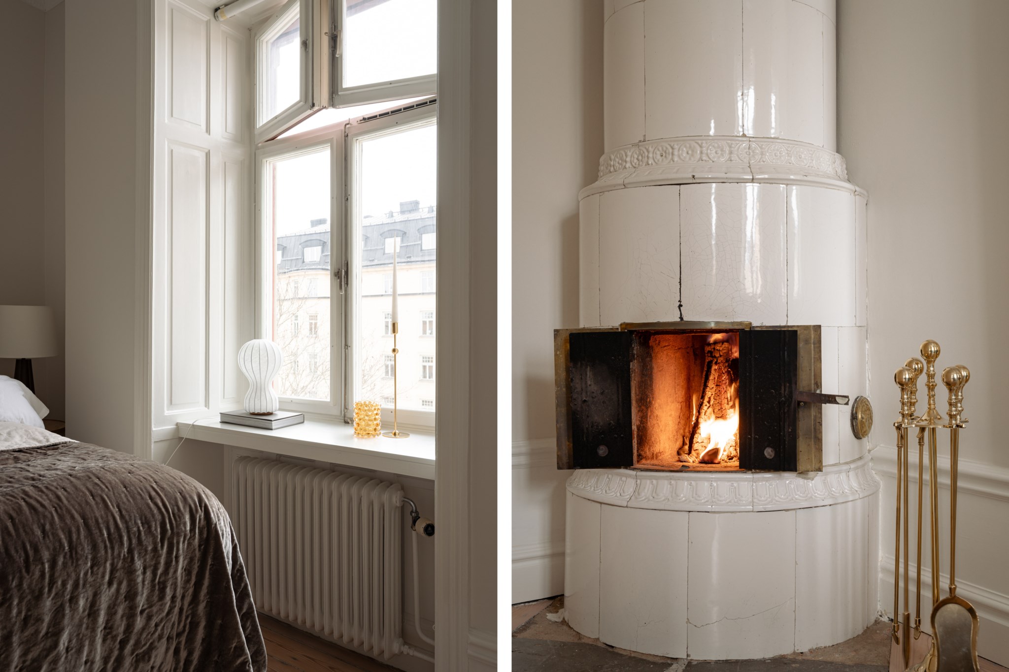 Lägenheten bjuder på vackra originaldetaljer såsom fungerande kakelugn, pampiga dubbeldörrar, imponerande takhöjd om 3,25meter, eleganta stuckaturer, höga golvsocklar och stora, fina fönster i fil som släpper in generöst med ljus och förstärker den luftiga känslan.