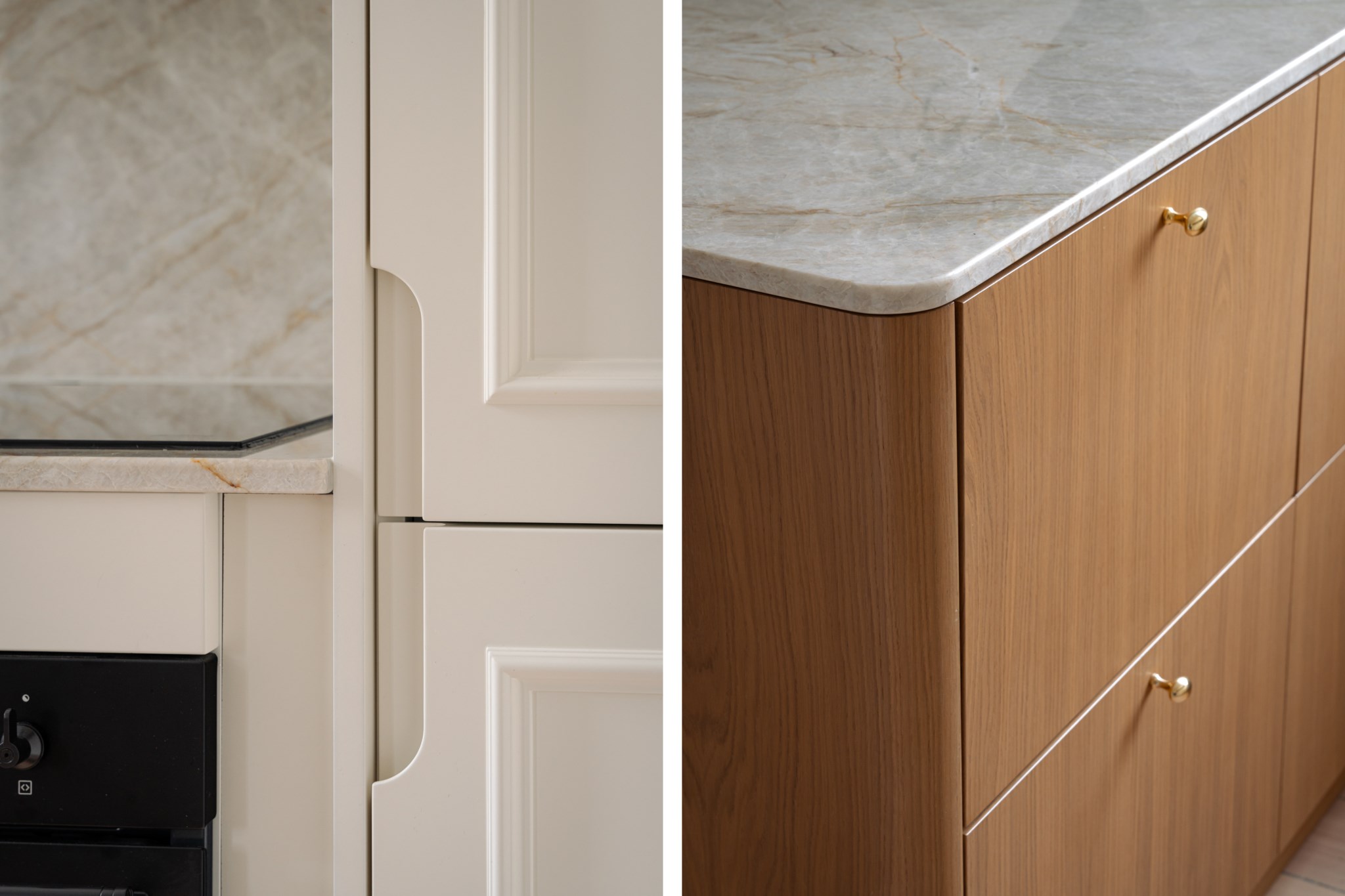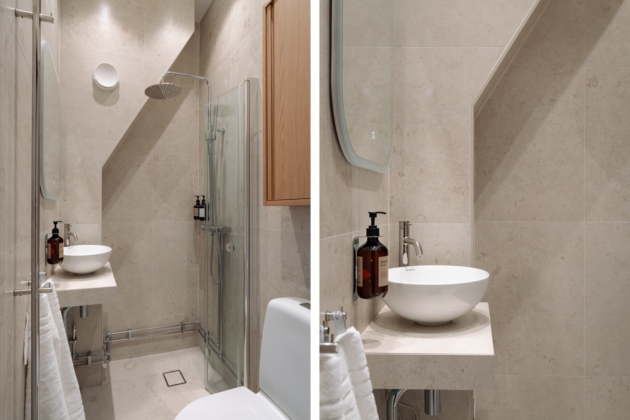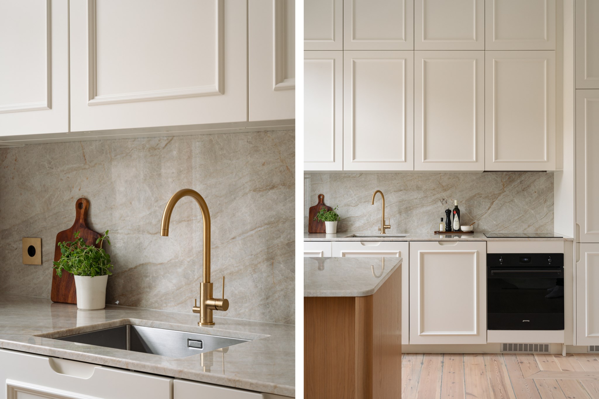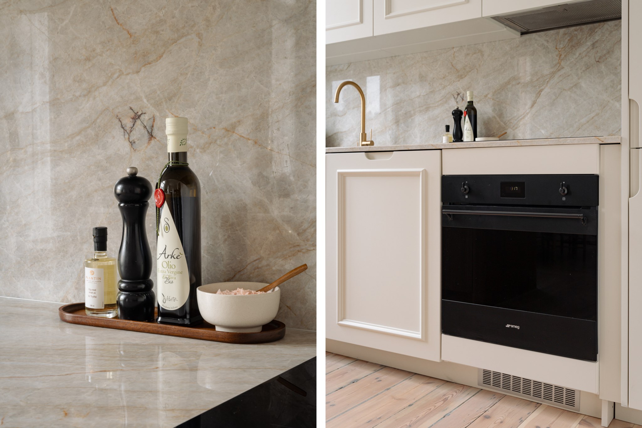 Den öppna planlösningen mellan kök och vardagsrum skapar en social och inbjudande atmosfär, perfekt för både vardag och middagar med vänner. Köket är stilrent och exklusivt med lyxiga materialval, där bänkskivan i Taj Mahal-sten blir ett naturligt blickfång. För extra bekvämlighet är köket förberett för tvättmaskin för den som önskar.