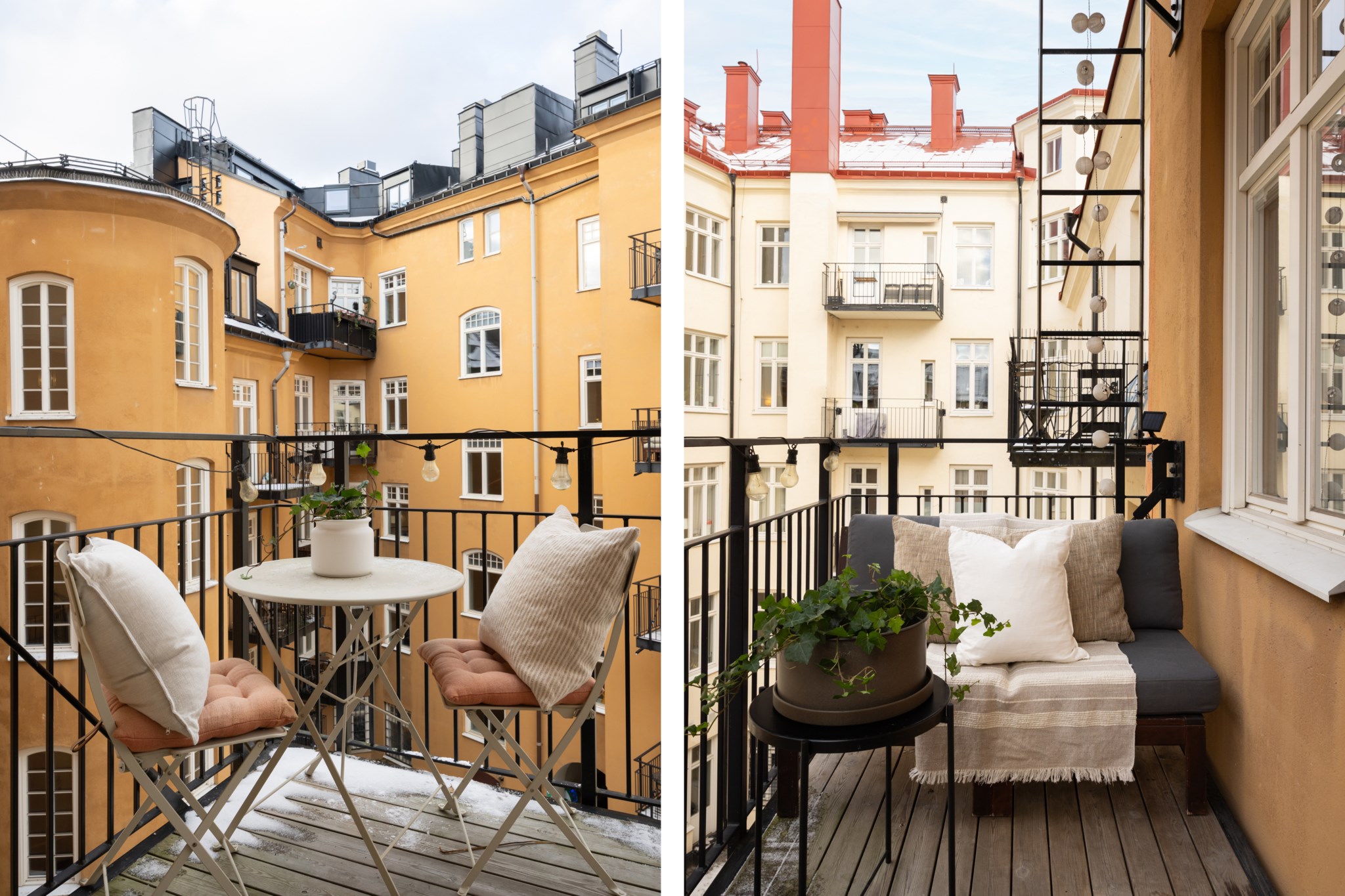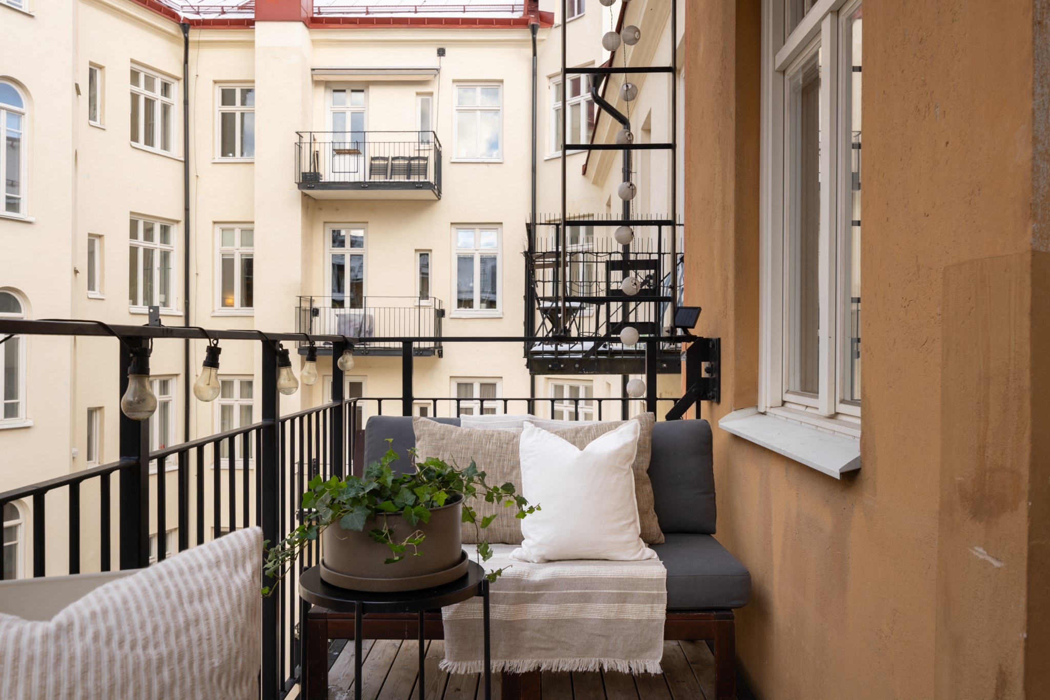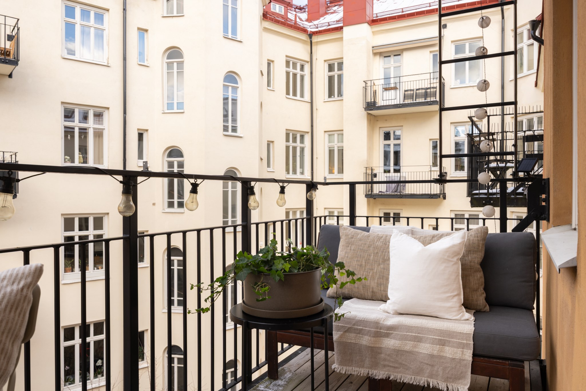 Sekelskiftesetta med stor balkong i skuldfri förening – tyst innergårdsläge.
