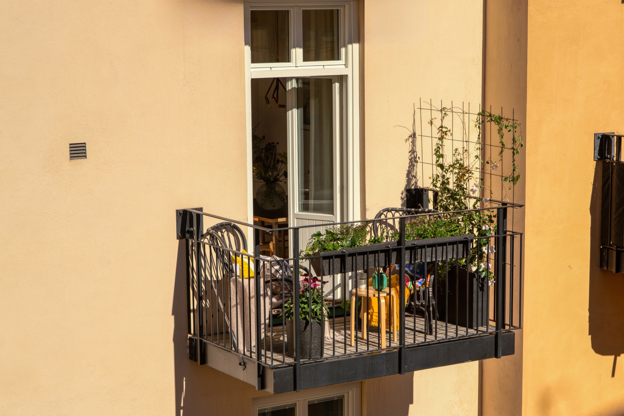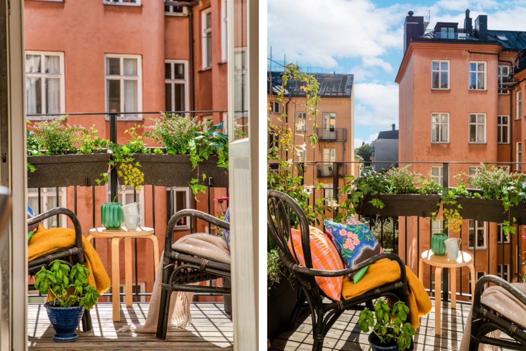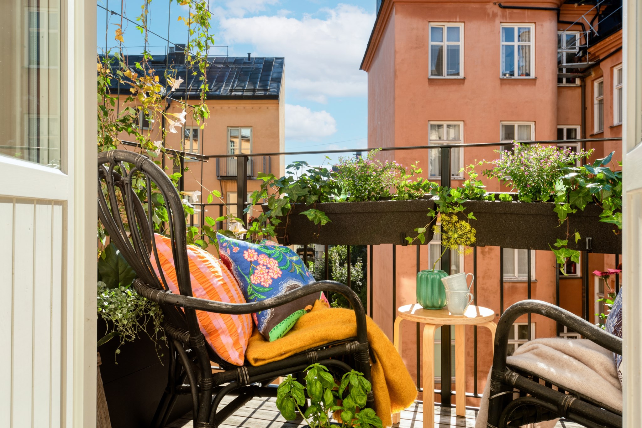 Till lägenheten hör en balkong med utsikt mot den trivsamma innergården.