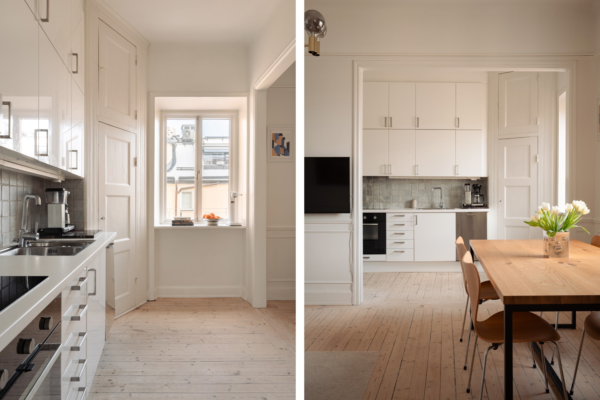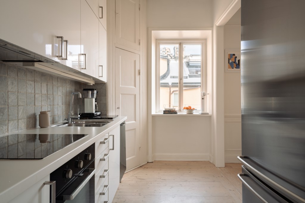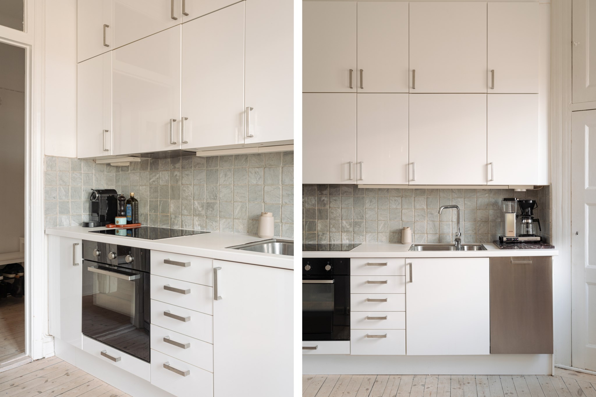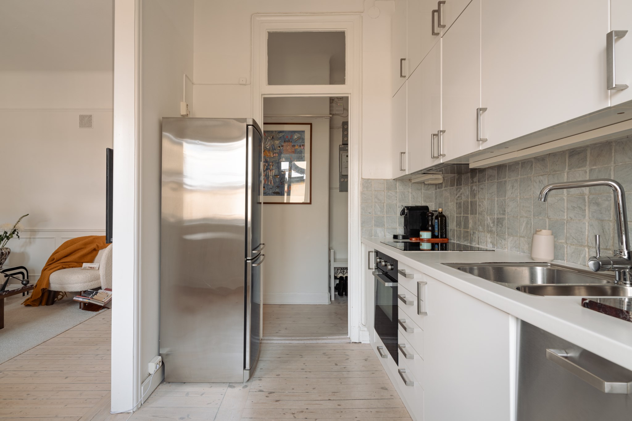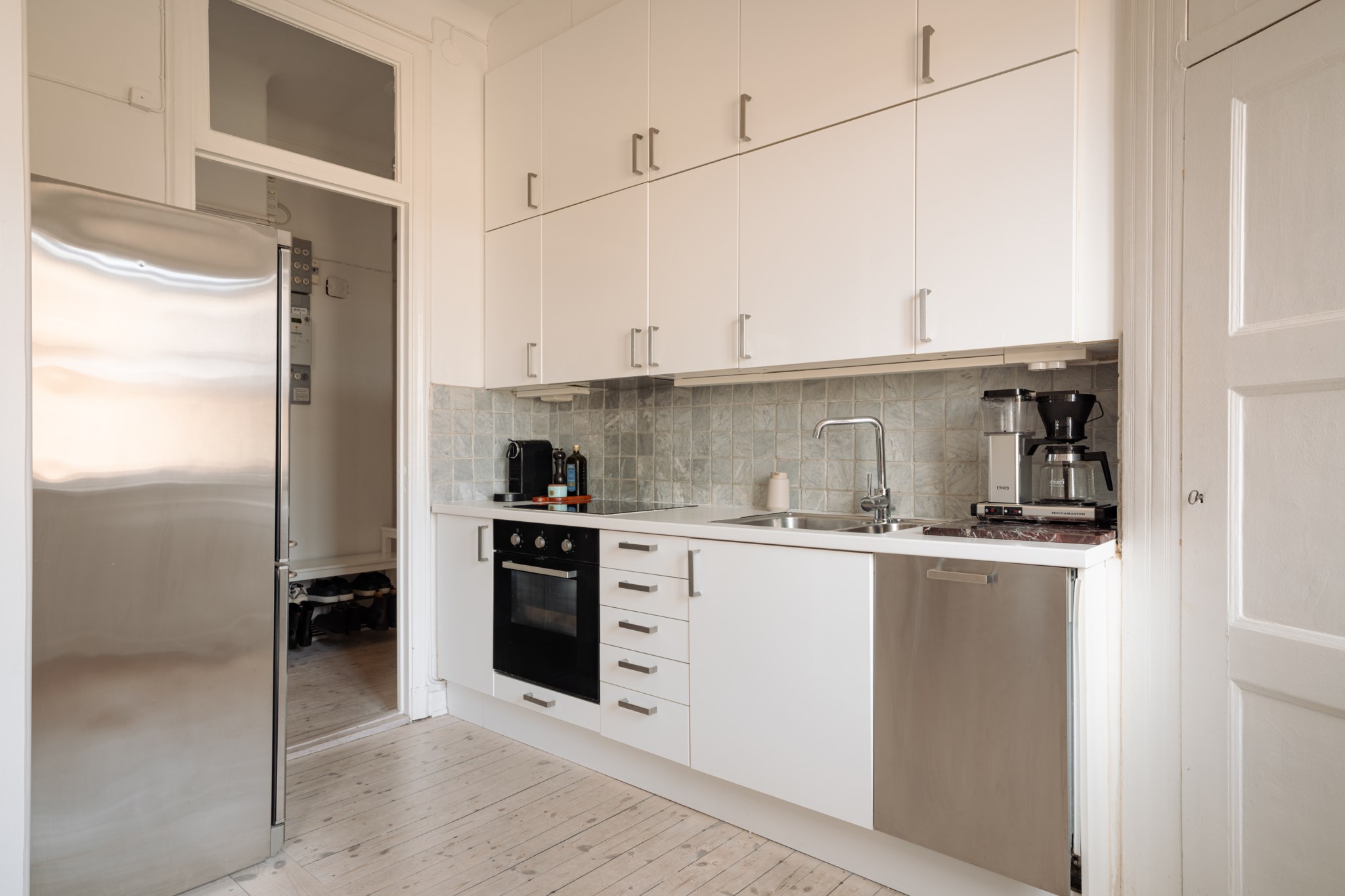 Modernt kök med smakfulla materialval bestående av köksluckor och bänkskiva i vitt med stänkskydd ovan. Den maskinella utrustningen består av diskho, spis, ugn, köksfläkt, diskmaskin samt kyl och frys. Tidlösa ytskikt bestående av ljusa väggar och ljust trägolv.