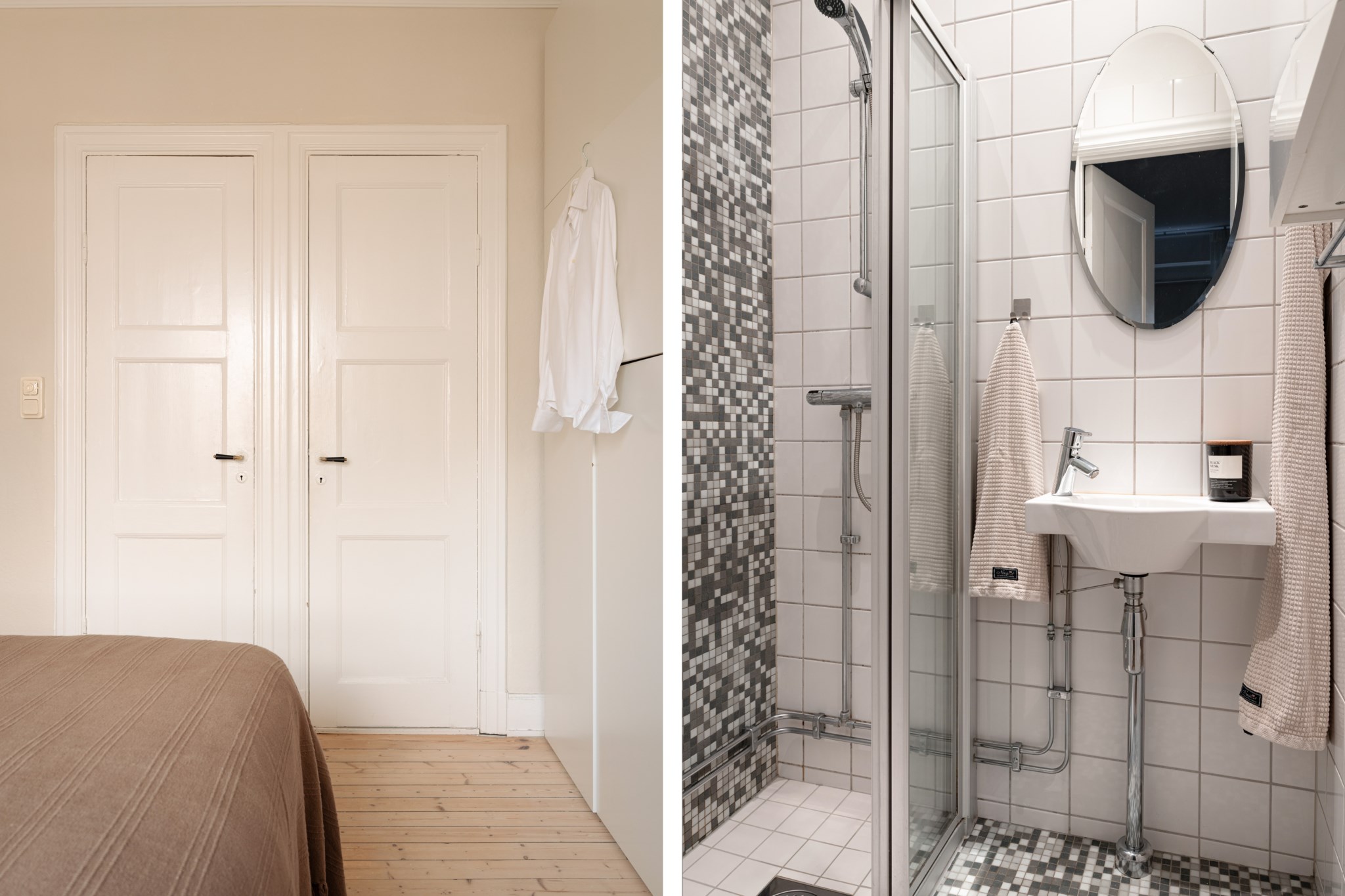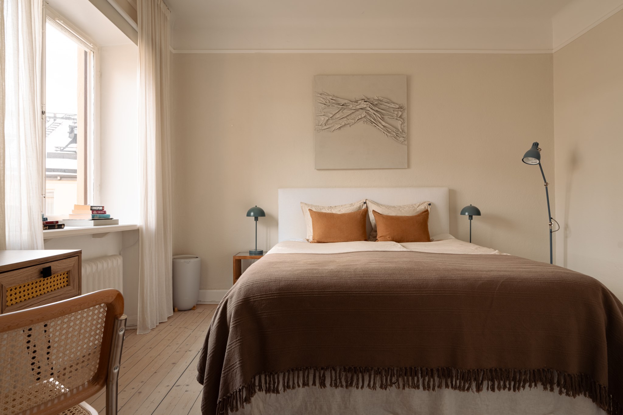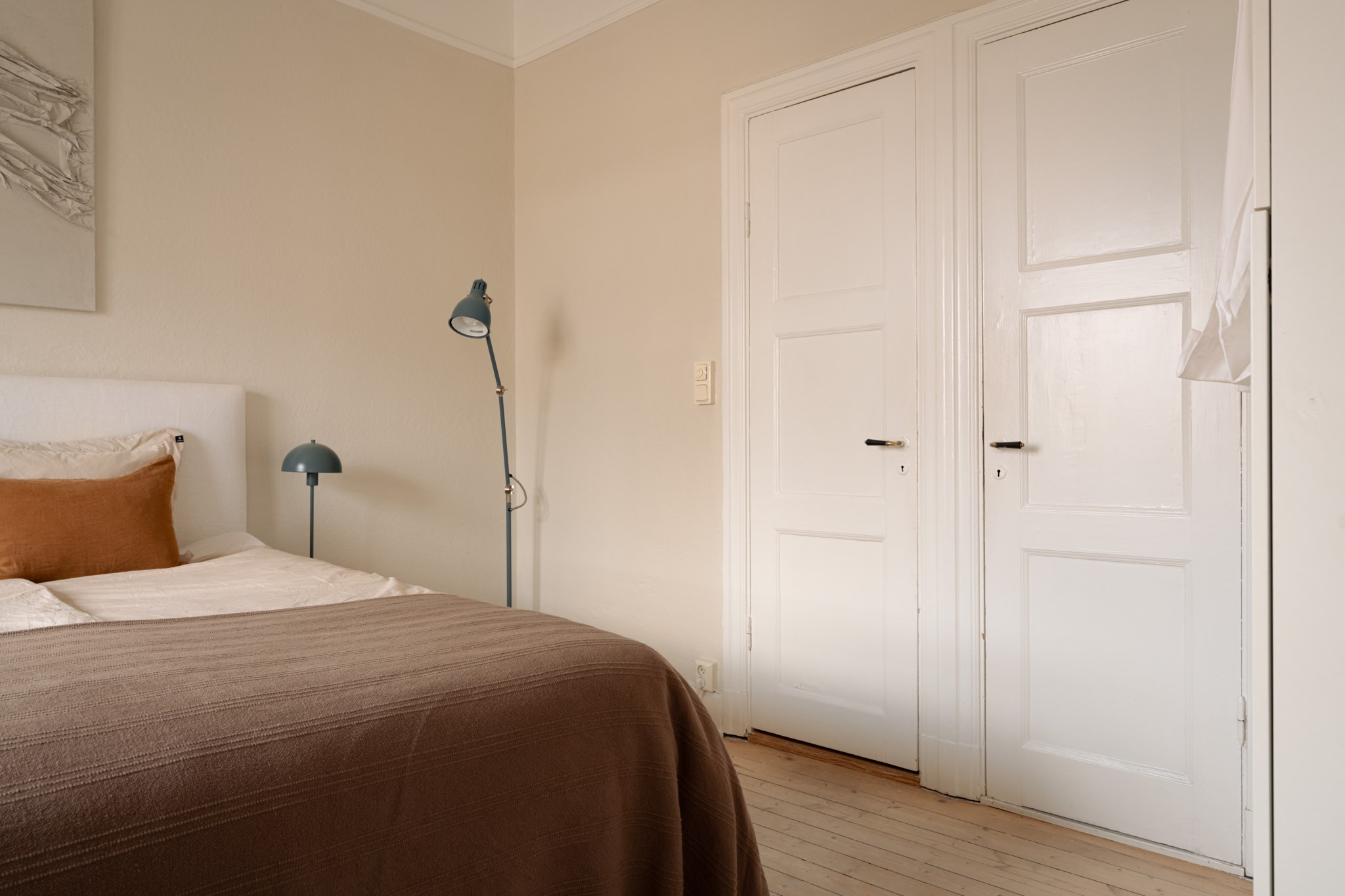 Stort sovrum med plats för dubbelsäng och annat möblemang efter smak och behov. Gott om plats för förvaring via en klädkammare. Ett härligt ljusinsläpp tar sig in via ett stort fönster. Tidlösa ytskikt bestående av ljusa väggar och ljust trägolv.