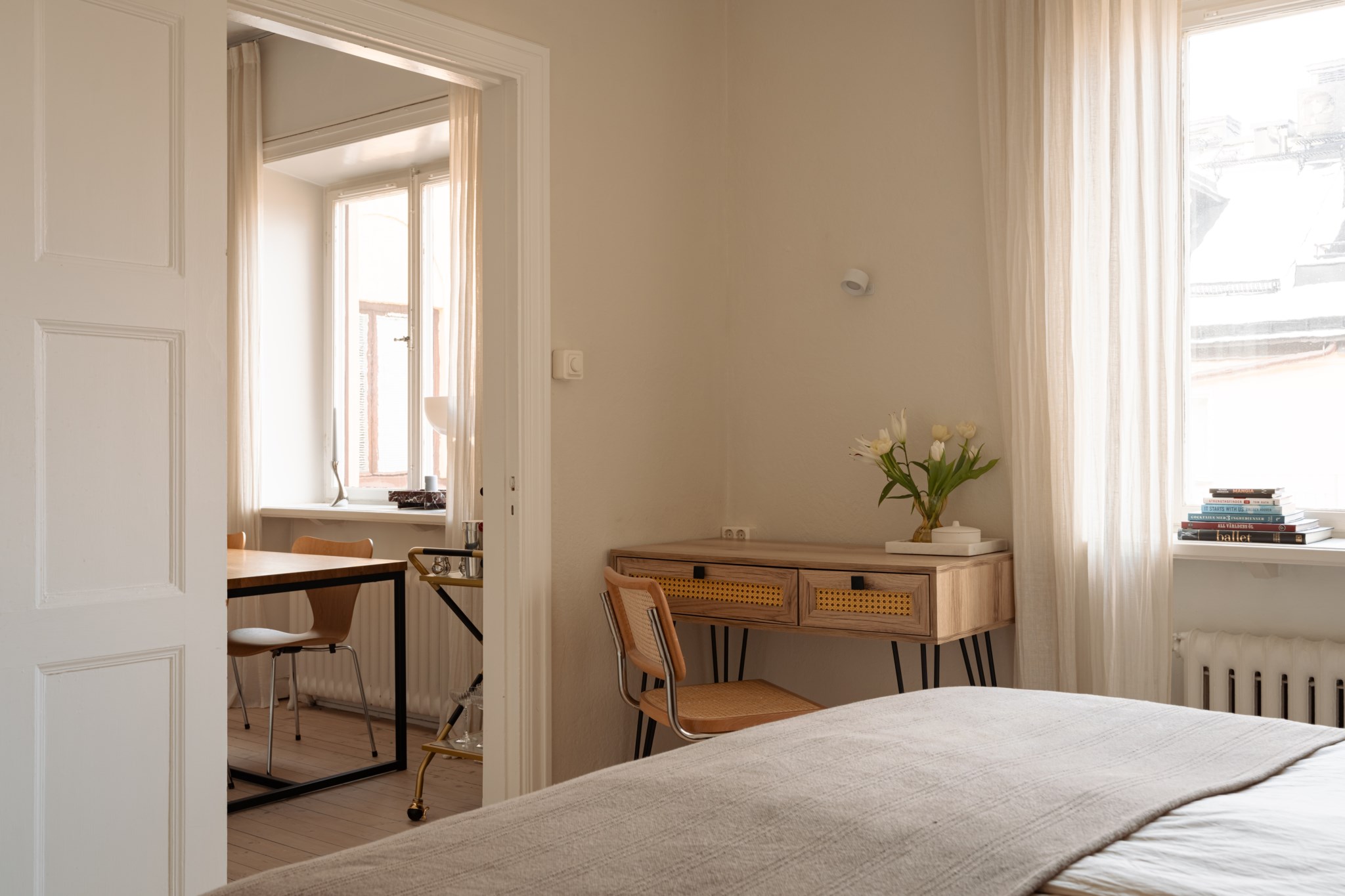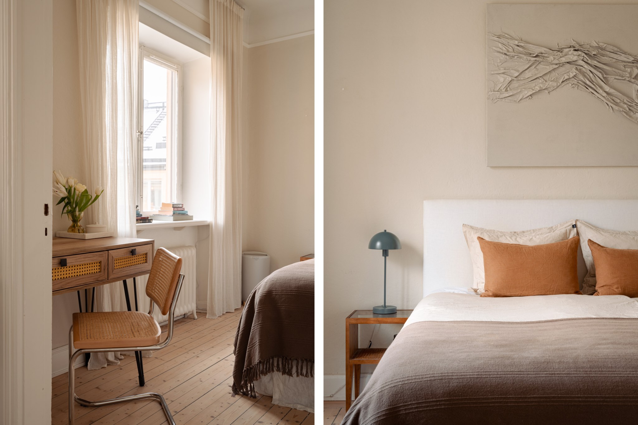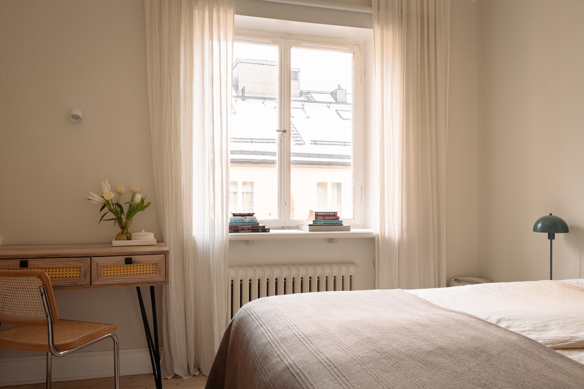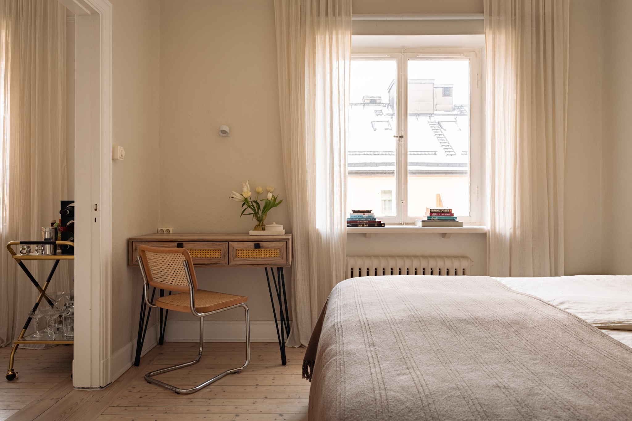 Stort sovrum med plats för dubbelsäng och annat möblemang efter smak och behov. Gott om plats för förvaring via en klädkammare. Ett härligt ljusinsläpp tar sig in via ett stort fönster. Tidlösa ytskikt bestående av ljusa väggar och ljust trägolv.