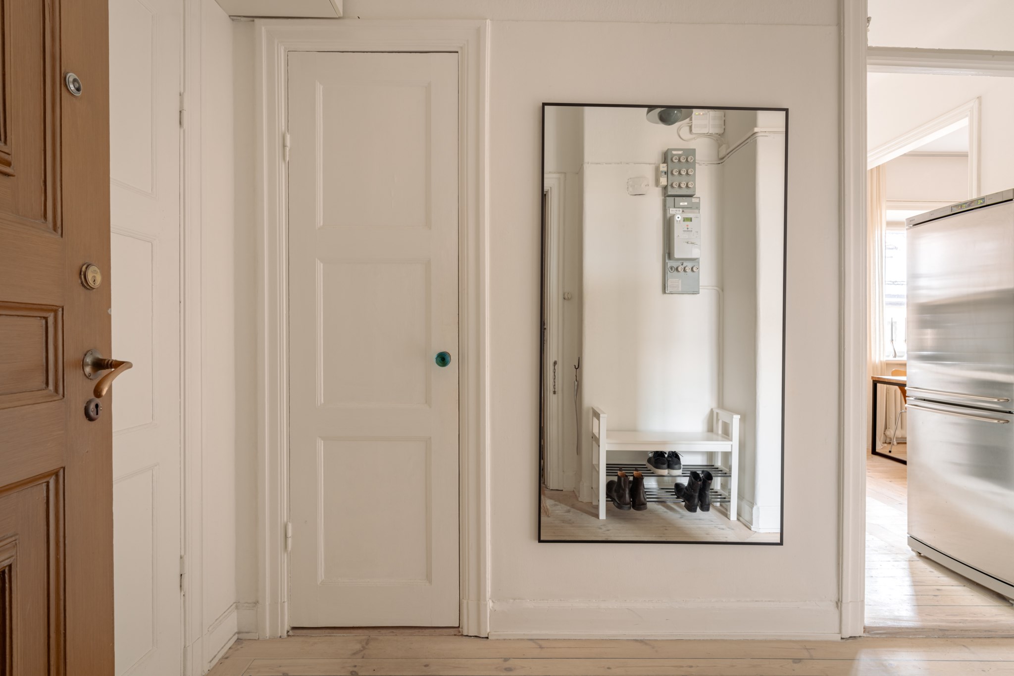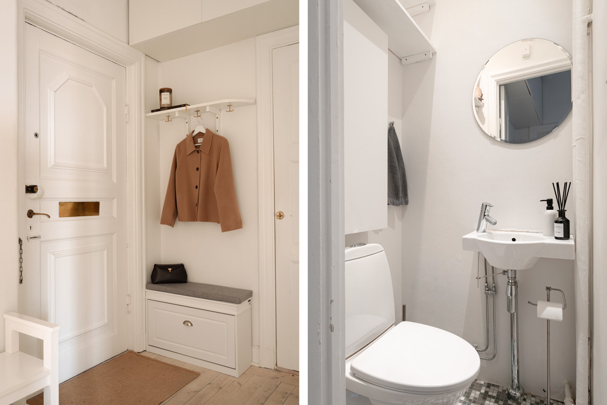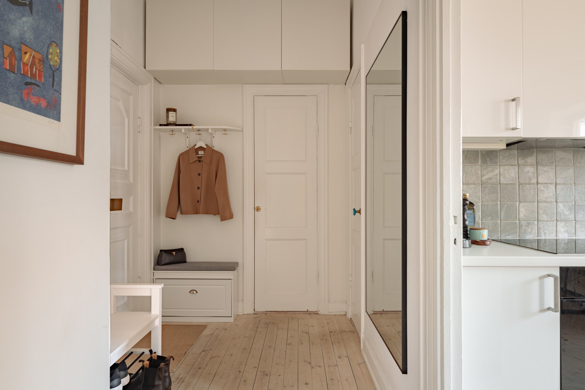 Välkomnande hall med plats för avhängning, skoställ samt mindre avlastningsmöblemang efter smak och behov. Gott om plats för förvaring via intilliggande klädkammare. Tidlösa ytskikt bestående av ljusa väggar och ljust trägolv.