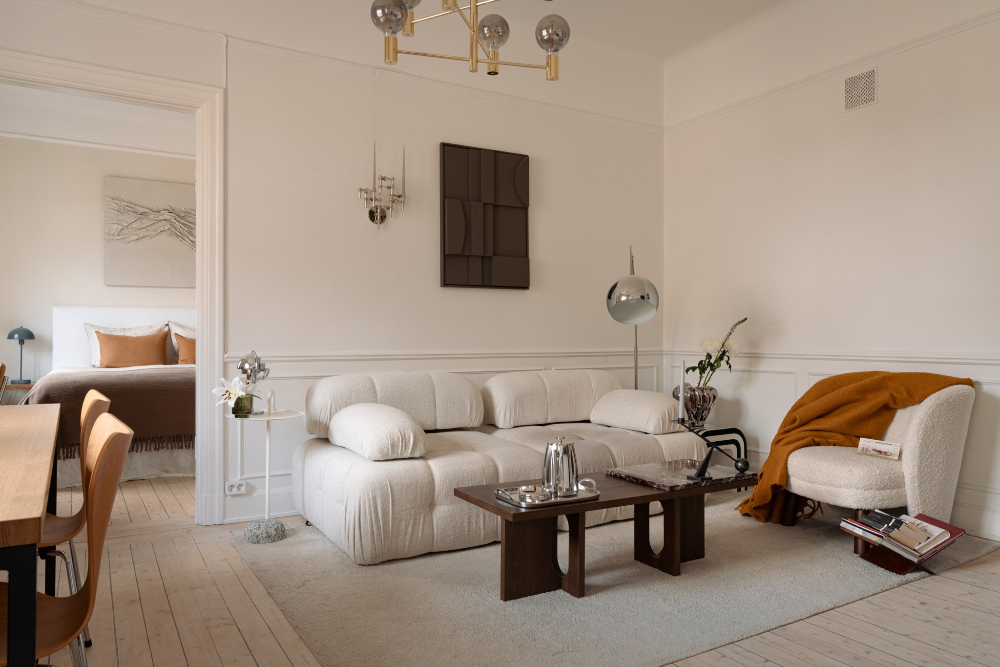 Luftigt vardagsrum med tidlösa ytskikt bestående av ljusa väggar och ljust trägolv. I vardagsrummet inryms matgrupp, soffa, soffbord, TV-möbel samt annat möblemang efter smak och behov. Här möts du av ett härligt ljusinsläpp via stora fönster.