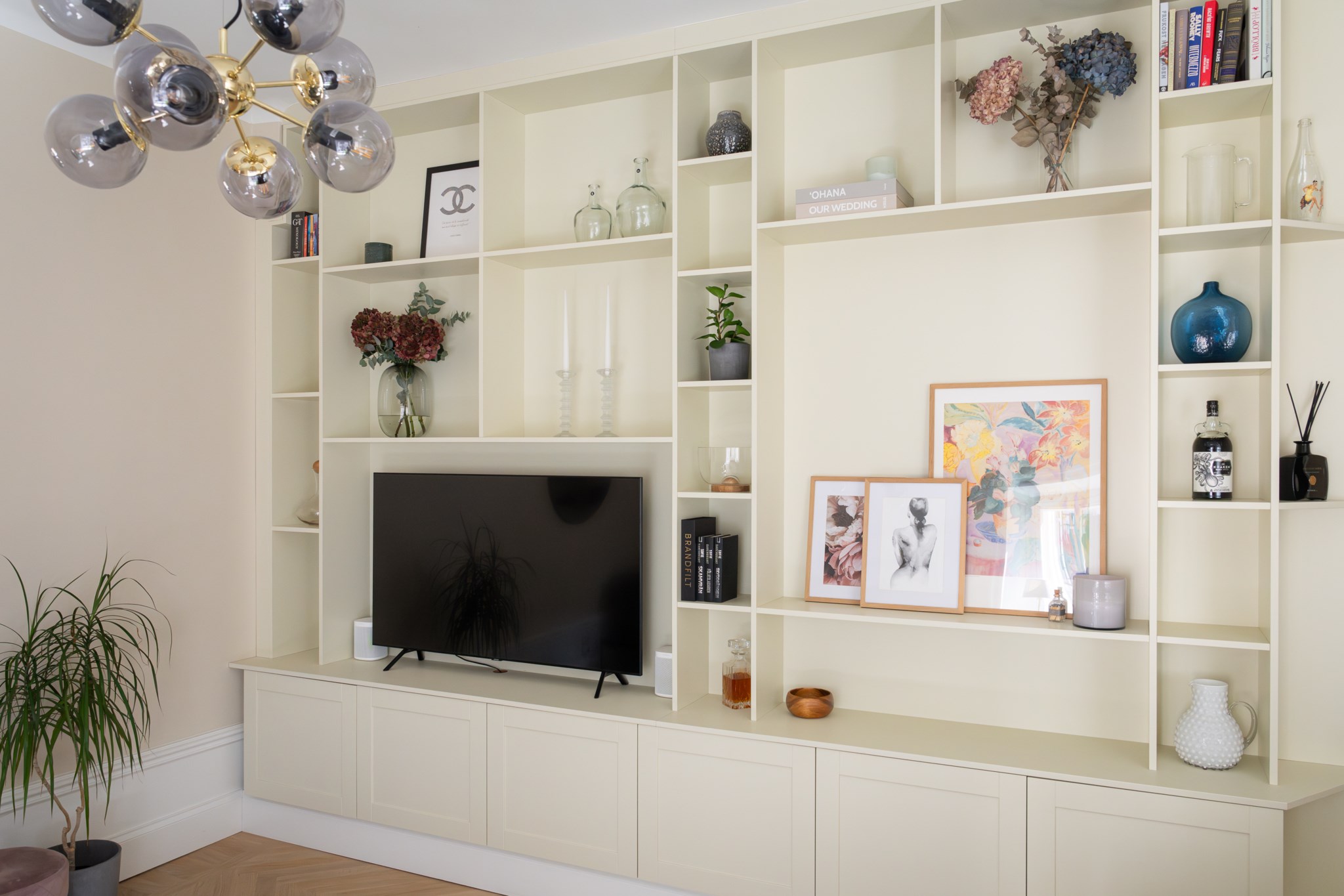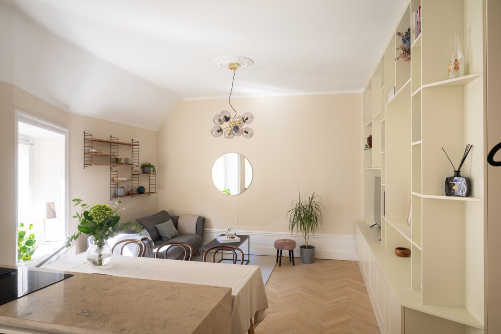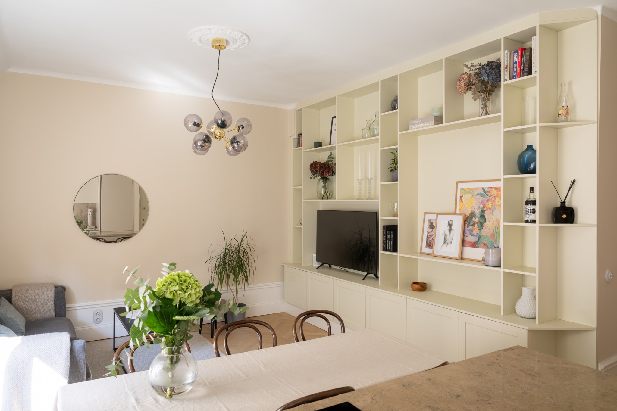 Luftigt vardagsrum i öppen planlösning med kök. Vardagsrummet karaktäriseras av väggar i beige nyans, ljus fiskbensparkett, höga golvsocklar och en platsbyggd bokhylla som rymmer gott om förvaring. Plats för soffa, soffbord och annat möblemang efter smak och behov. Generöst ljusinsläpp via stort fönster.