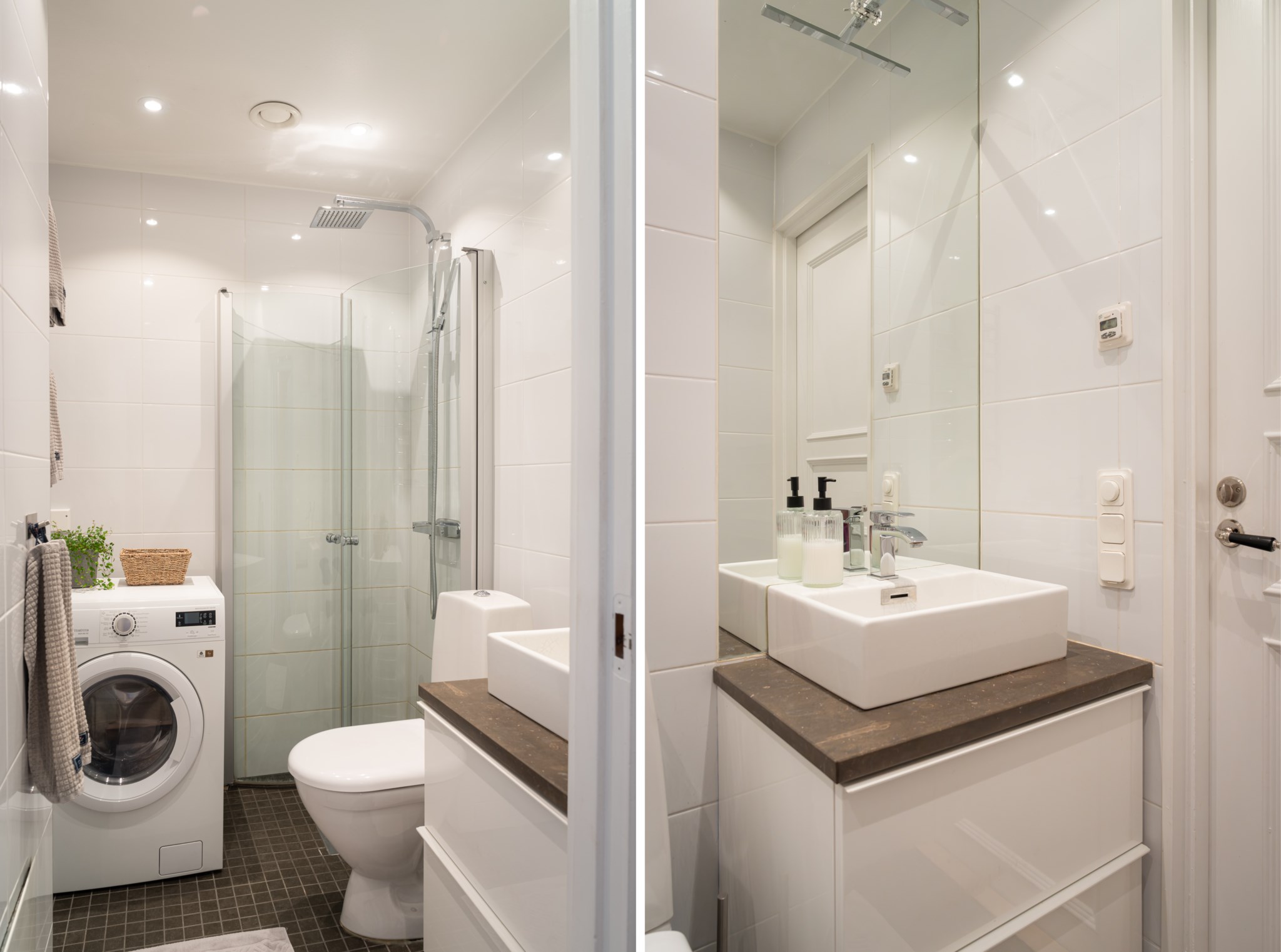 Rymligt badrum med ljust kakel och mörkt klinker. Badrummet är utrustat med WC, handfat med kommod, dusch med glasväggar samt bekvämligheter som tvättmaskin.