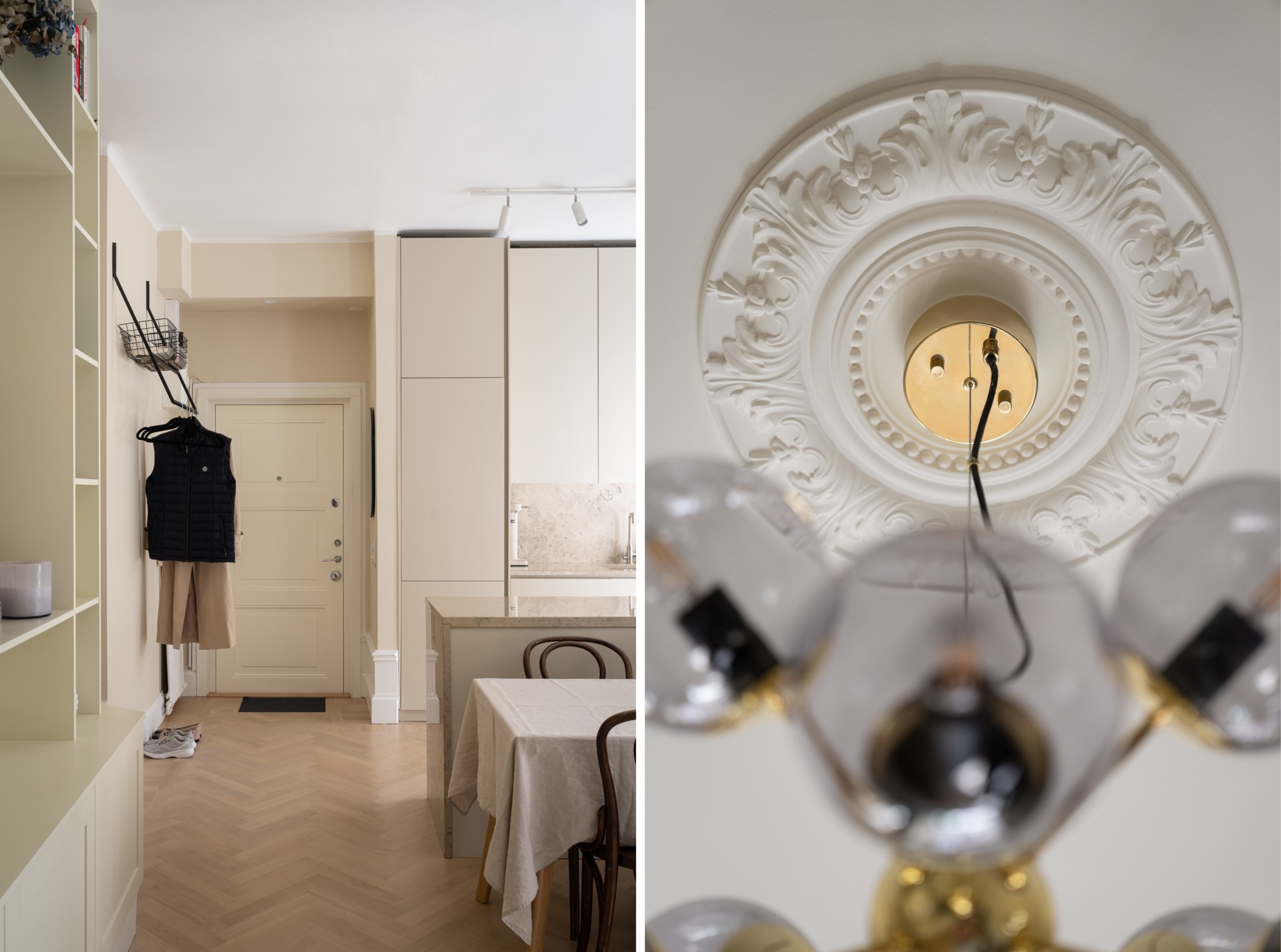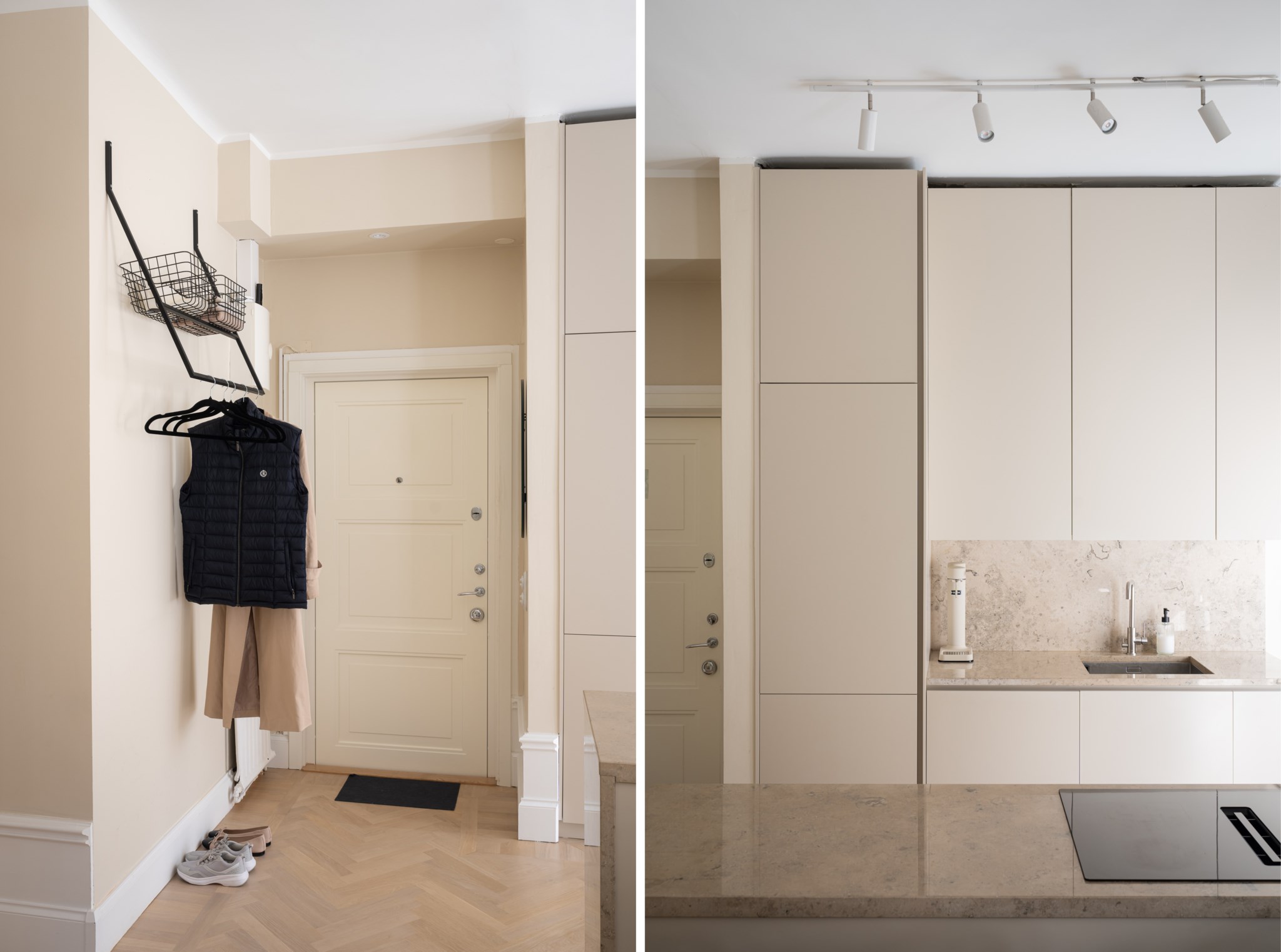 I hallen välkomnas du direkt av ett slående ljusinsläpp. Ytskikten består av väggar i beige nyans samt ljus fiskbensparkett. Här finns även perfekt plats för avhängning och skoställ.