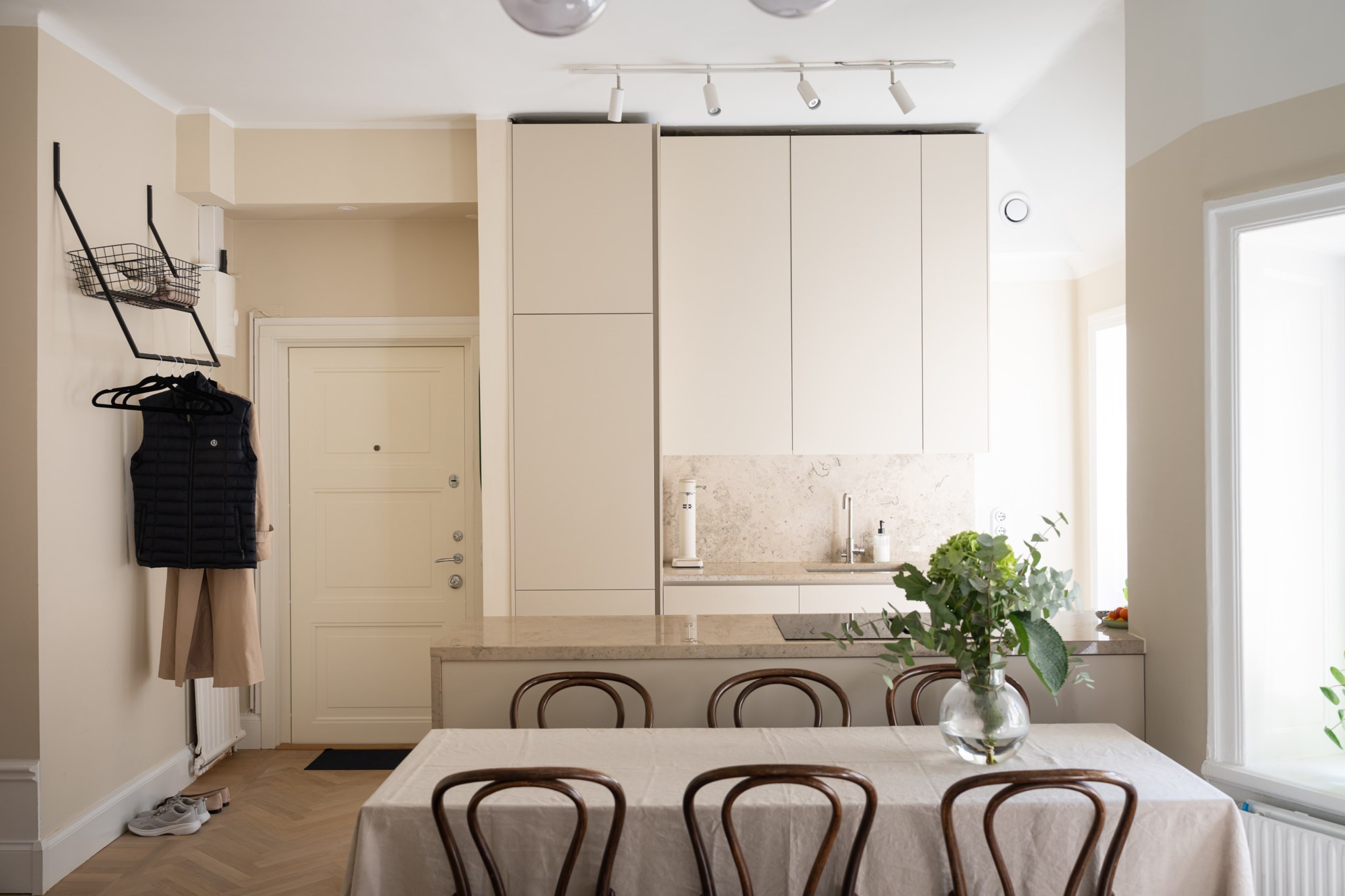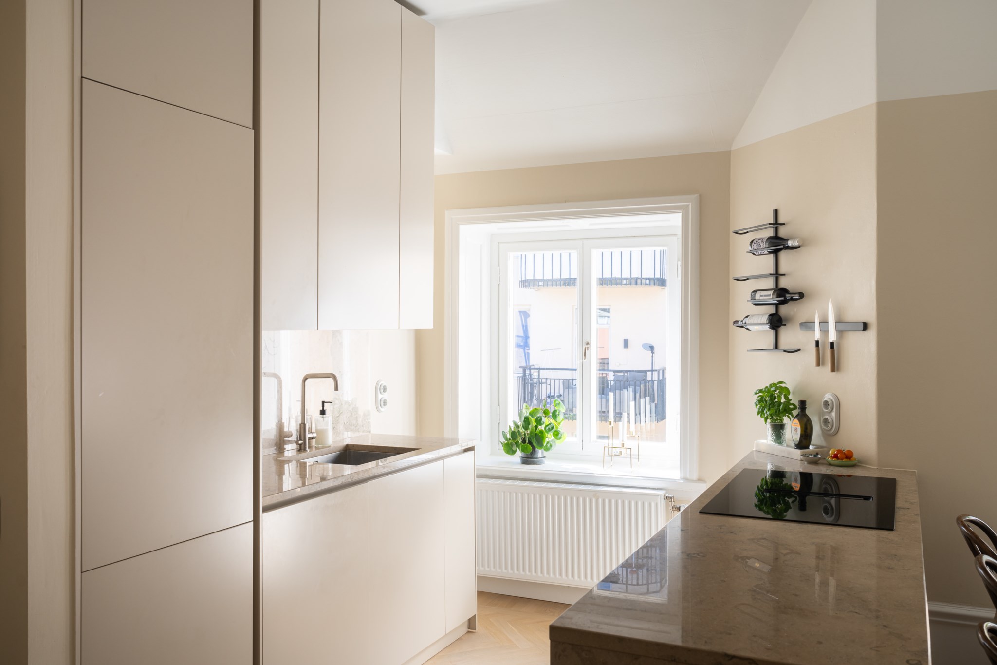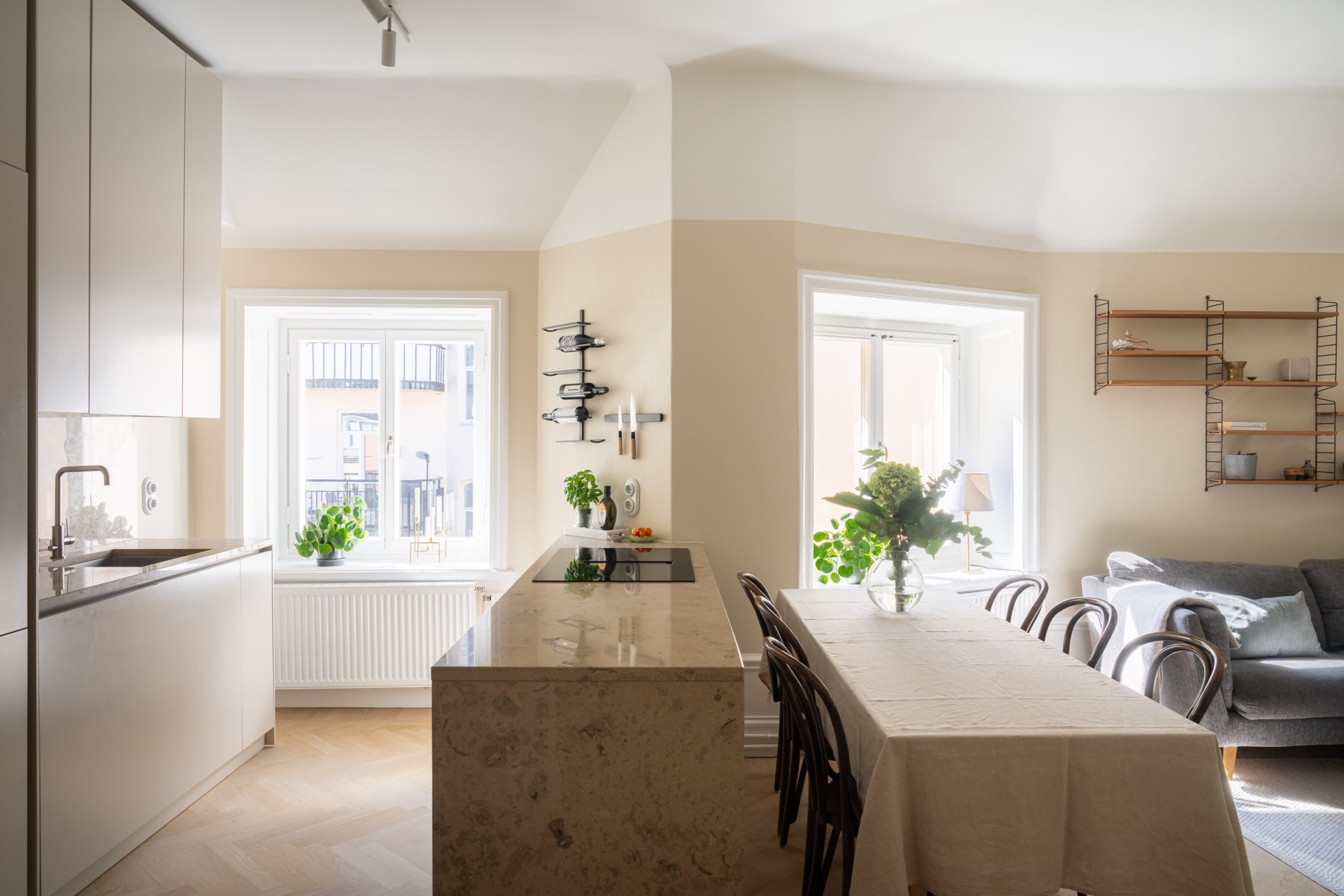 Modernt kök i öppen och social planlösning med vardagsrum. Smakfulla materialval bestående av köksluckor i beige nyans samt väl utvald bänkskiva. Tidlösa ytskikt bestående av väggar i beige nyans samt ljus fiskbensparkett. Köket är utrustat med diskho, spis ovan köksö, diskmaskin samt kyl och frys. Intill köket lämnas även plats för matgrupp om 6 personer. Ett härligt ljusinsläpp tar sig in via stor fönster.