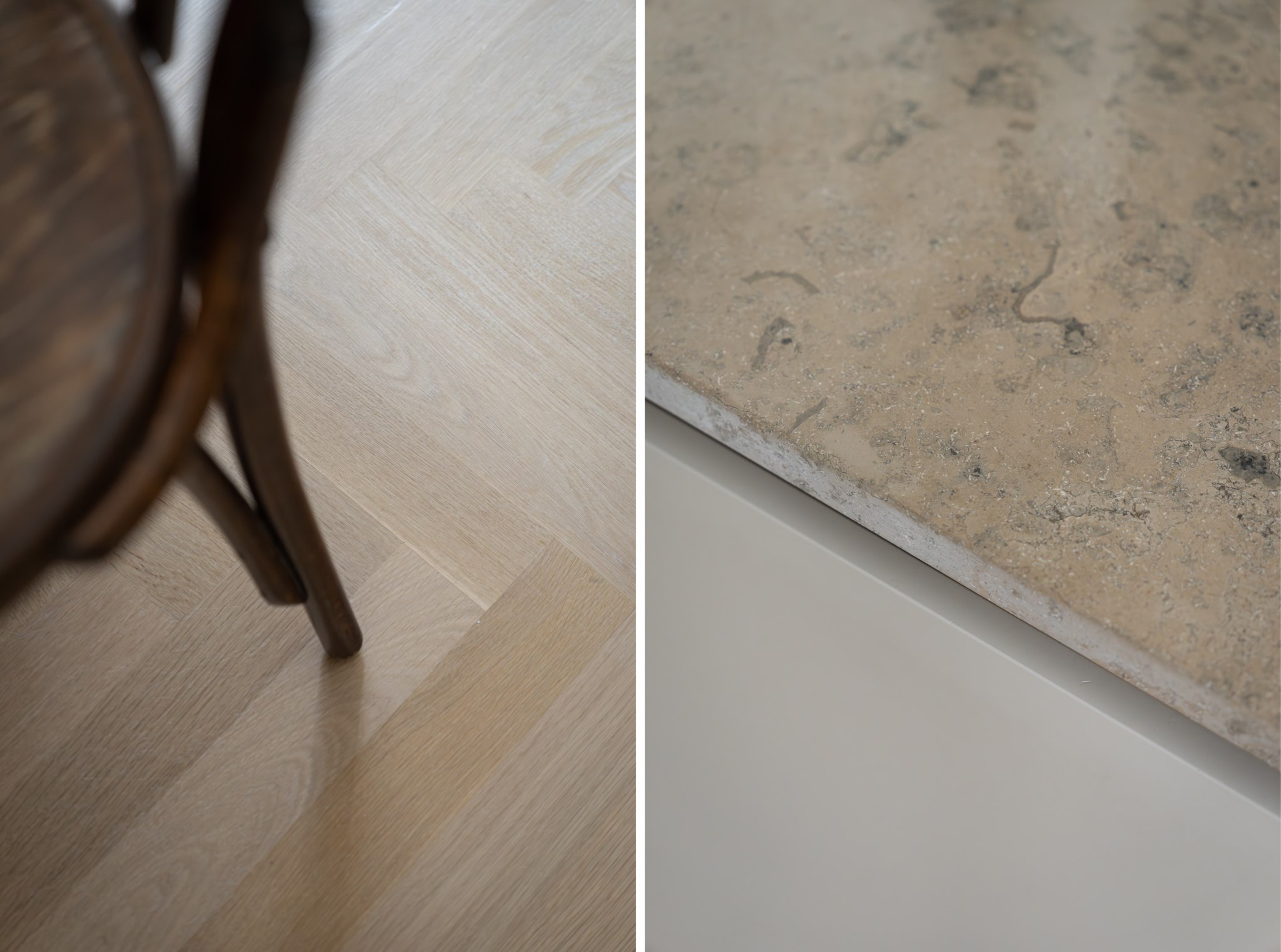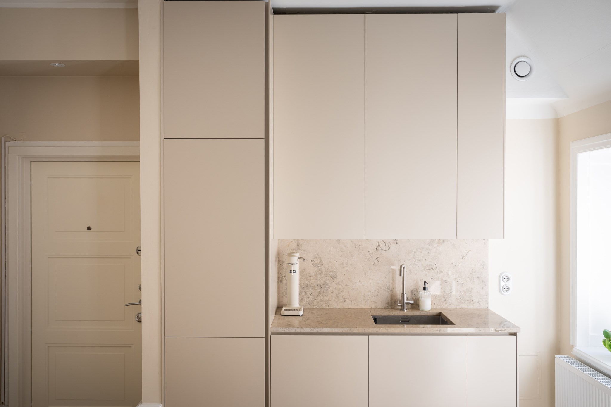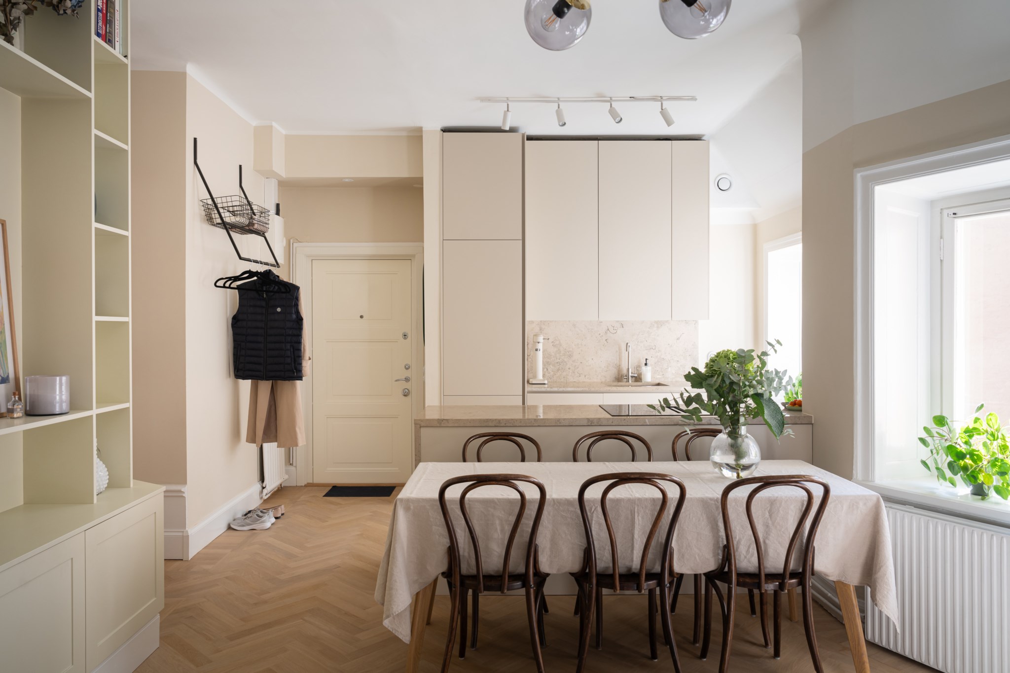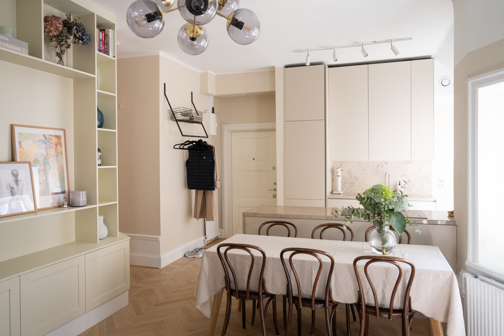 Modernt kök i öppen och social planlösning med vardagsrum. Smakfulla materialval bestående av köksluckor i beige nyans samt väl utvald bänkskiva. Tidlösa ytskikt bestående av väggar i beige nyans samt ljus fiskbensparkett. Köket är utrustat med diskho, spis ovan köksö, diskmaskin samt kyl och frys. Intill köket lämnas även plats för matgrupp om 6 personer. Ett härligt ljusinsläpp tar sig in via stor fönster.