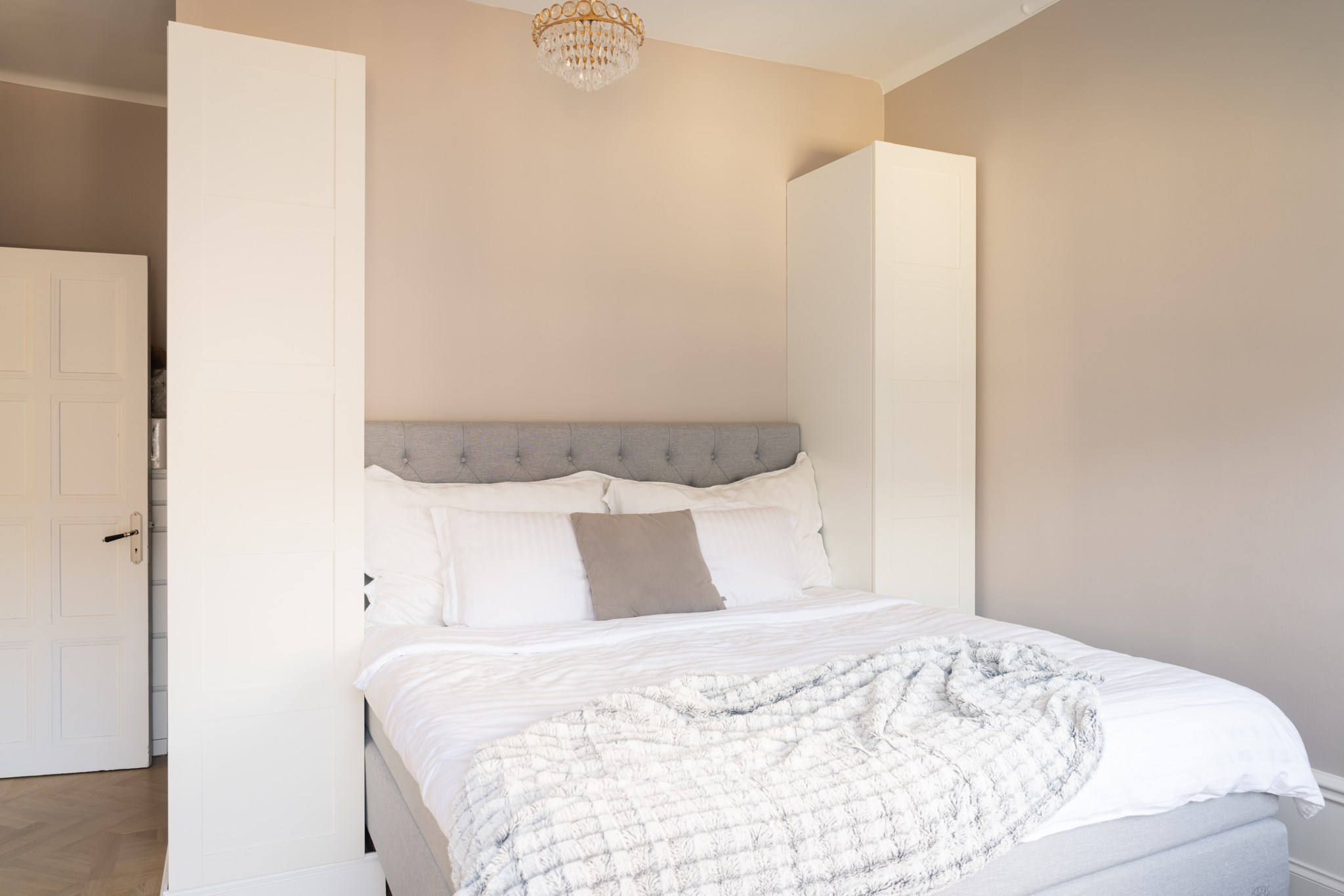 Mysigt sovrum med plats för säng och mindre möblemang efter smak och behov. Ytskikten består av väggar i beige nyans samt ljus fiskbensparkett. Gott om förvaring finns via garderober samt intilliggande walk-in-closet. Från sovrummet nås även bostadens balkong med vacker utsikt.