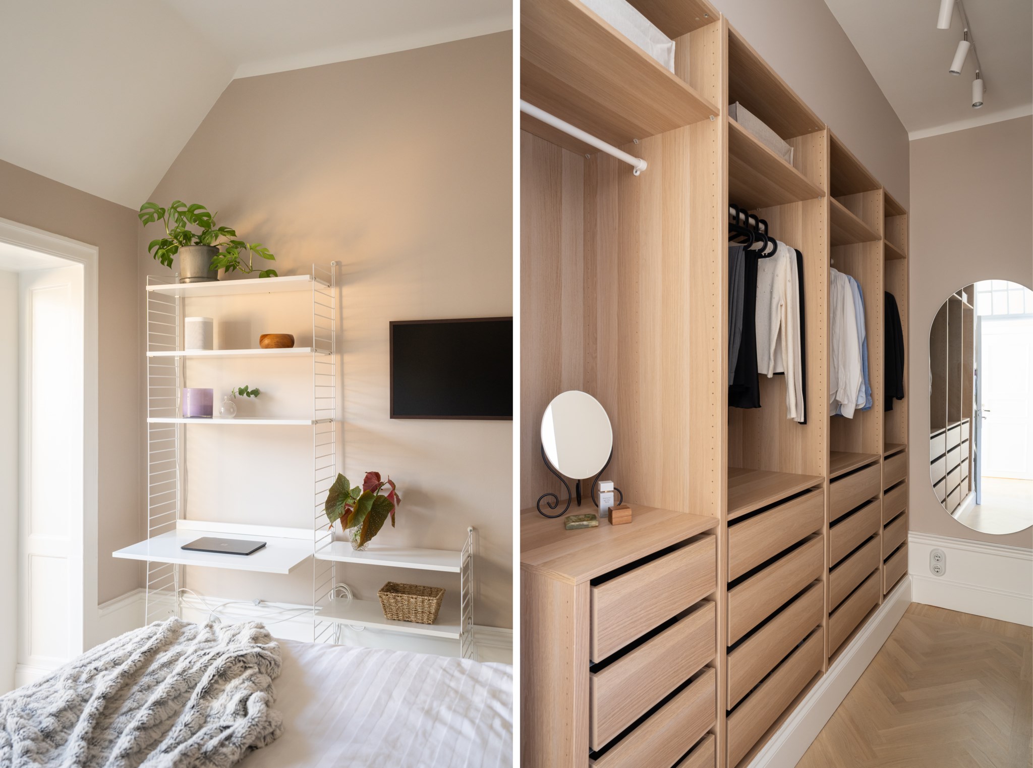 Välplanerad och rymlig walk-in-closet med lådförvaring och avhängning. Ytskikten består av väggar i beige nyans samt ljus fiskbensparkett.