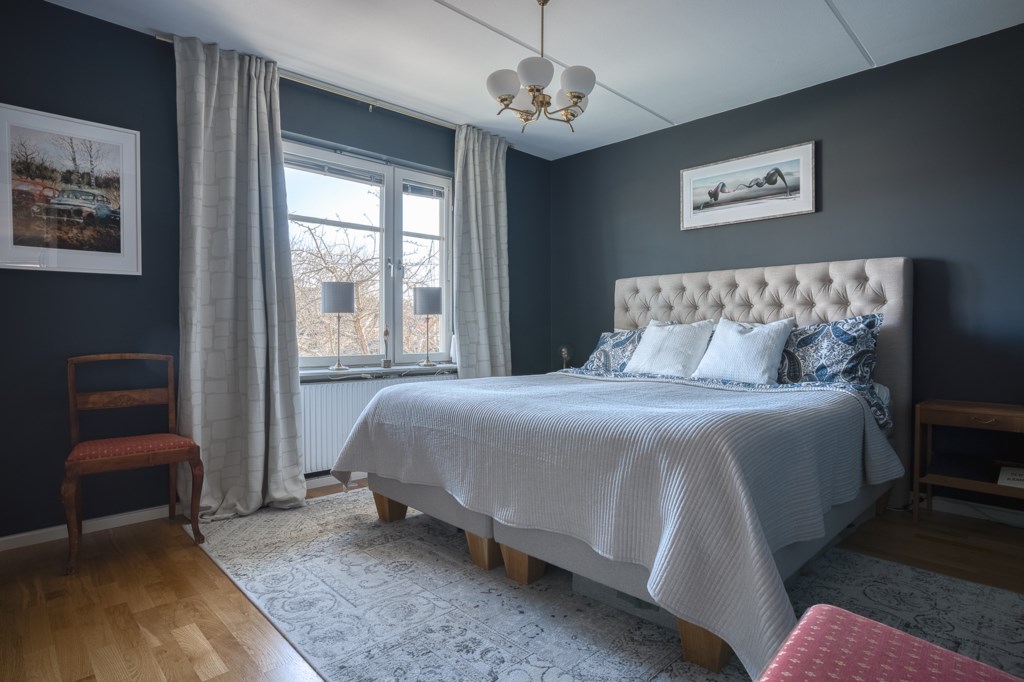 Master bedroom med målade ytskikt och parkettgolv. Plats för dubbelsäng med tillhörande sängbord samt generöst ljusinsläpp från stort fönsterparti.