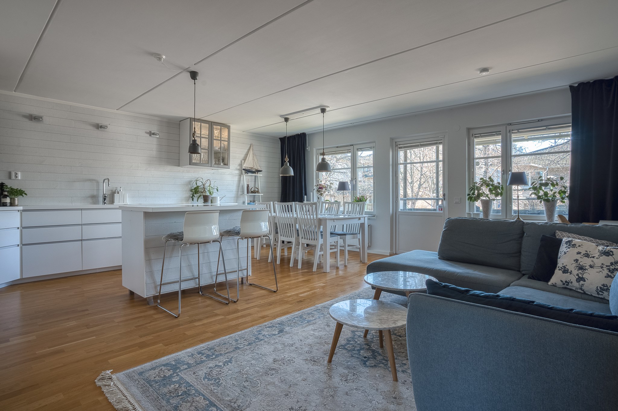 Stilren bostad om 96 välplanerade kvadratmeter där den öppna planlösningen mellan kök och vardagsrum ger stora sociala ytor som kombineras med en välkomnande hall, tre rymliga sovrum och två renoverade badrum. Bostaden har renoverats i omgångar sedan 2015 och håller genomgående en hög standard.