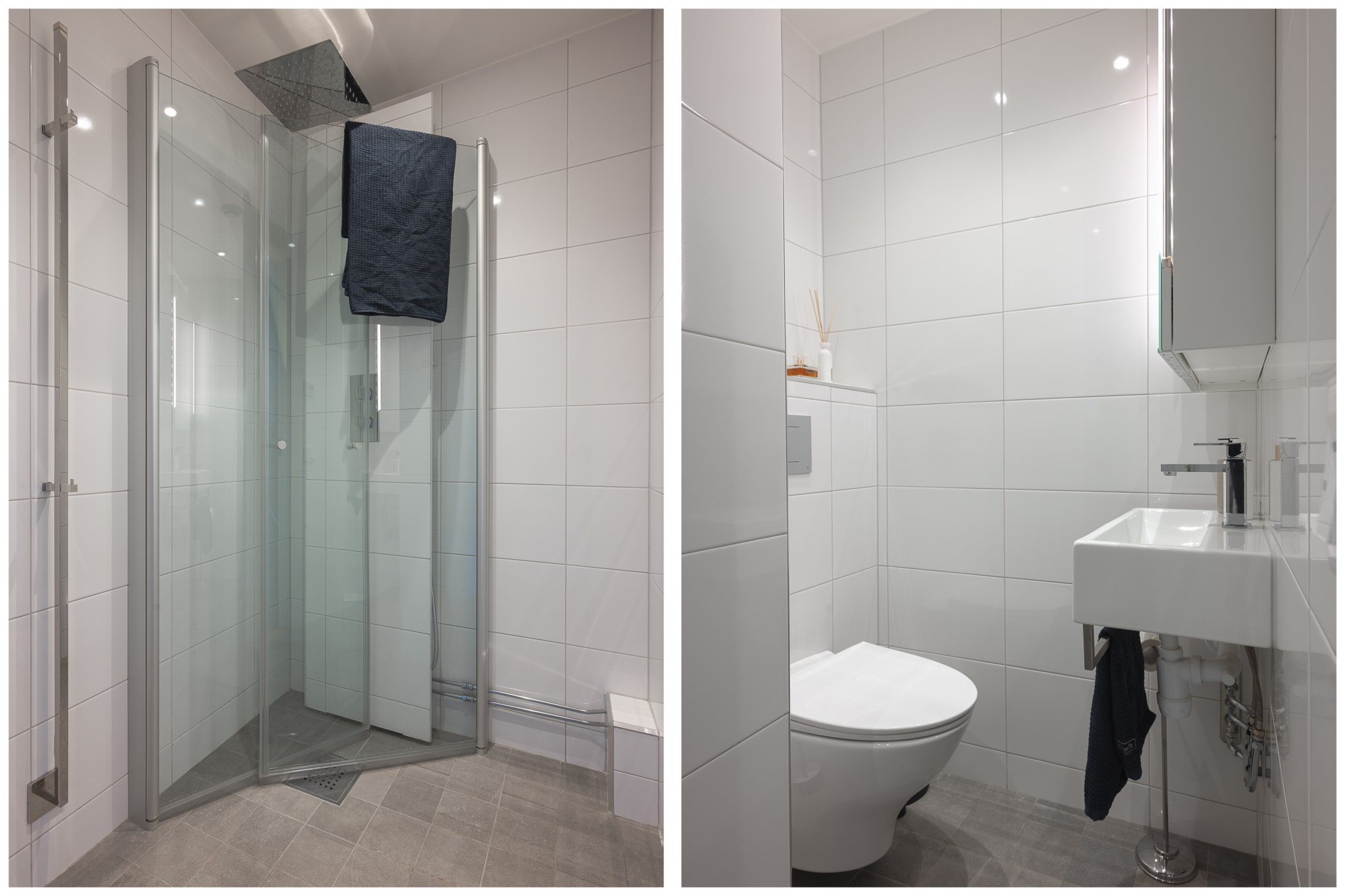 Helkaklad wc/dusch inredd med wc, handfat, spegelskåp samt takdusch med infällbara duschväggar i klarglas och dolda hyllplan som ger en lyxig känsla.