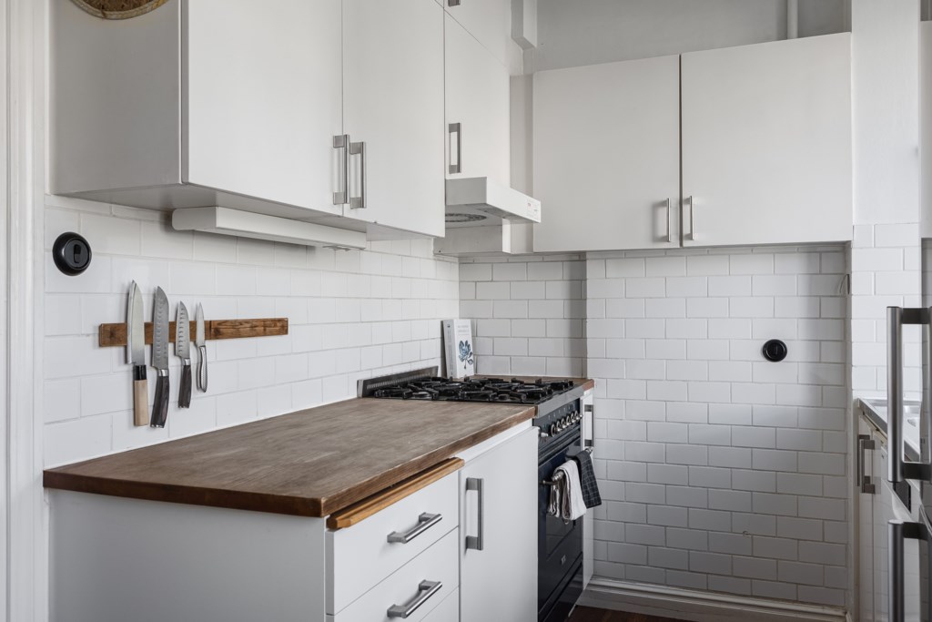 Kökets halvöppna planlösning mot vardagsrummet skapar en social och inbjudande atmosfär. Även här finns två stora fönsterpartier som tillför köket med naturligt dagsljus och ger en känsla av rymd. Köket har ljust målade väggar tillsammans med ett matchande parkettgolv. Köksskåpen har släta luckor och rymmer gott om förvaring. På arbetsytorna ligger en bänkskiva i trä och stänkskyddet är klätt i vitt kakel. Köket är utrustat med kyl/frys, fläkt, gasspis, ugn och diskmaskin.