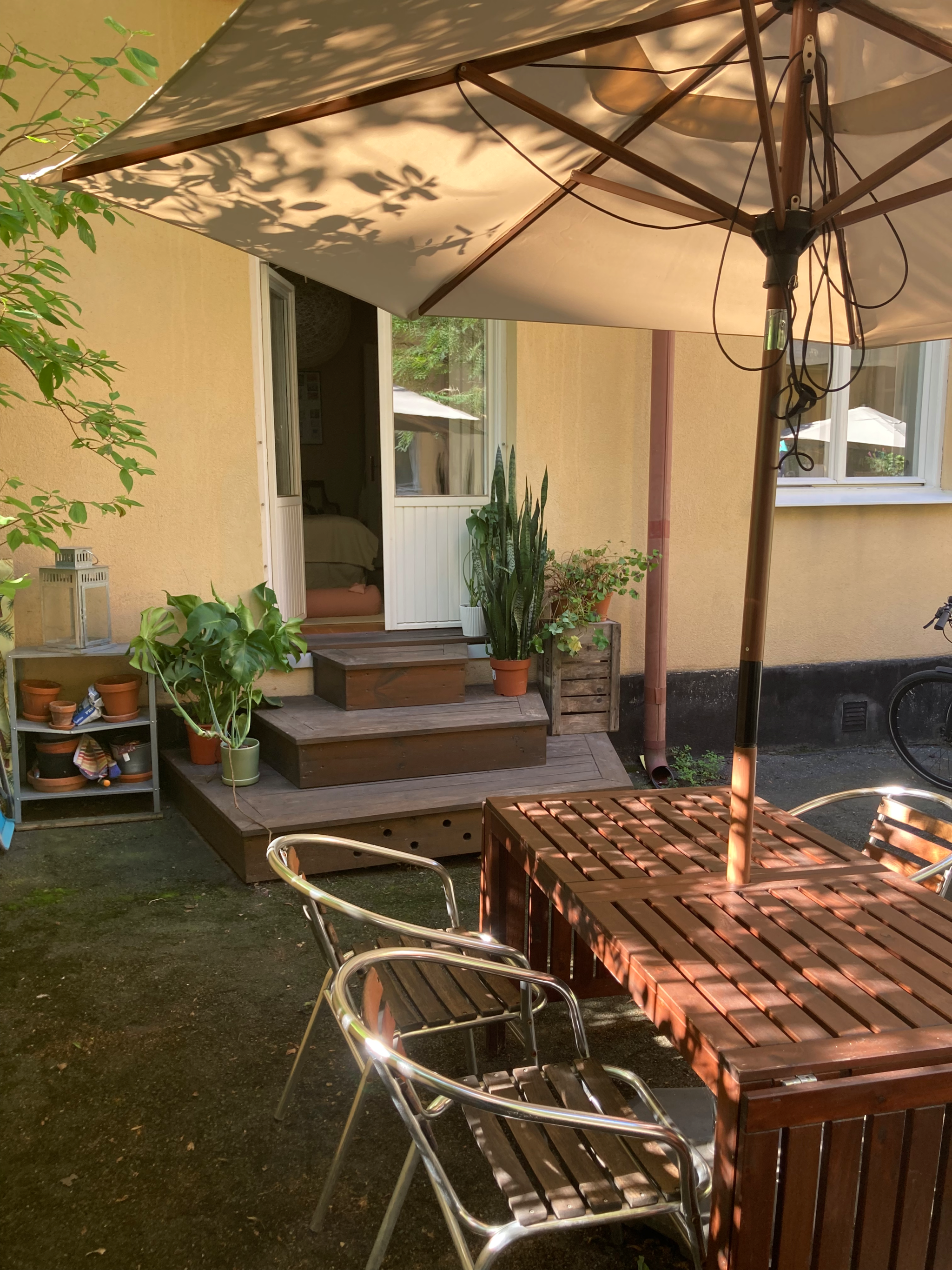 Lummig uteplats på med plats för växter samt sittyta.