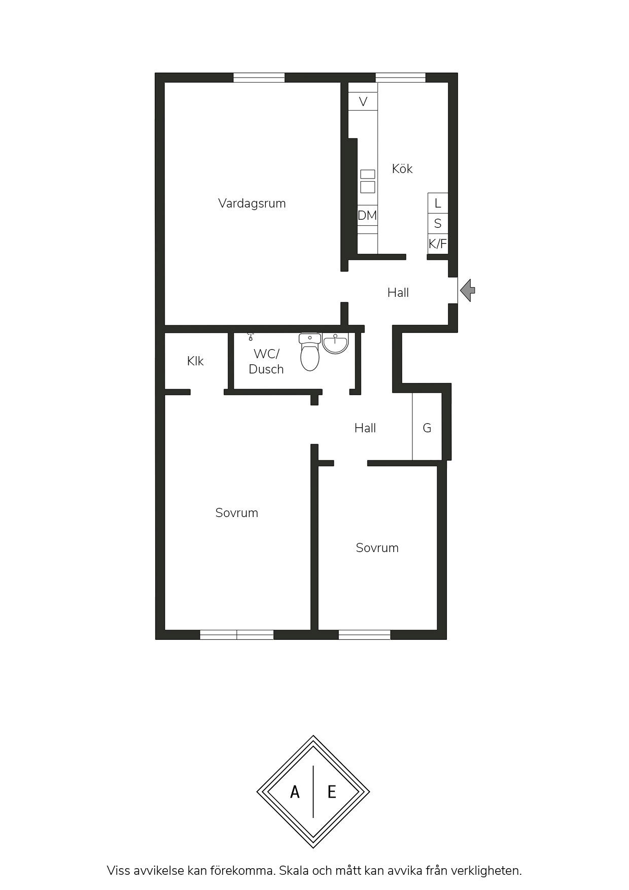 Välkomnande hall med plats för avhängning direkt vid entrén. Härifrån når ni bostadens kök och vardagsrum samt den inre hallen som leder vidare till sovrummen och badrummet.