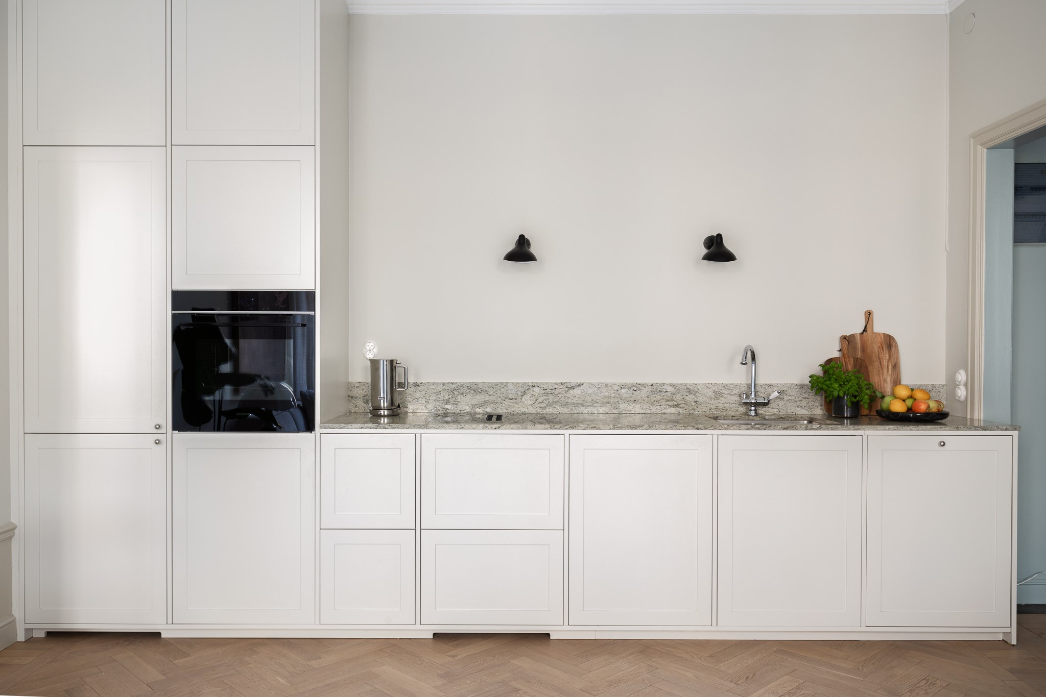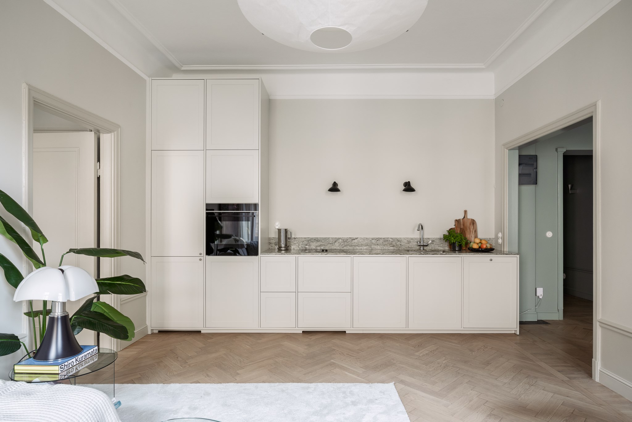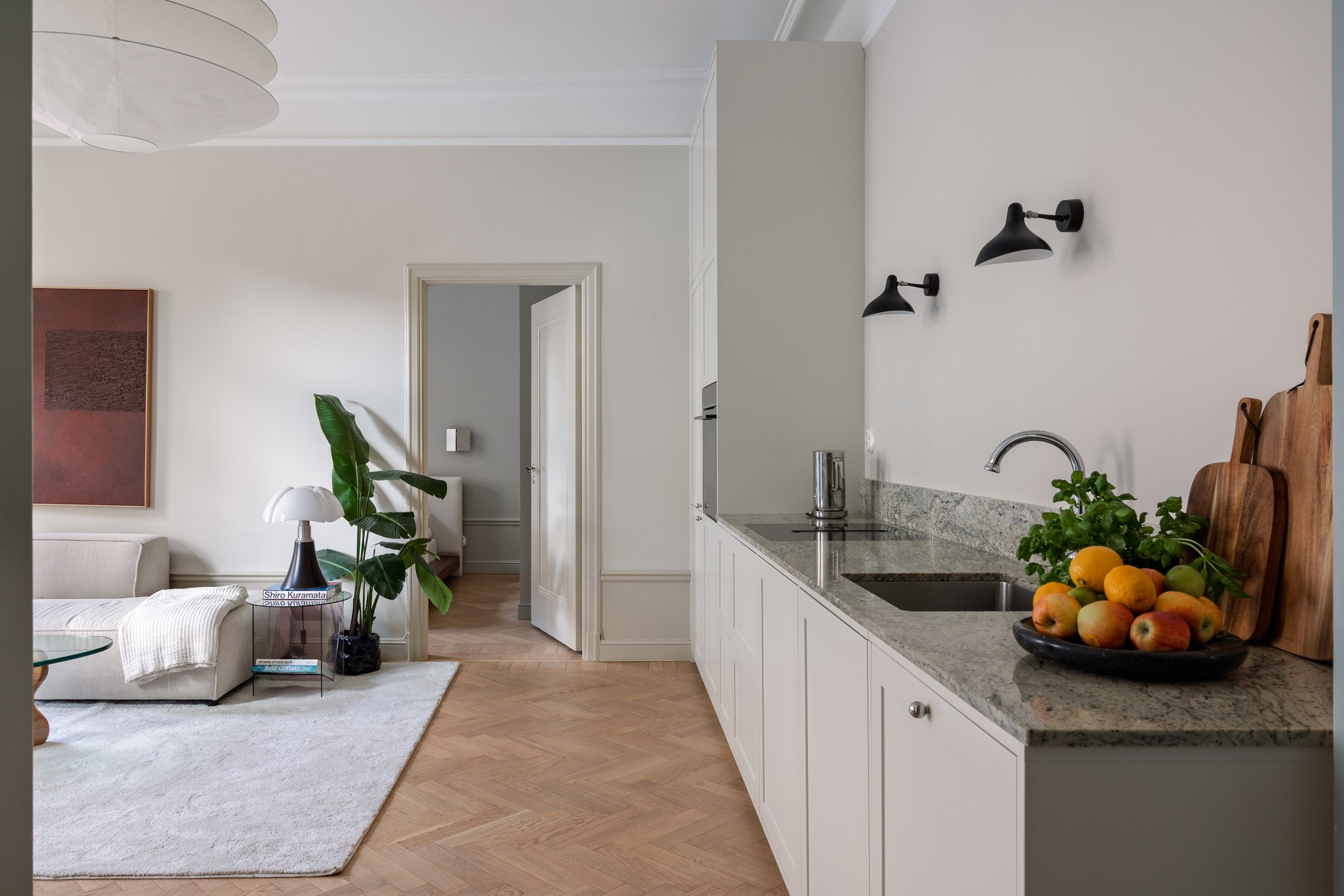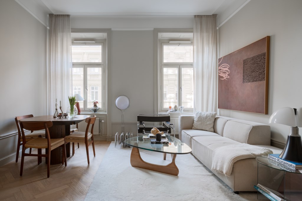 Hela lägenheten har genomgått en omfattande renovering under 2025 där material och detaljer har valts med omsorg. Köket är stilrent utformat med exklusiva materialval såsom stenskivor och italienska armaturer, vilket ger ett sobert och genomarbetat helhetsintryck. Här finns gott om arbetsyta och förvaring, och planlösningen gör det enkelt att samla vänner och familj runt middagsbordet.