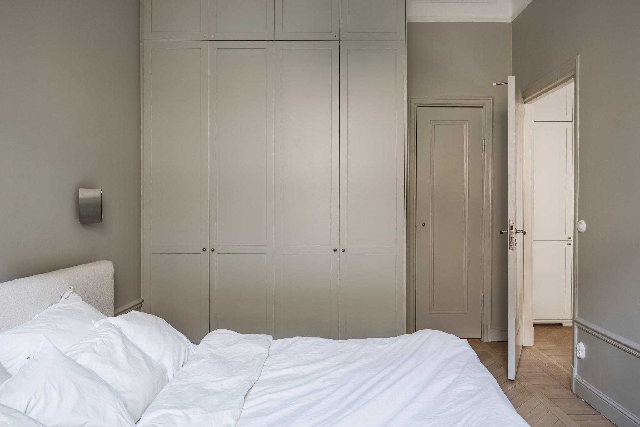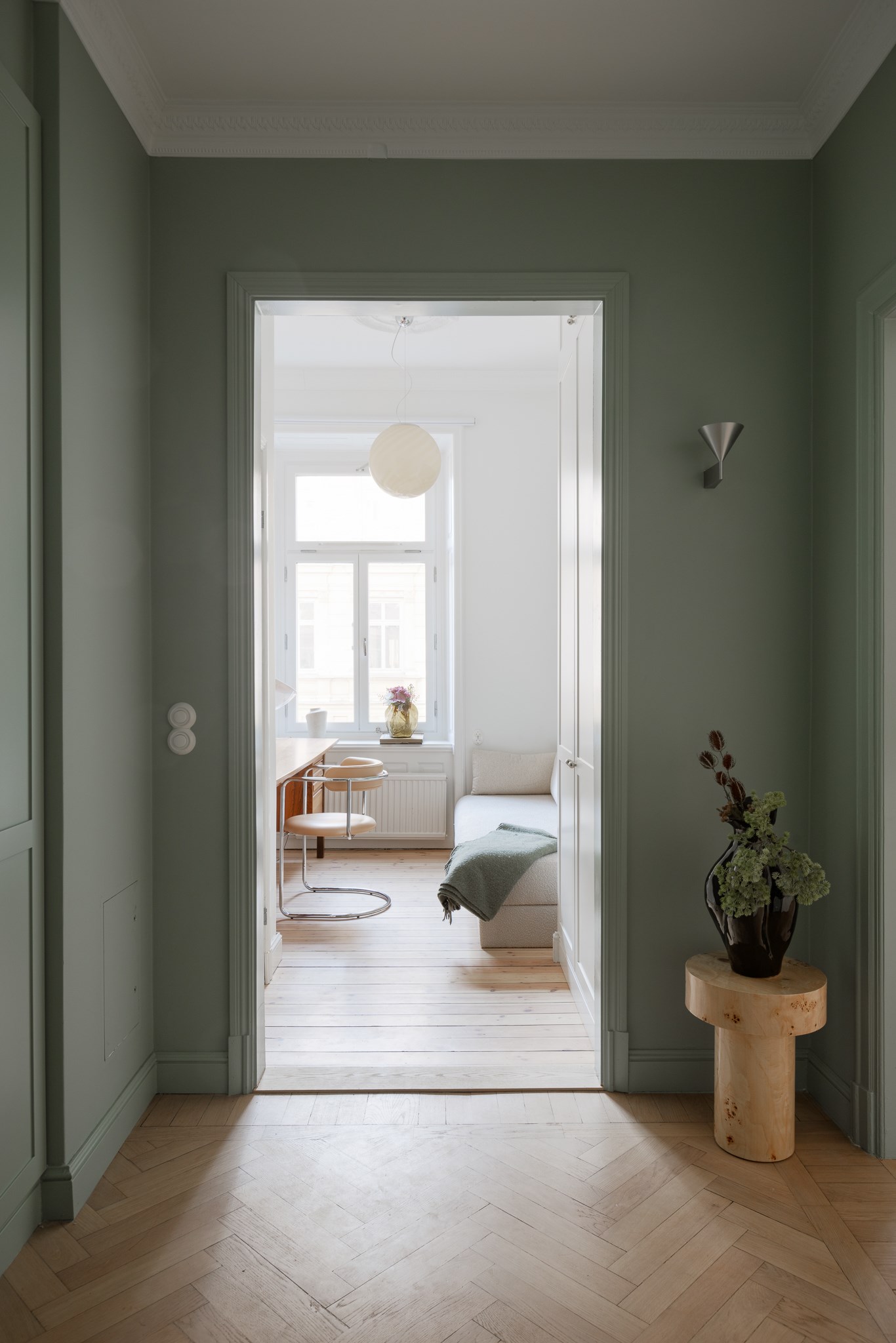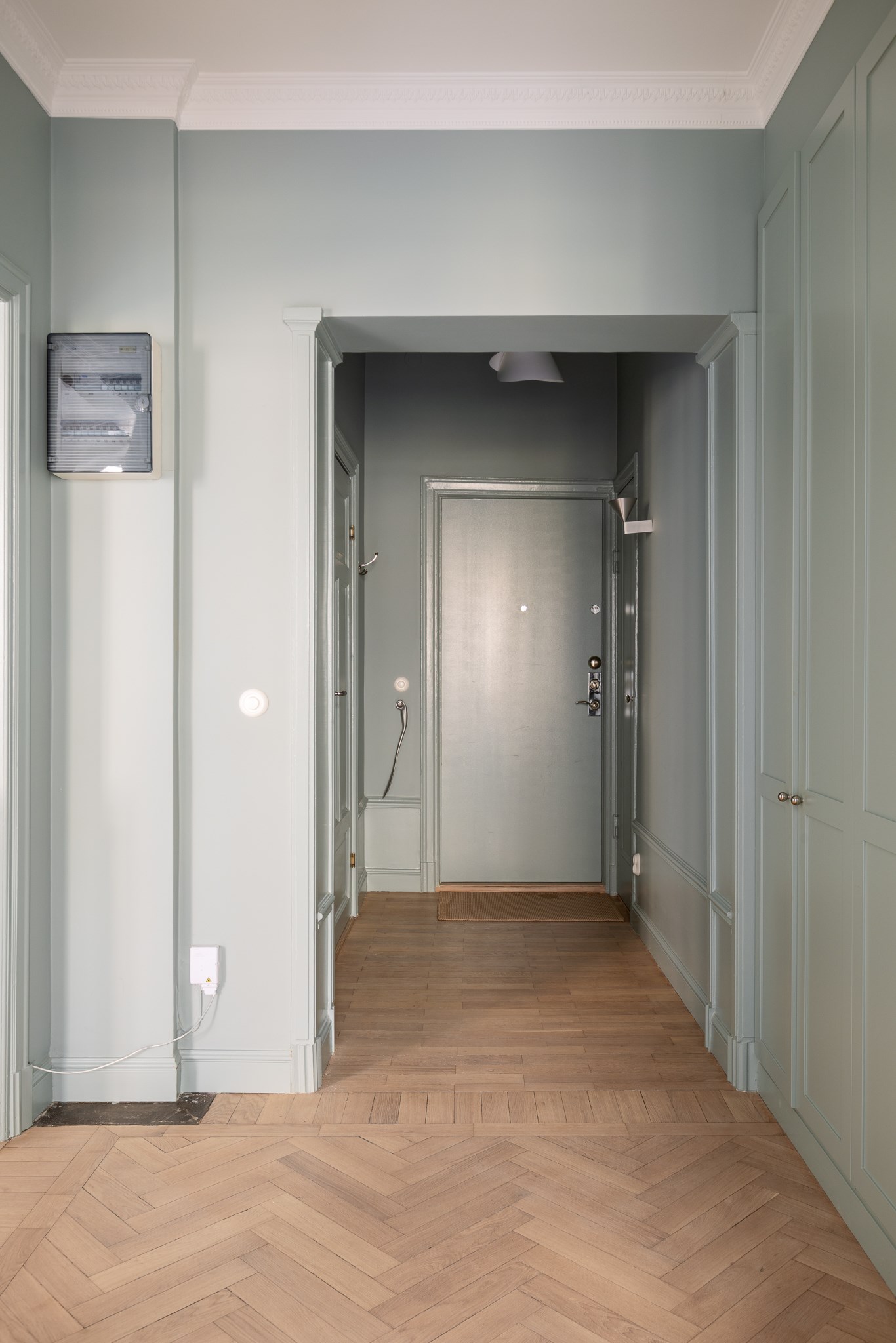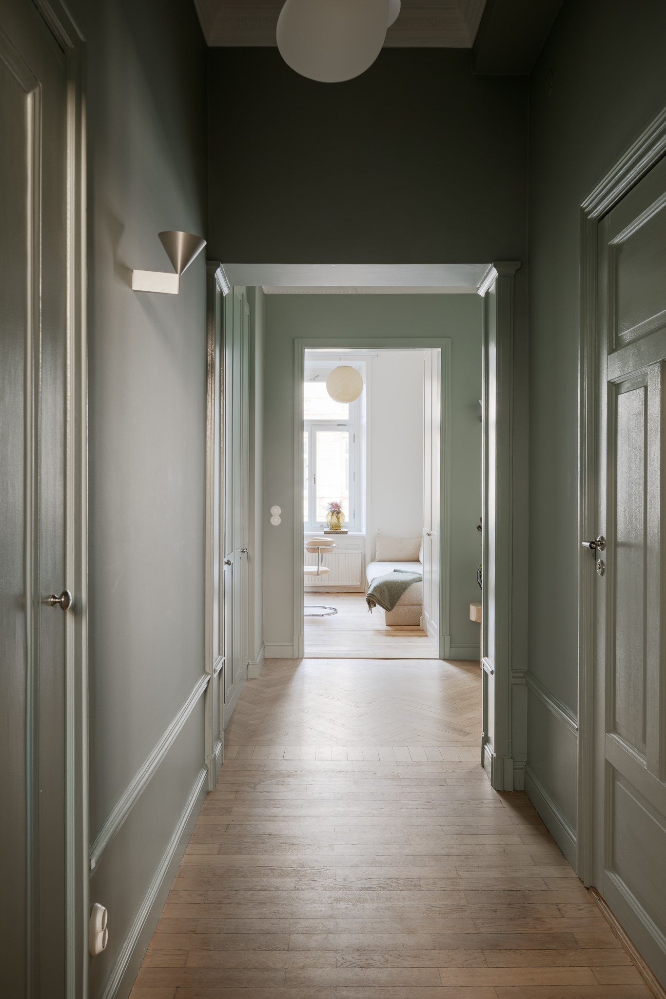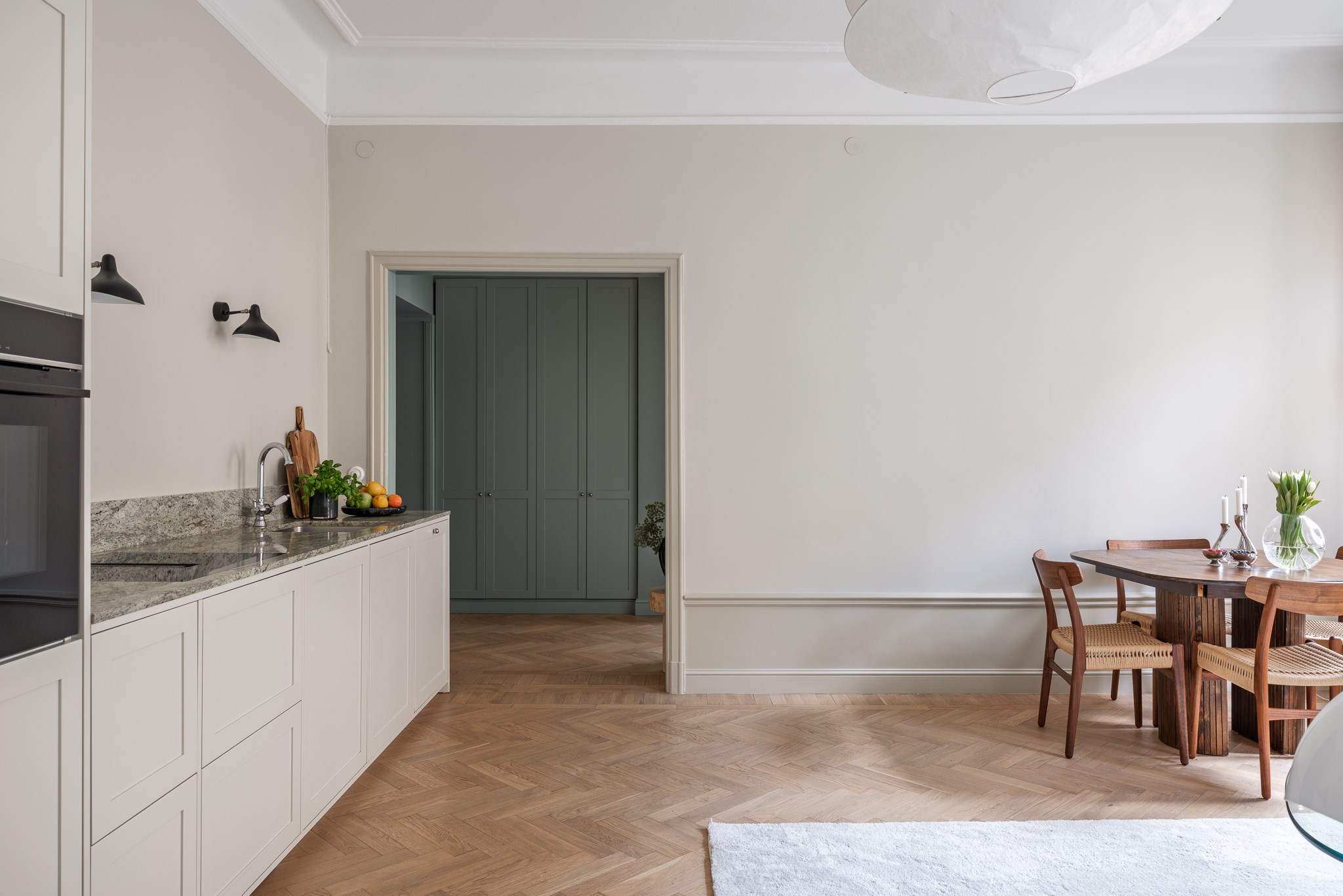 Bostaden har en generös takhöjd om cirka 3,18 meter, vilket tillsammans med stuckaturer, takrosetter och höga golvsocklar skapar en luftig och elegant atmosfär. Fiskbensparkett löper genom rummen och förstärker det klassiska uttrycket, medan platsbyggd förvaring har integrerats för att optimera både funktion och estetik.