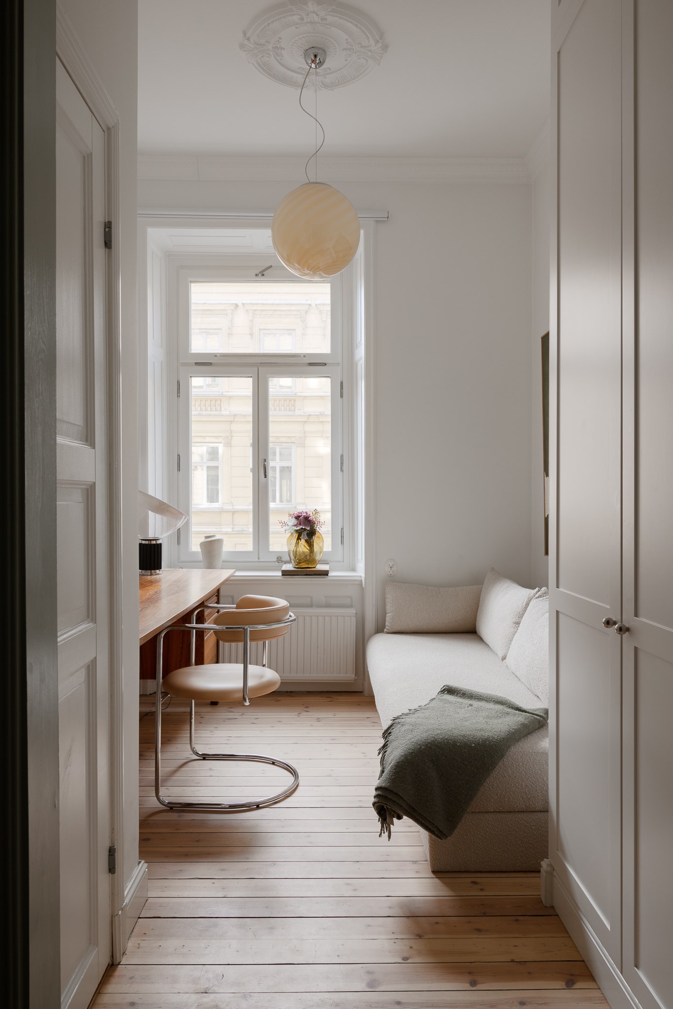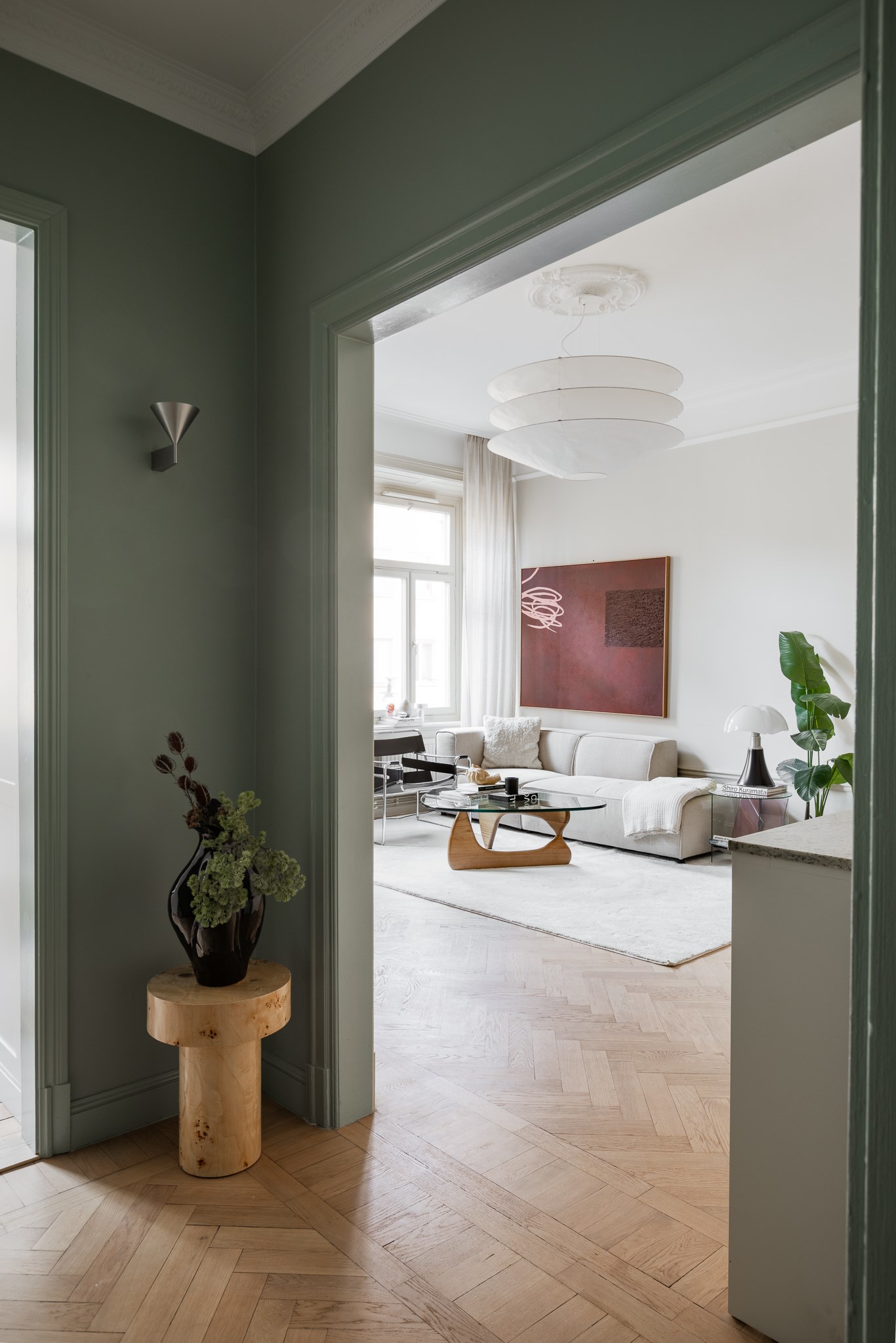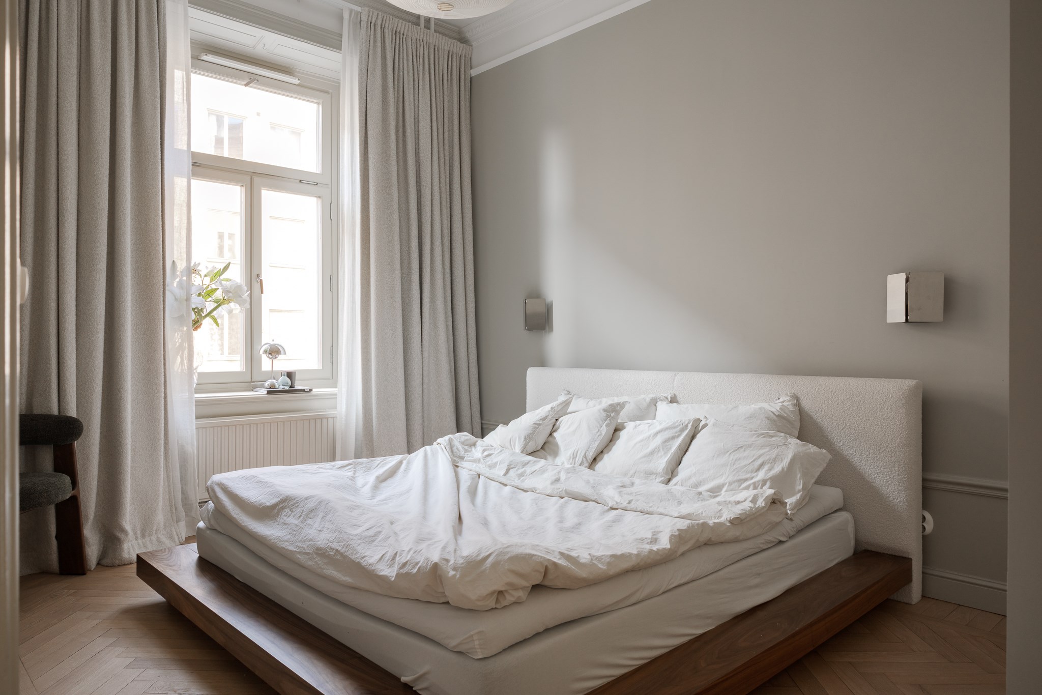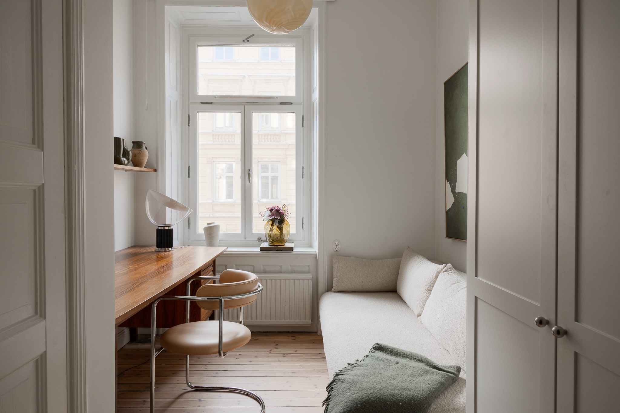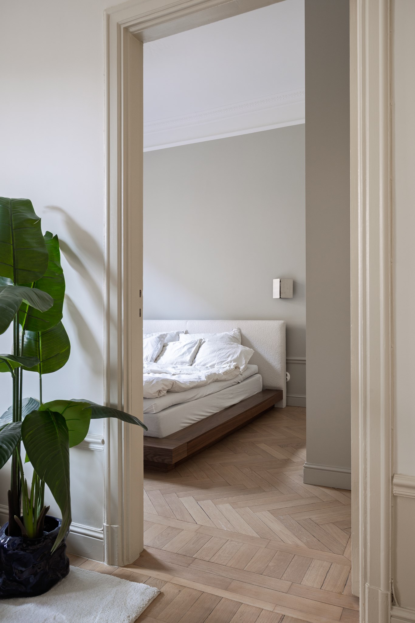 Bostaden har en generös takhöjd om cirka 3,18 meter, vilket tillsammans med stuckaturer, takrosetter och höga golvsocklar skapar en luftig och elegant atmosfär. Fiskbensparkett löper genom rummen och förstärker det klassiska uttrycket, medan platsbyggd förvaring har integrerats för att optimera både funktion och estetik.