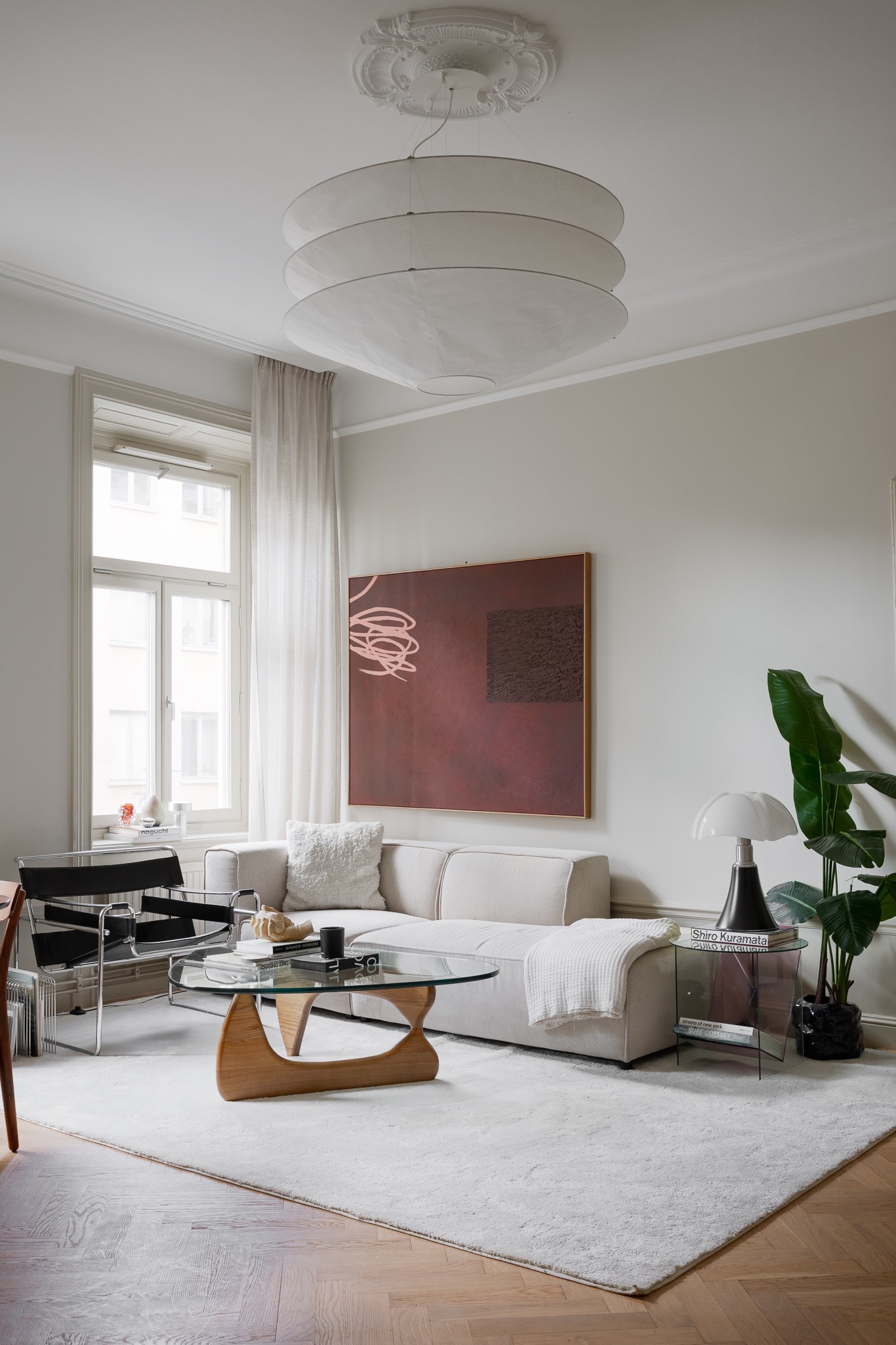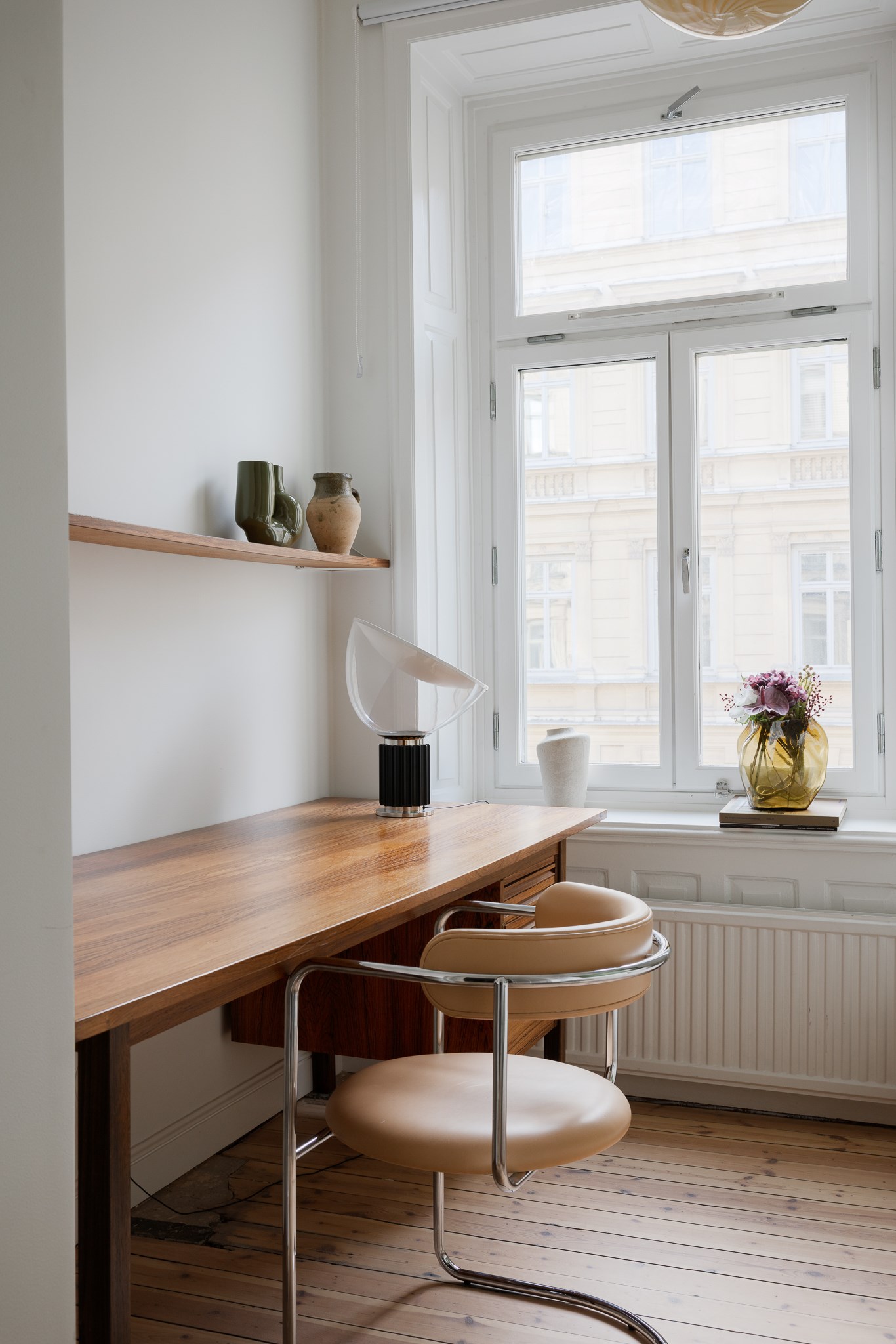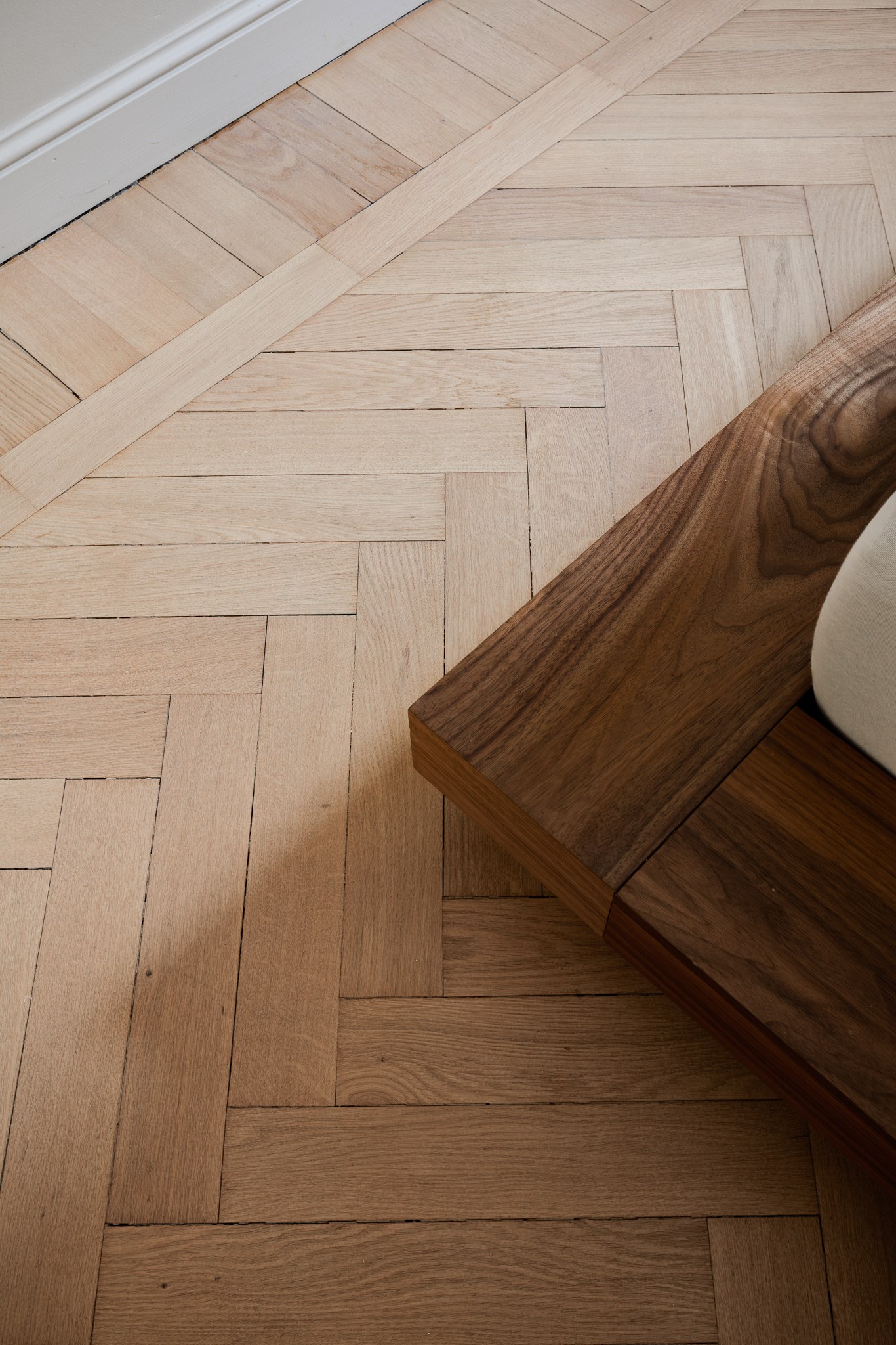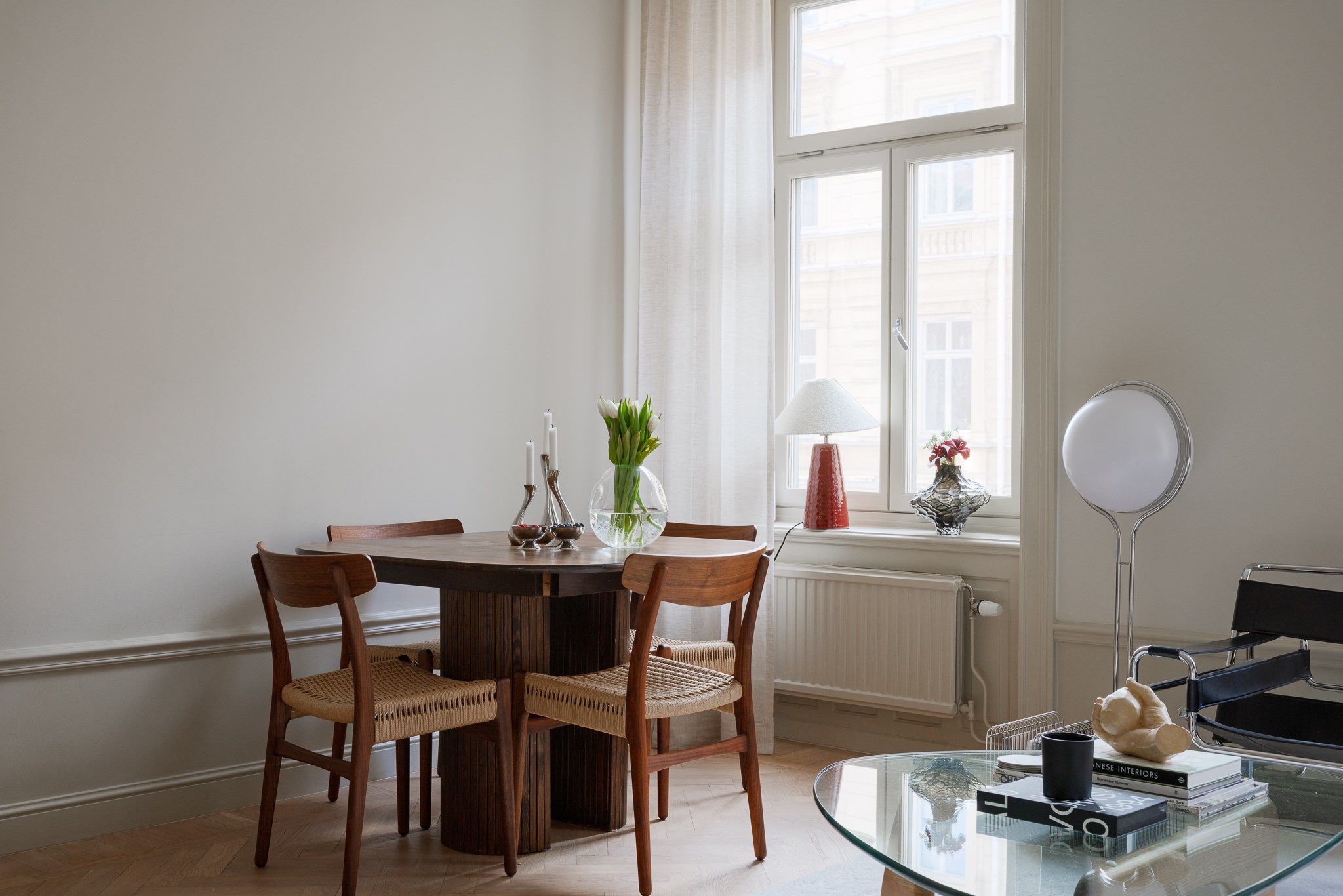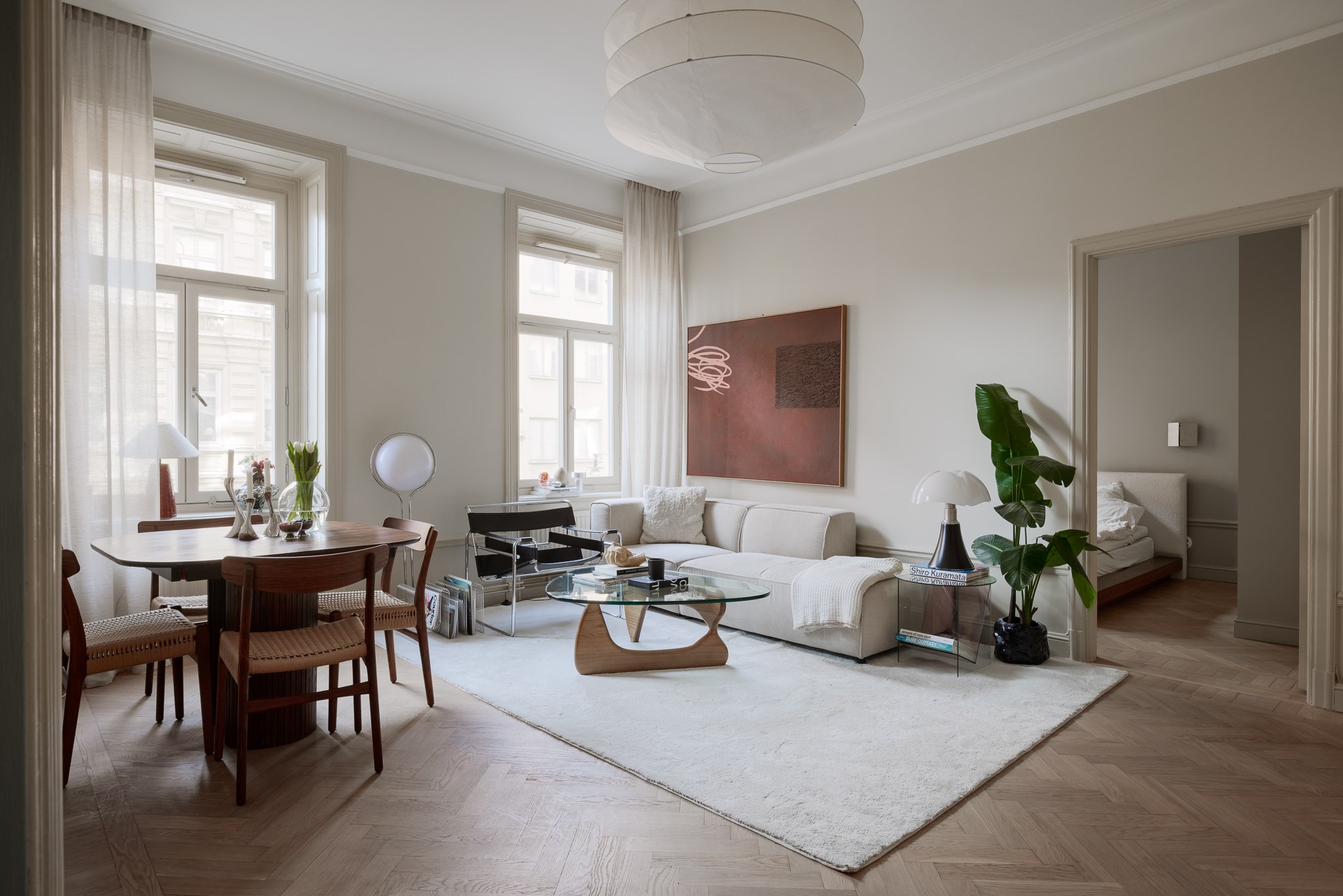 Bostaden har en generös takhöjd om cirka 3,18 meter, vilket tillsammans med stuckaturer, takrosetter och höga golvsocklar skapar en luftig och elegant atmosfär. Fiskbensparkett löper genom rummen och förstärker det klassiska uttrycket, medan platsbyggd förvaring har integrerats för att optimera både funktion och estetik.