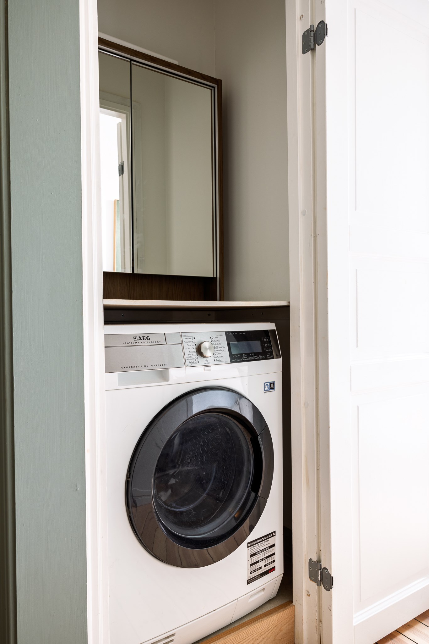 Badrummet är stilfullt renoverat och erbjuder golvvärme. I anslutning finns ett separat våtrum med tvättmaskin och torktumlare, utfört enligt gällande standard och godkända installationer, vilket ger både bekvämlighet och funktion i vardagen.