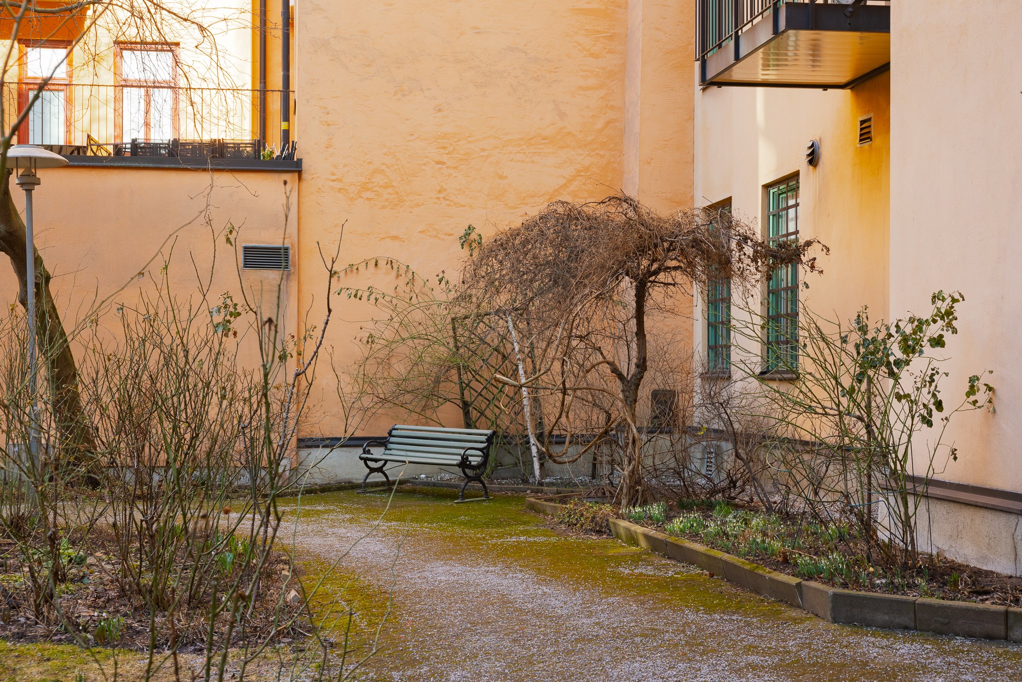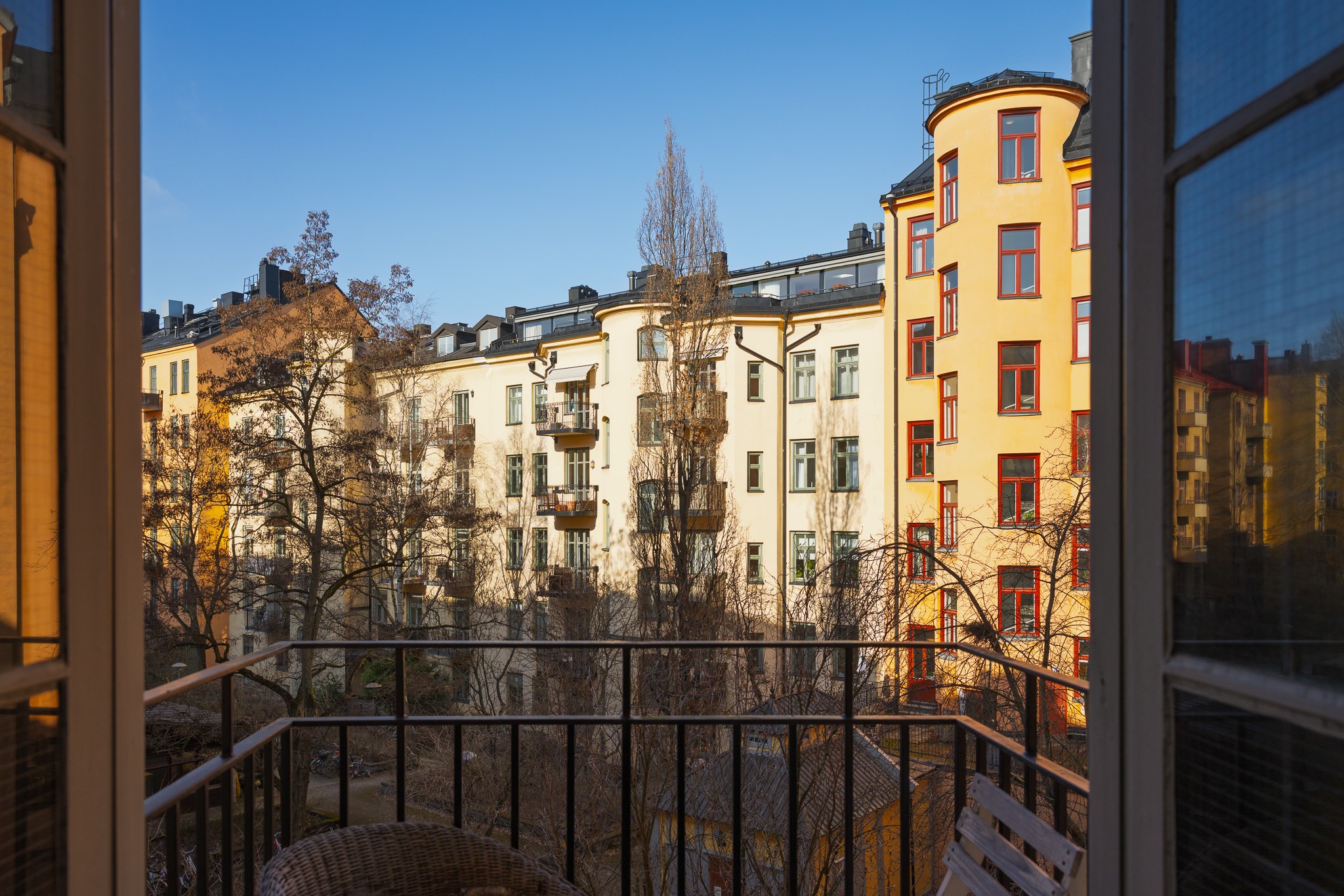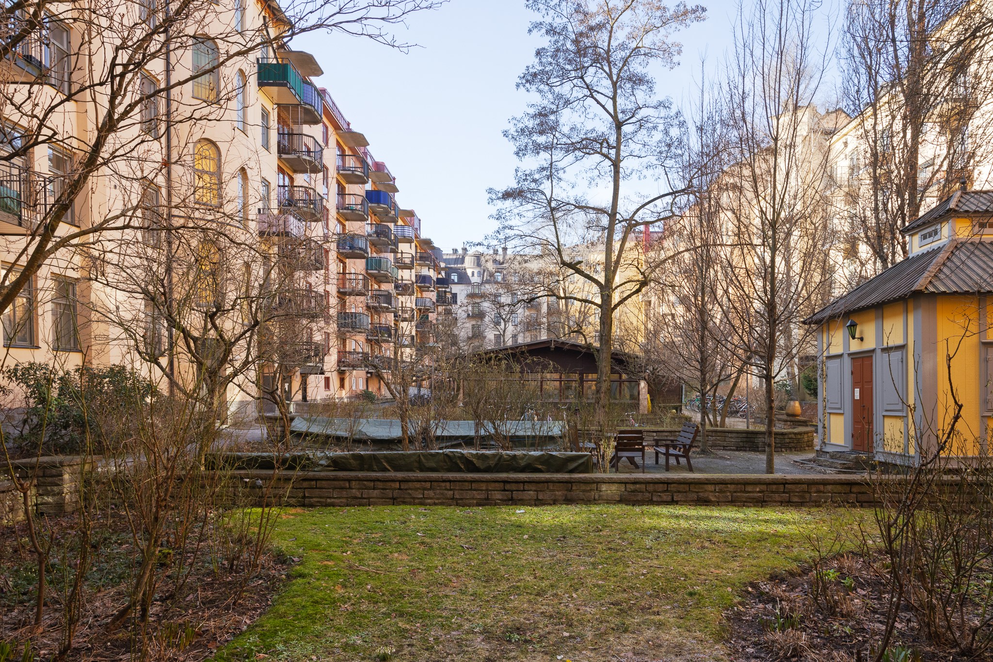 Innergården är en av föreningens verkliga tillgångar – en lummig och grön oas mitt i staden. Här finns rik växtlighet och ett charmigt lusthus som kan bokas av föreningens medlemmar för middagar och sammankomster. Till bostaden hör även ett generöst förråd.