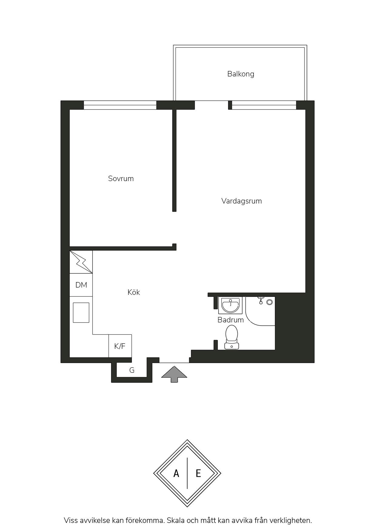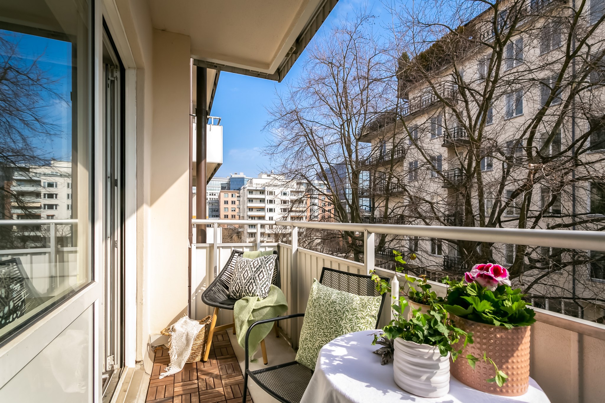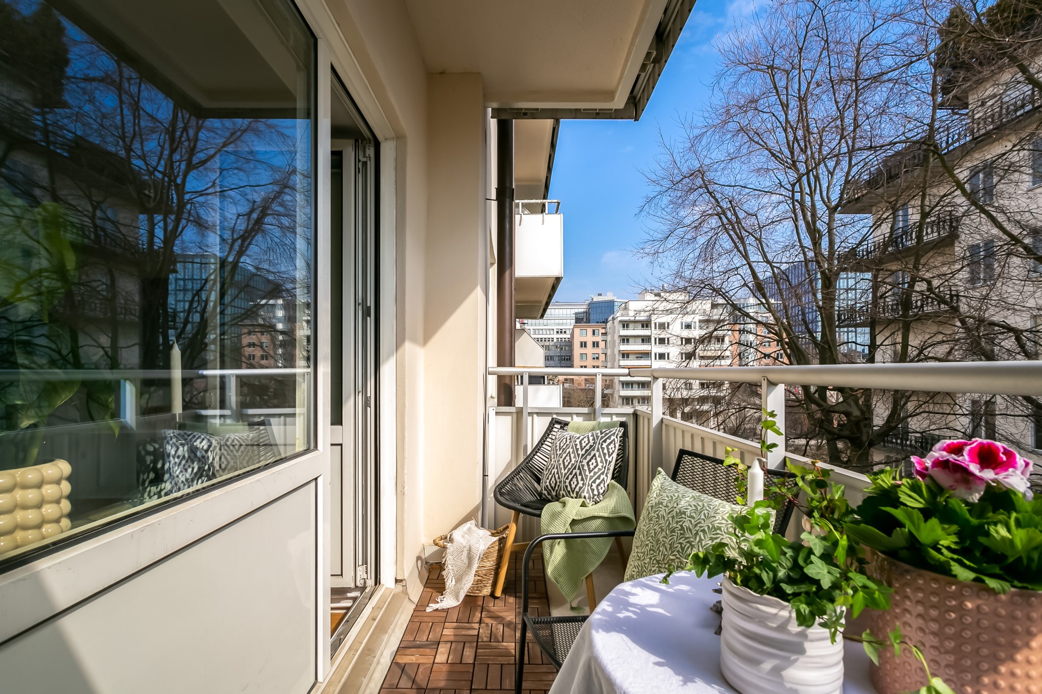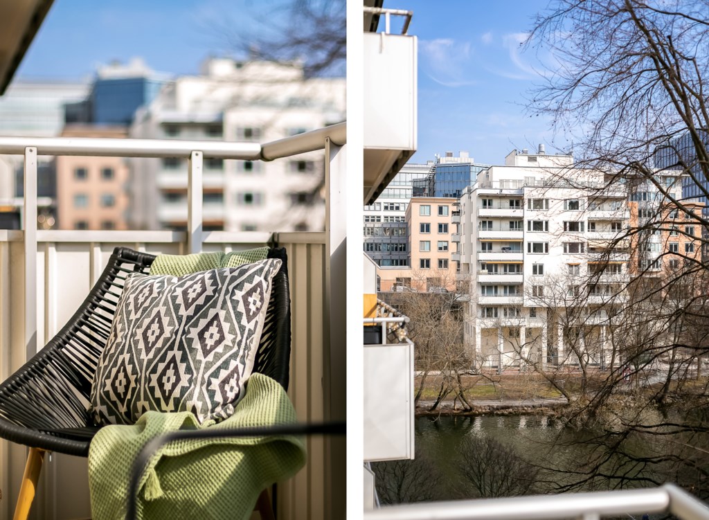 Till lägenheten hör en balkong. Här finns plats för bord och stolar, planteringar samt övrigt önskat möblemang.