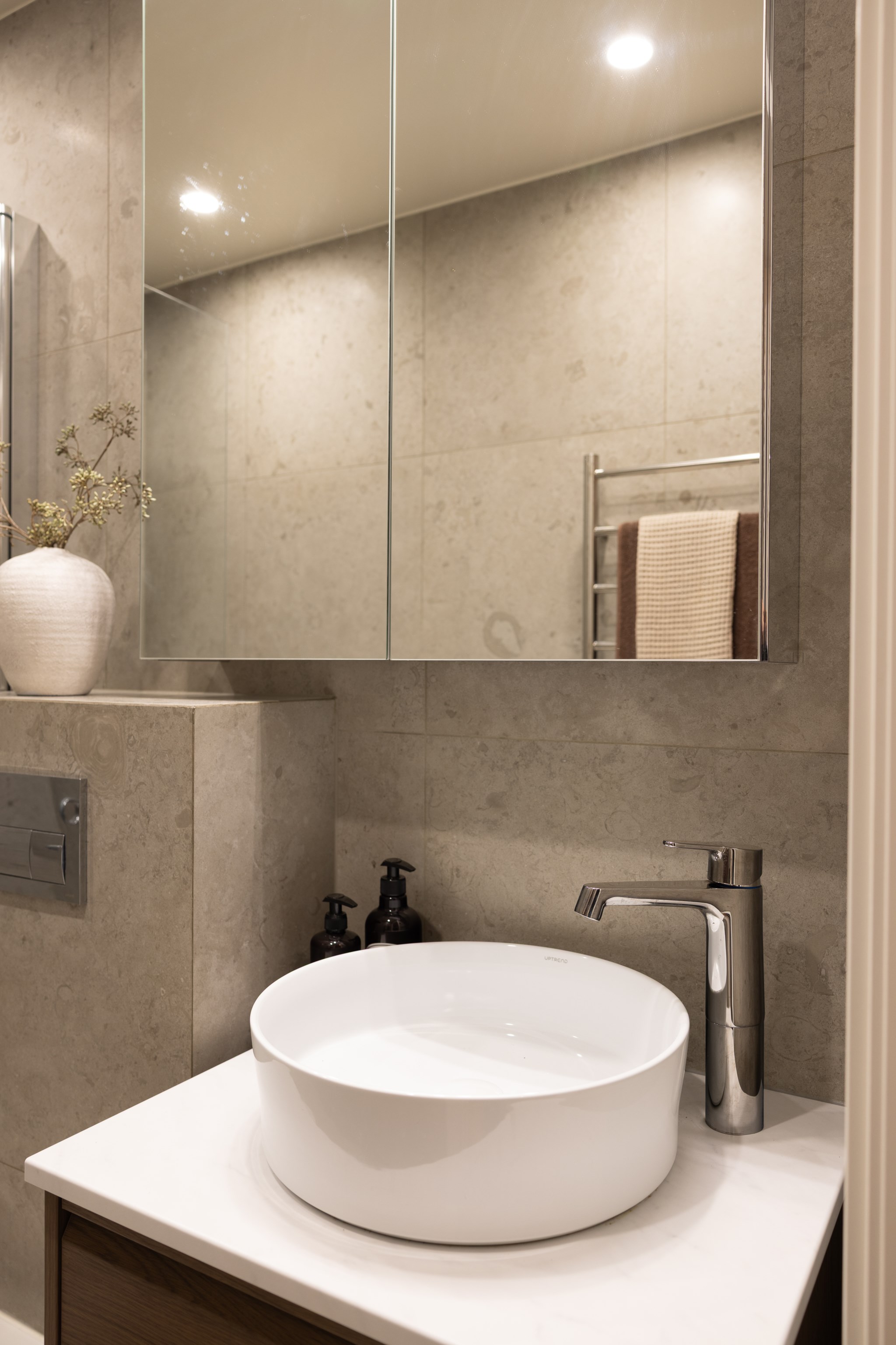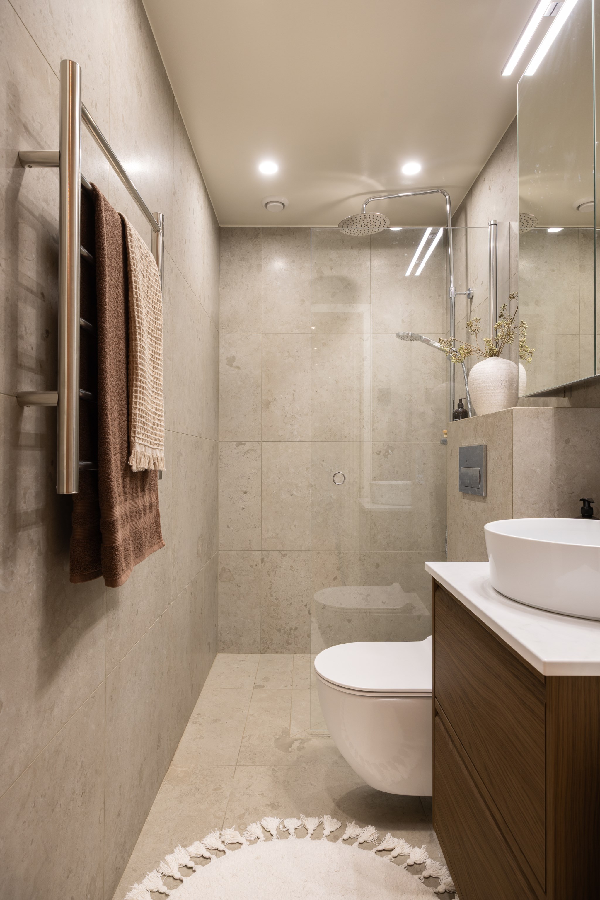 Rymligt badrum med moderna materialval bestående av kakel och klinker grå/beige nyans samt inredning i mörk träslag. Badrummet är utrustat med golvvärme, vägghängd WC, handfat med kommod, spegelskåp med belysning, takdusch med glasvägg samt handdukstork. Perfekt belysning via spotlights i tak.