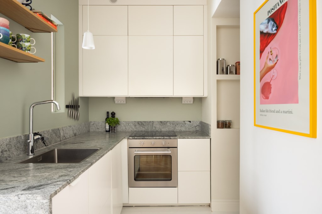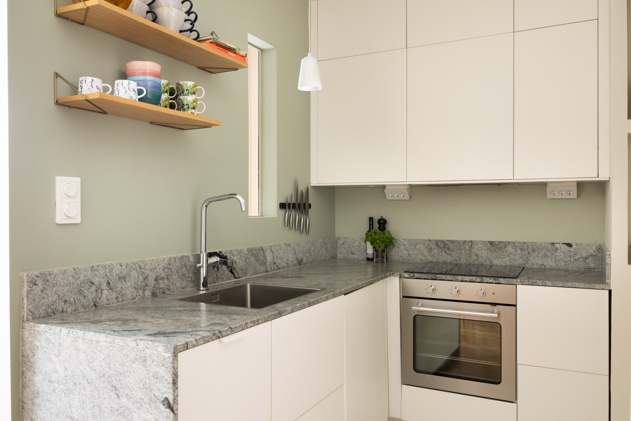 Modernt kök med smakfulla materialval bestående av köksluckor i vitt och bänkskiva i en grå nyans med stänkskydd ovan. Den maskinella utrustningen består av diskho, spis, ugn, diskmaskin. vinkyl samt kyl och frys. Tidlösa ytskikt bestående av ljusa väggar i en grön nyans och ljusa golv.