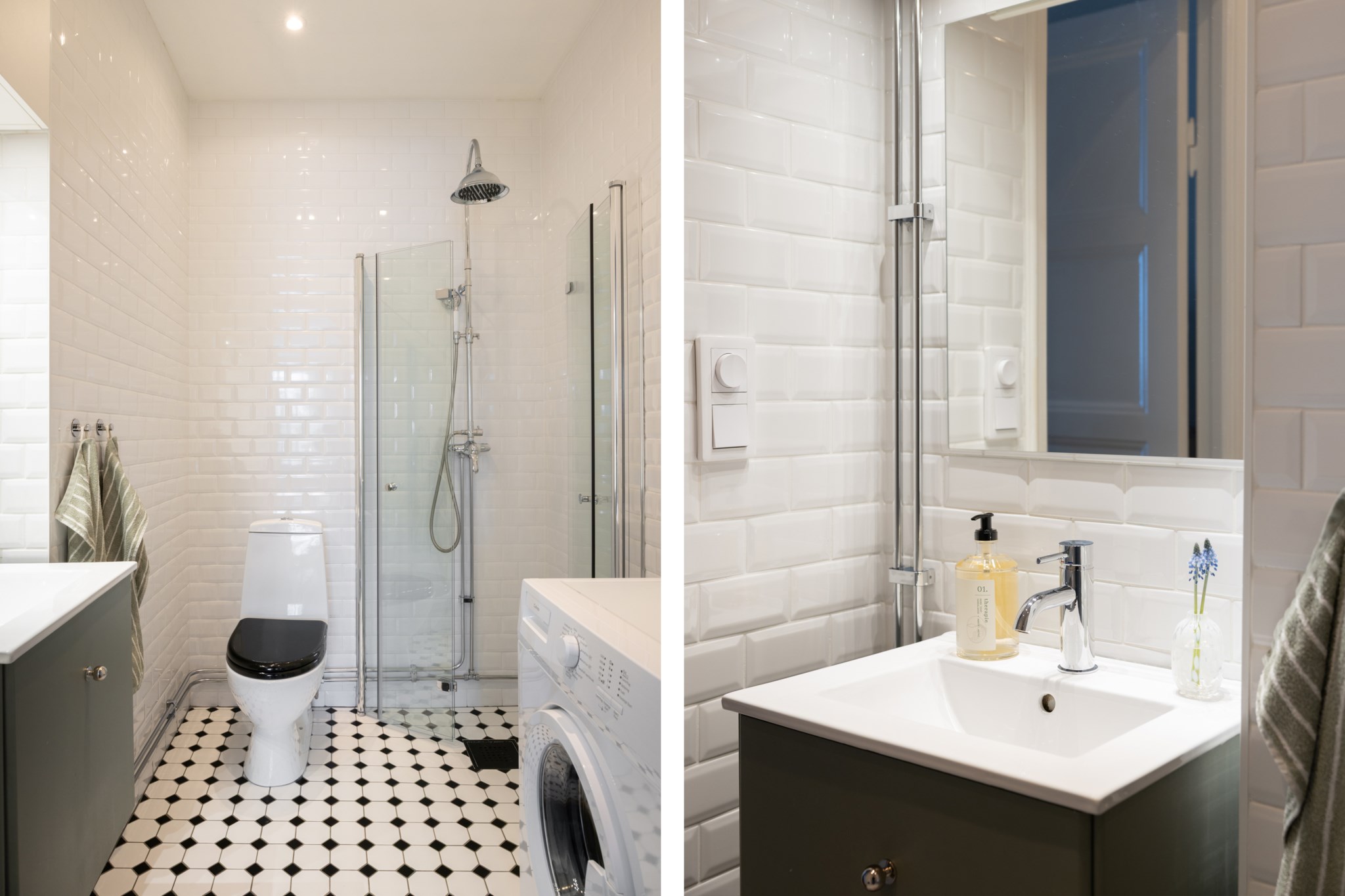 Rymligt badrum med ljust kakel och klinker. Badrummet är utrustat med WC, handdukstork, handfat ovan kommod, spegel med belysning, samt dusch med glasvägg. Extra bekvämligheter genom en tvärrmaskin.