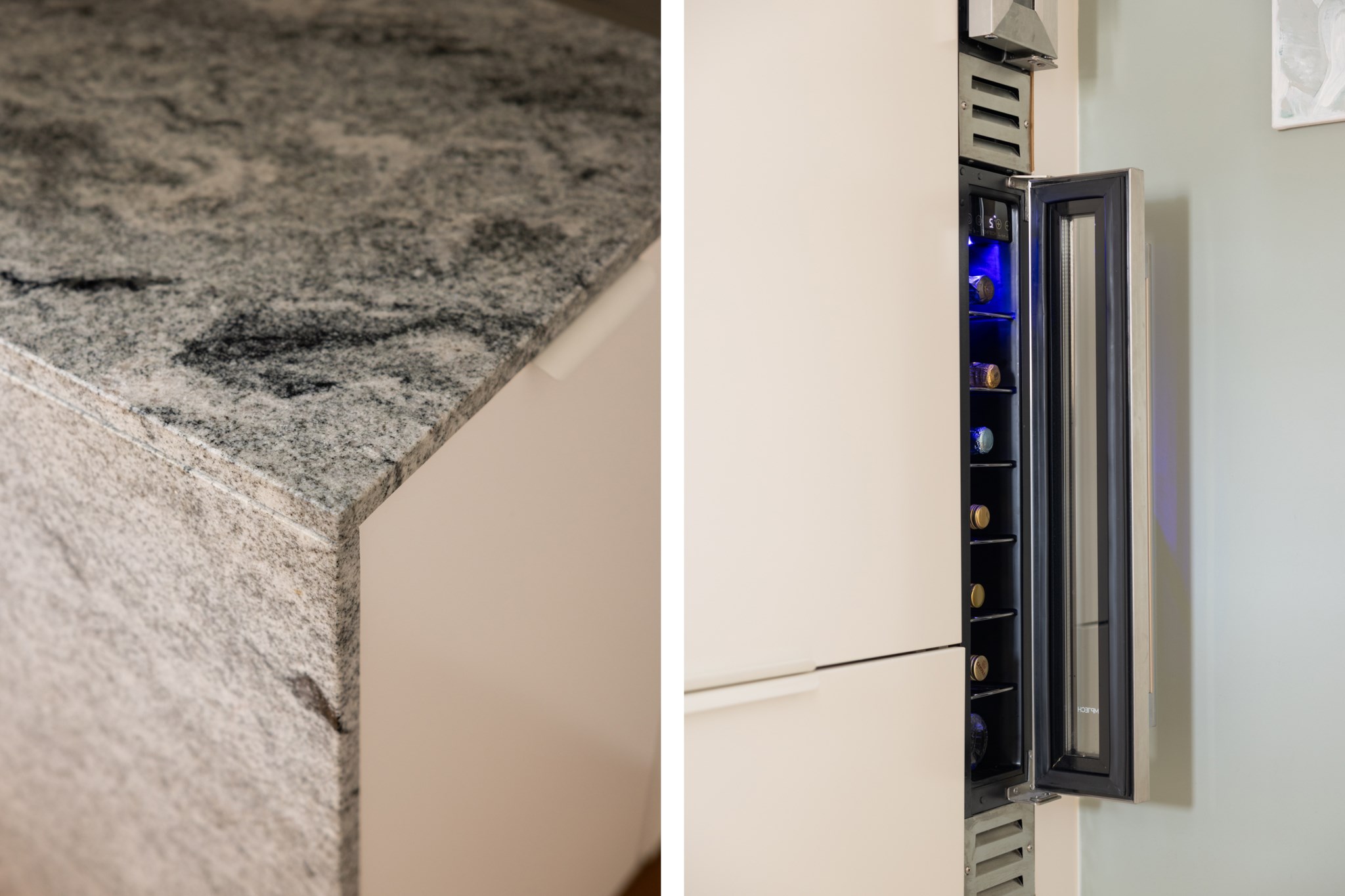 Bostaden bjuder på ett underbart kök med generösa arbetsytor i marmor, stilren design och full maskinell utrustning med bland annat diskmaskin och vinkyl. Köket ligger i öppen planlösning mot sällskapsrummet, vilket skapar en perfekt miljö för både middagar och umgänge med familjen och vännerna. Här ryms enkelt både en soffgrupp och matbord för minst sex personer.