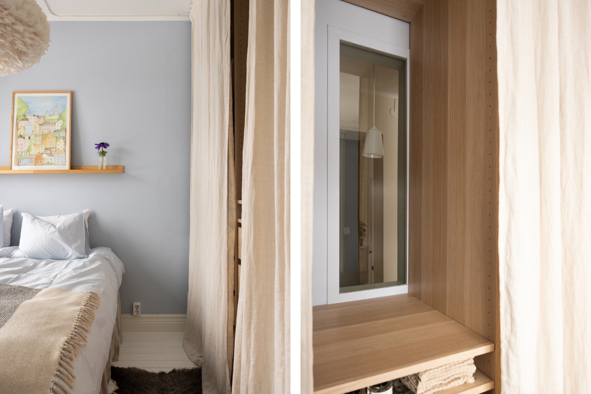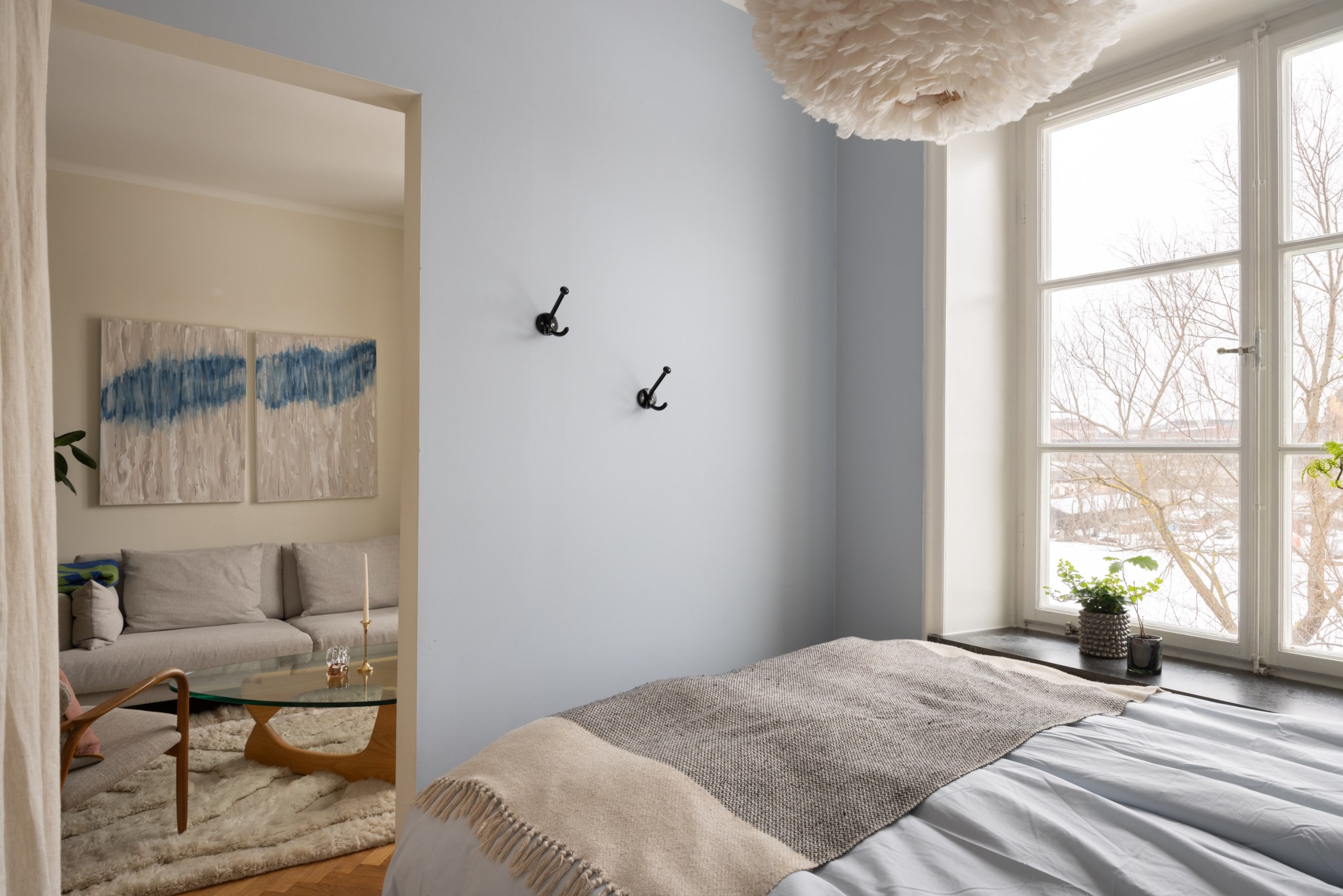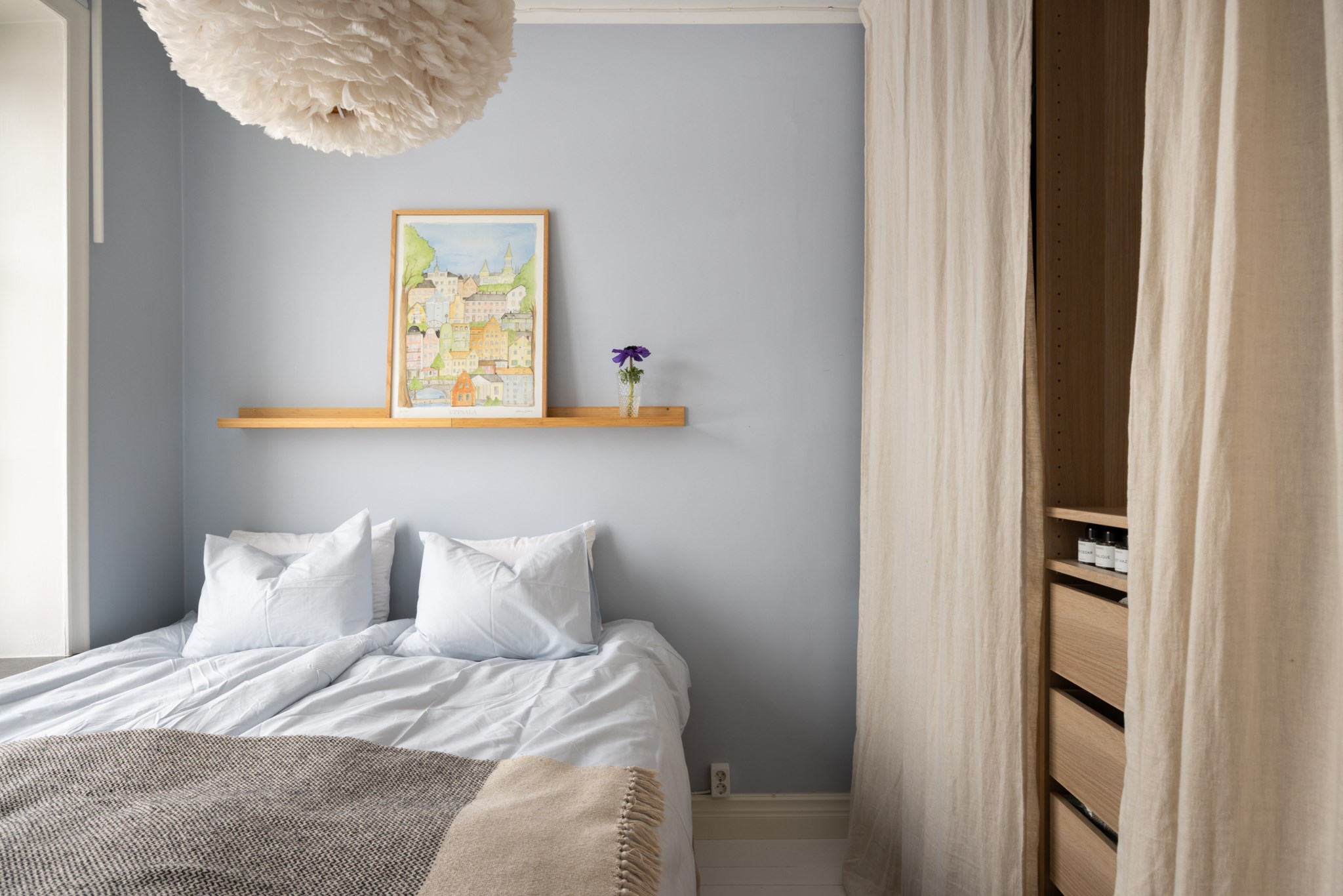 Mysigt sovrum med plats för säng och annat möblemang efter smak och behov. Gott om plats för förvaring via garderob. Ett härligt ljusinsläpp tar sig in via ett stort fönster. Tidlösa ytskikt bestående av ljusa väggar i en blå nyans och ljusa golv.