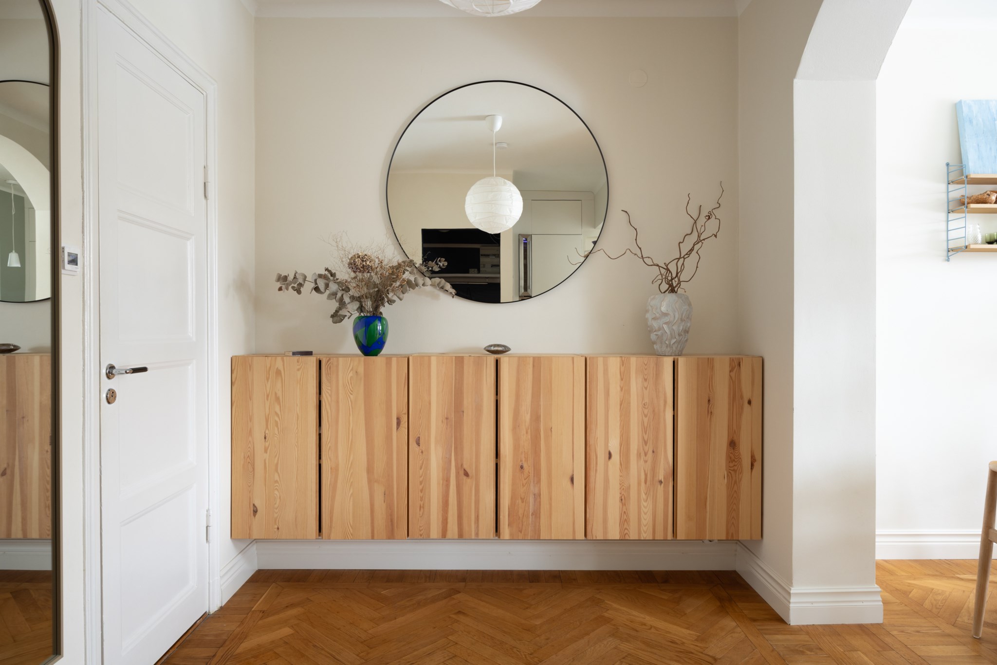 Välkomnande hall med plats för avhängning, skoställ samt mindre avlastningsmöblemang efter smak och behov. Tidlösa ytskikt bestående av mörka väggar i en grön nyans och ljusa golv.