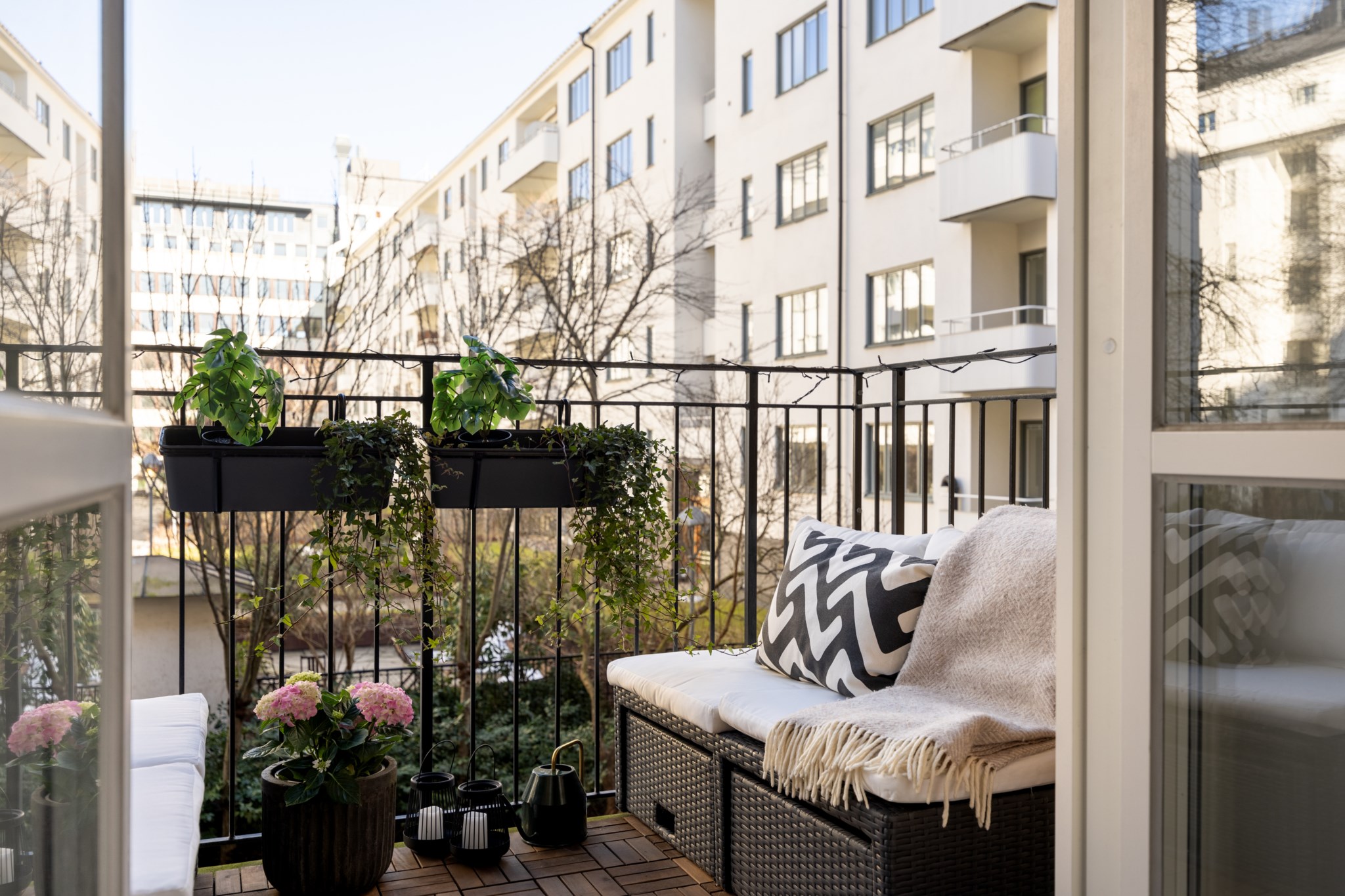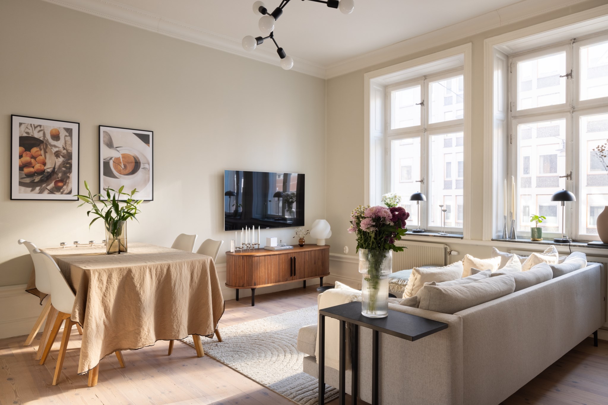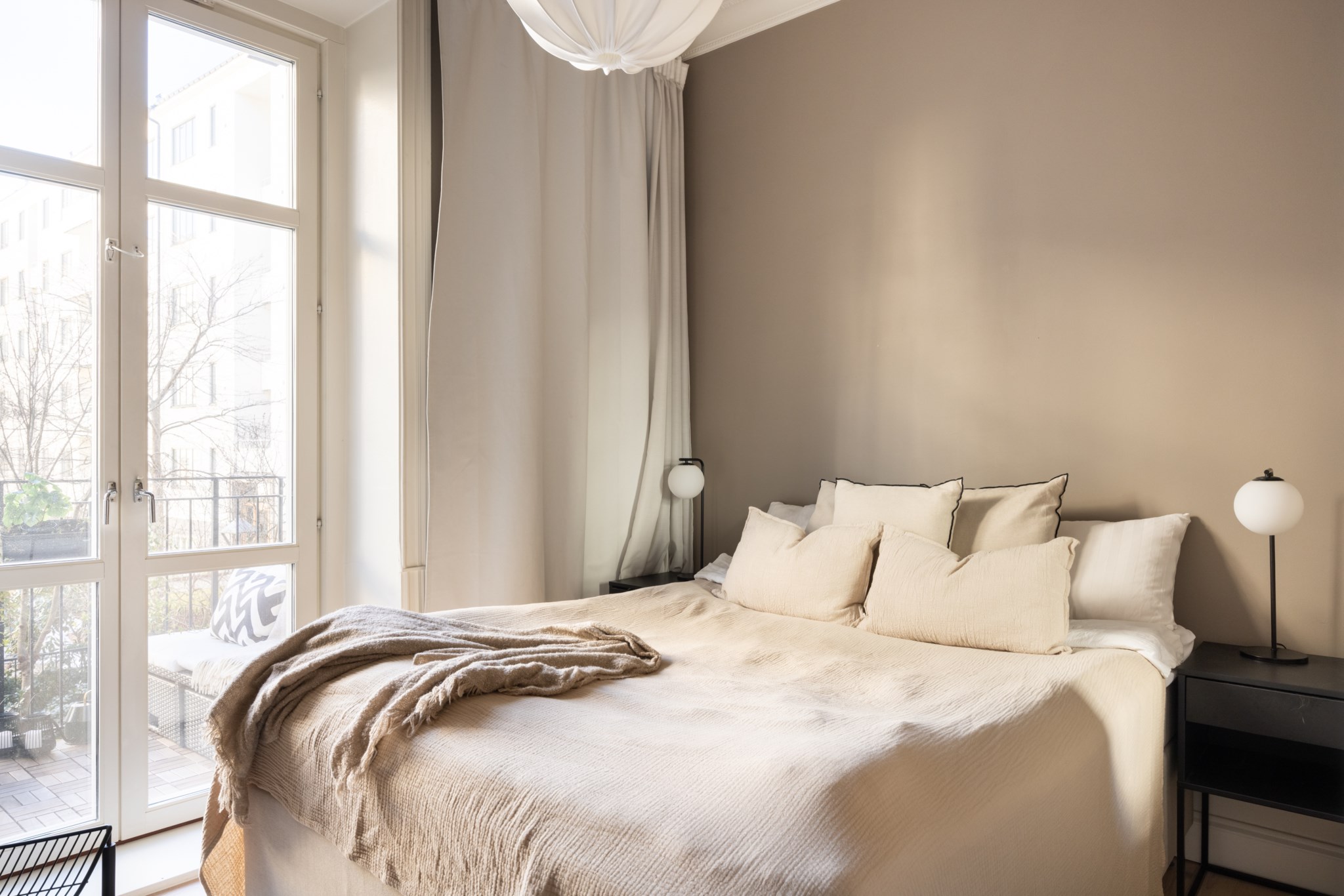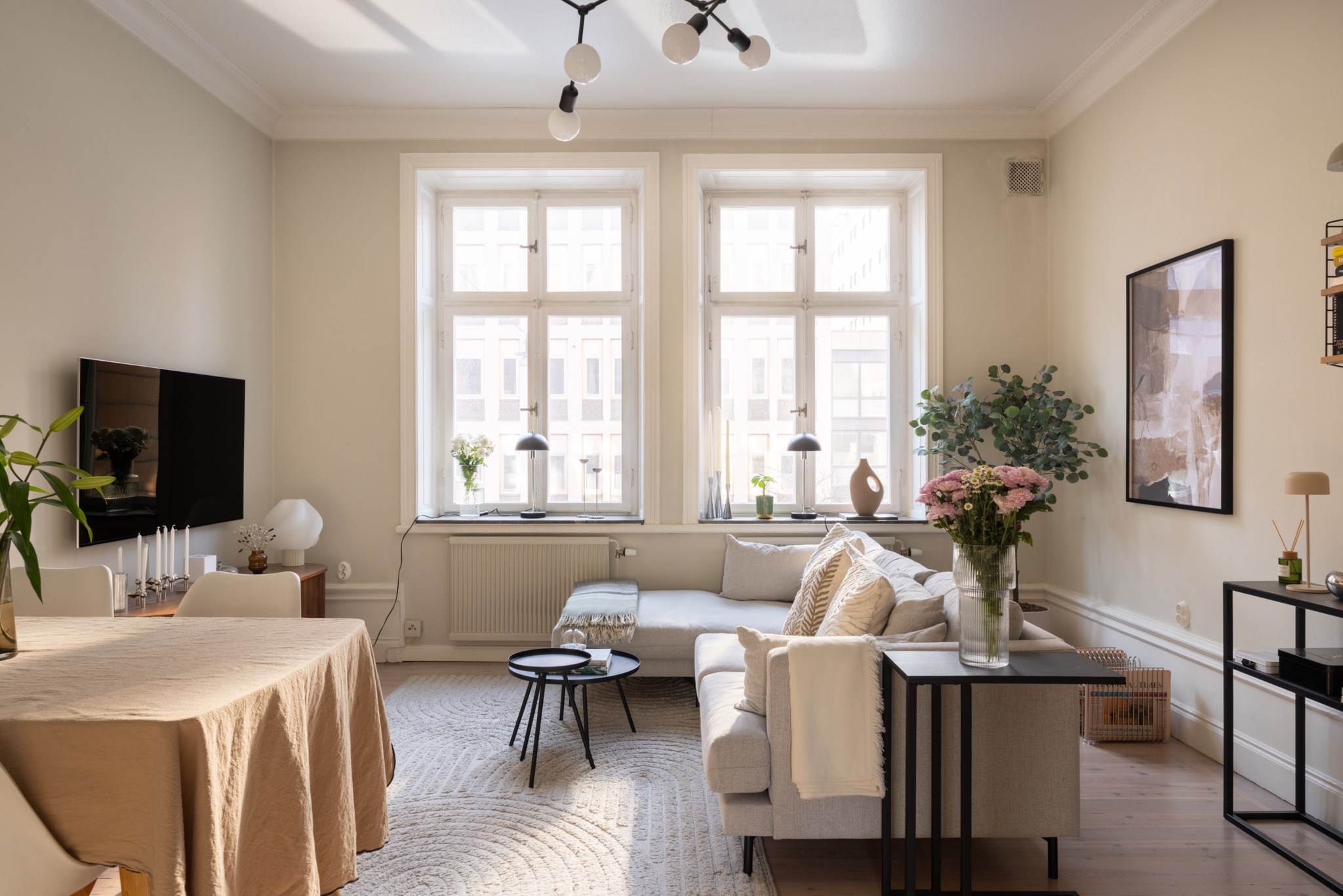 Det rymliga vardagsrummet badar i dagsljus från stora spröjsade fönster och erbjuder gott om plats för både sociala ytor, middagar och avkoppling. Köket är smakfullt renoverat med bra arbetsytor och funktionell förvaring, perfekt för både vardagsmatlagning och helgmiddagar med vänner. Från sovrummet når du en charmig balkong med utsikt över den grönskande innergården, en lugn oas mitt i stadsbruset där du kan njuta av morgonkaffet eller sommarens ljumma kvällar. Bostaden kompletteras av en praktisk walk-in-closet och ett helkaklat badrum i tidlös design – allt i ett genomgående välskött skick som känns både elegant och hemtrevligt.