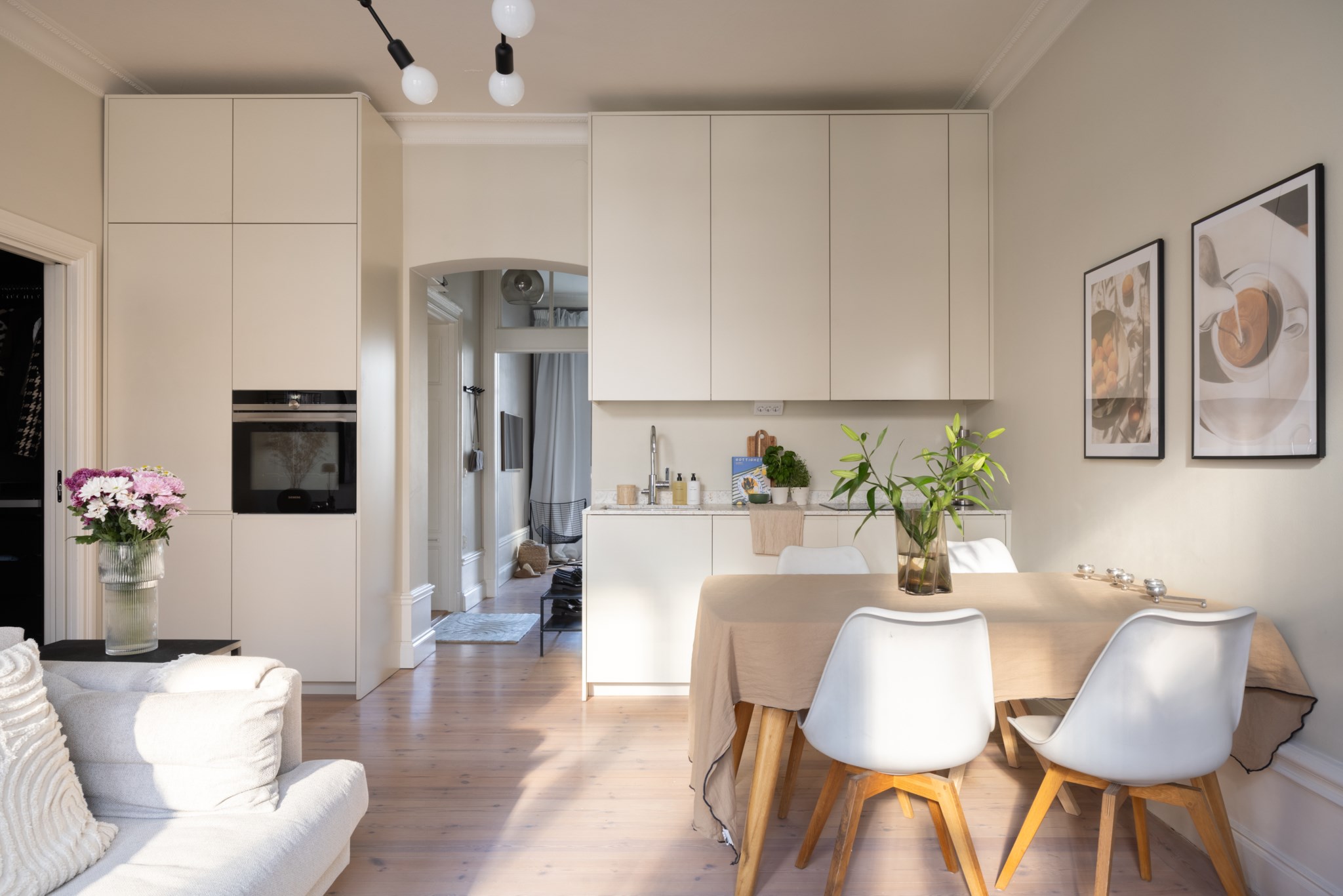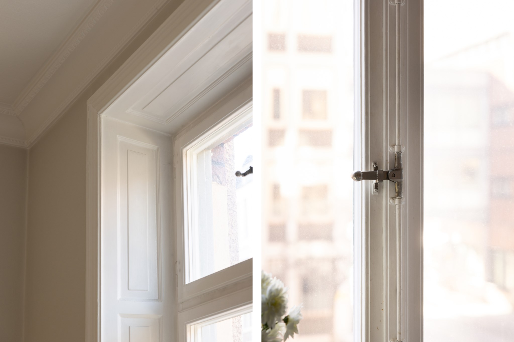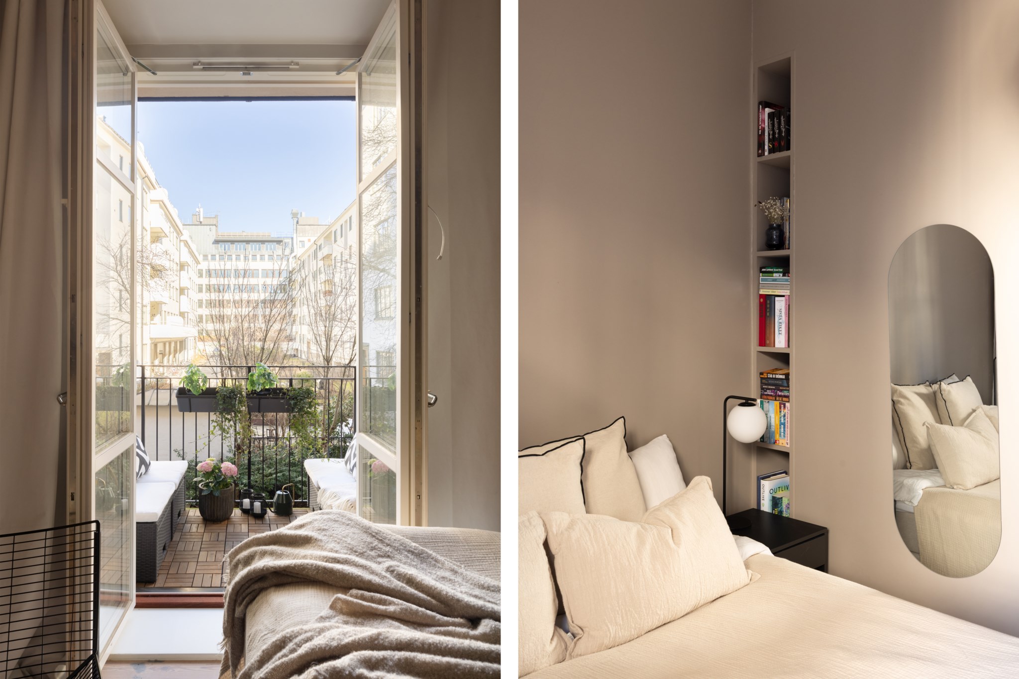 Det rymliga vardagsrummet badar i dagsljus från stora spröjsade fönster och erbjuder gott om plats för både sociala ytor, middagar och avkoppling. Köket är smakfullt renoverat med bra arbetsytor och funktionell förvaring, perfekt för både vardagsmatlagning och helgmiddagar med vänner. Från sovrummet når du en charmig balkong med utsikt över den grönskande innergården, en lugn oas mitt i stadsbruset där du kan njuta av morgonkaffet eller sommarens ljumma kvällar. Bostaden kompletteras av en praktisk walk-in-closet och ett helkaklat badrum i tidlös design – allt i ett genomgående välskött skick som känns både elegant och hemtrevligt.