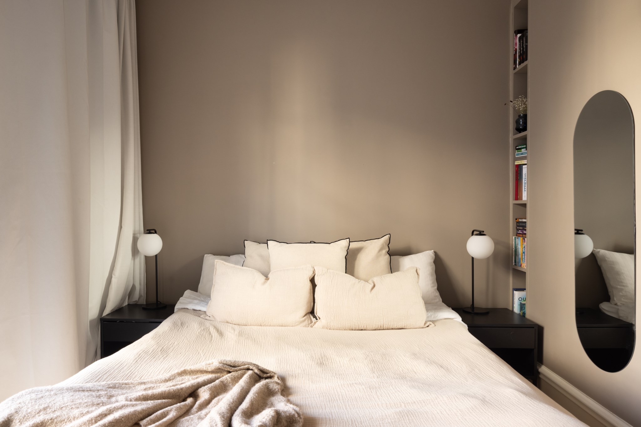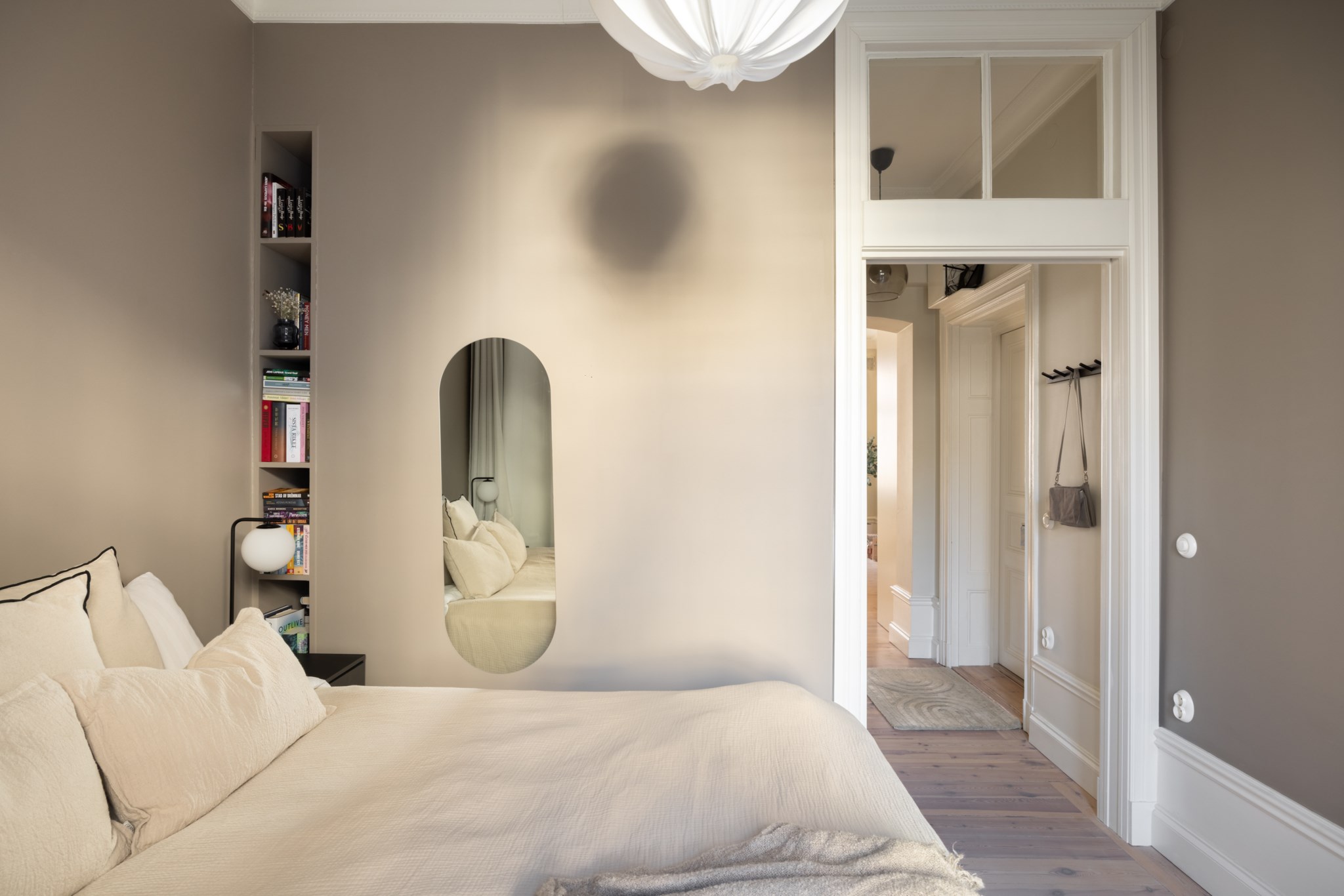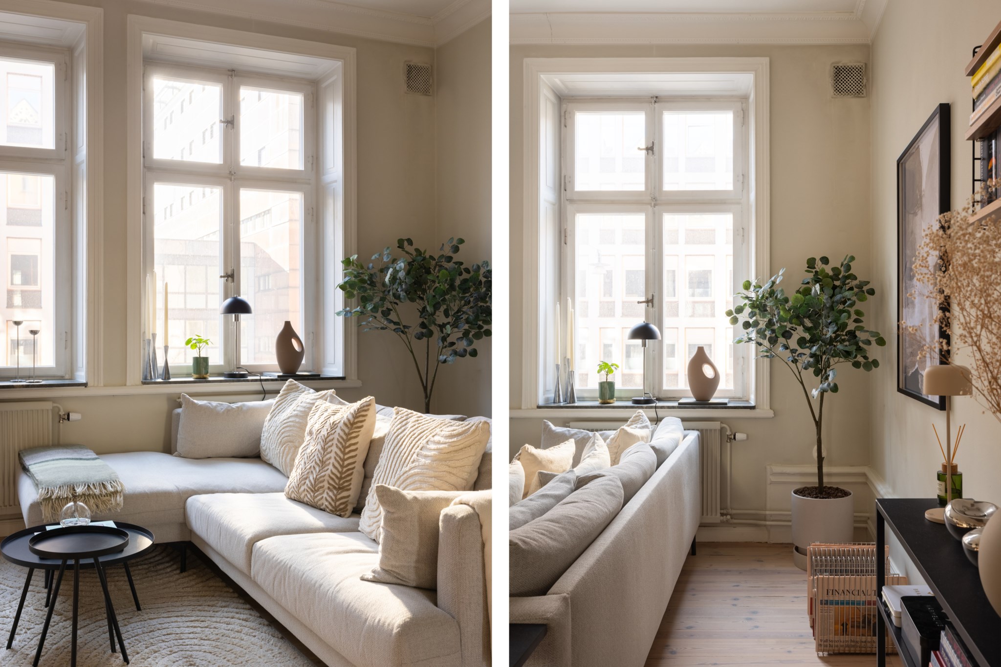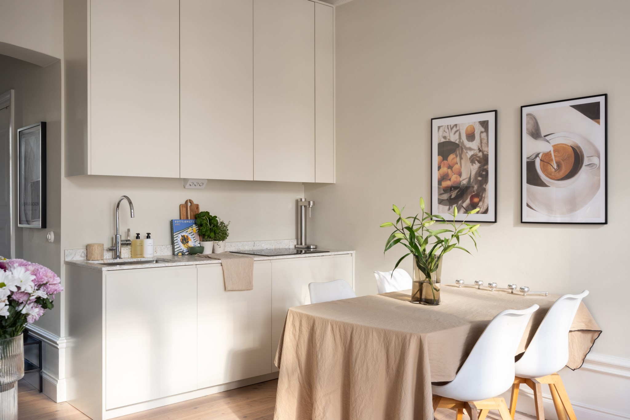 Det rymliga vardagsrummet badar i dagsljus från stora spröjsade fönster och erbjuder gott om plats för både sociala ytor, middagar och avkoppling. Köket är smakfullt renoverat med bra arbetsytor och funktionell förvaring, perfekt för både vardagsmatlagning och helgmiddagar med vänner. Från sovrummet når du en charmig balkong med utsikt över den grönskande innergården, en lugn oas mitt i stadsbruset där du kan njuta av morgonkaffet eller sommarens ljumma kvällar. Bostaden kompletteras av en praktisk walk-in-closet och ett helkaklat badrum i tidlös design – allt i ett genomgående välskött skick som känns både elegant och hemtrevligt.