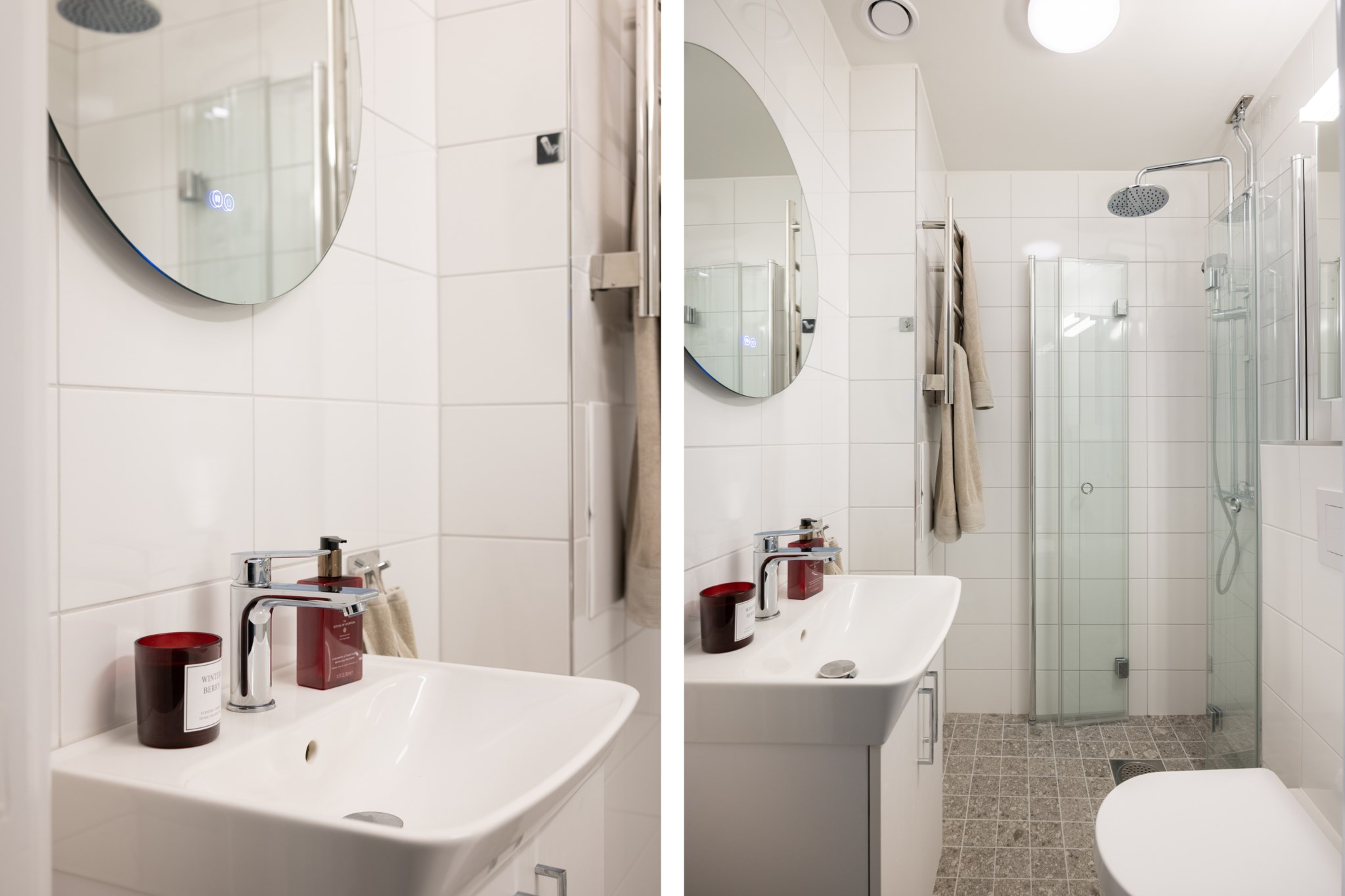 Badrum med tidlösa materialval bestående av vitt kakel och klinker i grå nyans. Badrummet är utrustat med vägghängd WC, handfat med kommod, spegel med belysning, dusch med glasväggar samt handdukstork med timer. Förvaring finns via spegelskåp. Badrummet är har genomgått ett stambyte som färdigställdes under december 2025 (slutbesiktning december 2025/januari 2026). Under stambytet installerades golvvärme.
