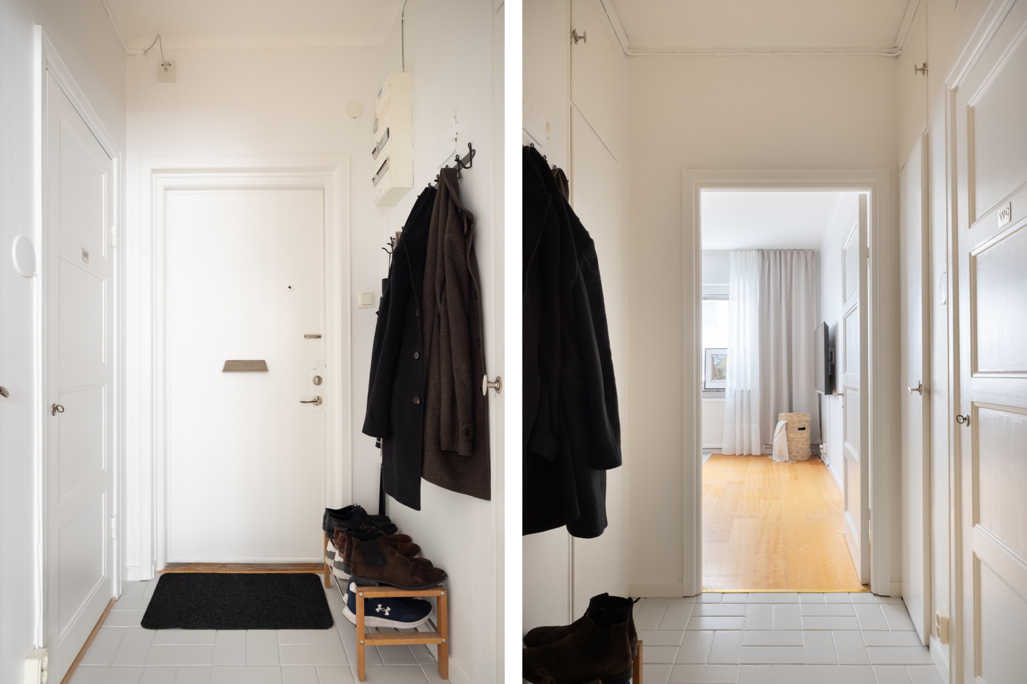 Rymlig hall med plats för avhängning och skoställ. Ytskikten består av ljusa väggar och ljust klinker. Hallen erbjuder generöst med förvaringsmöjligheter via intilliggande garderober.