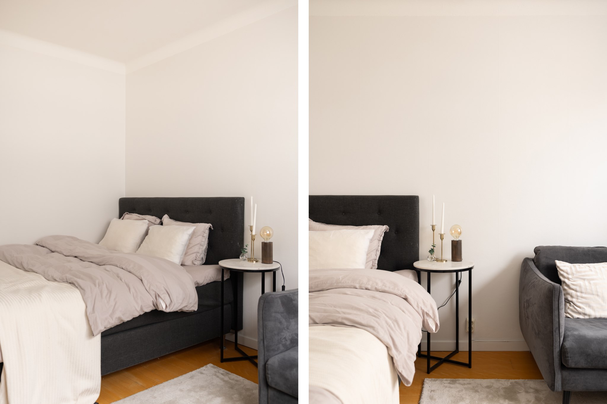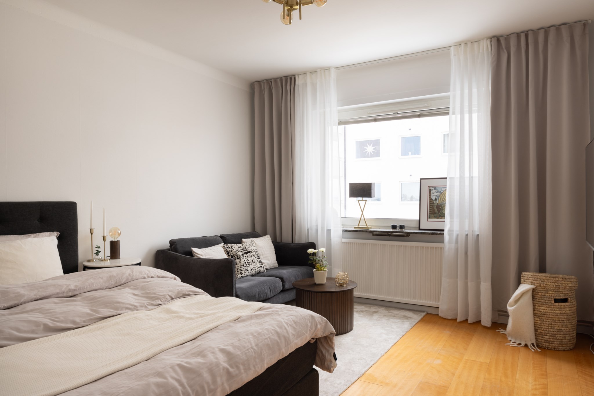 Luftigt allrum med generöst ljusinsläpp via stort fönster. Här inryms säng, soffa, soffbord, säng och annat möblemang efter smak och behov. Smakfulla ytskikt bestående av ljusa väggar och ljust golv.