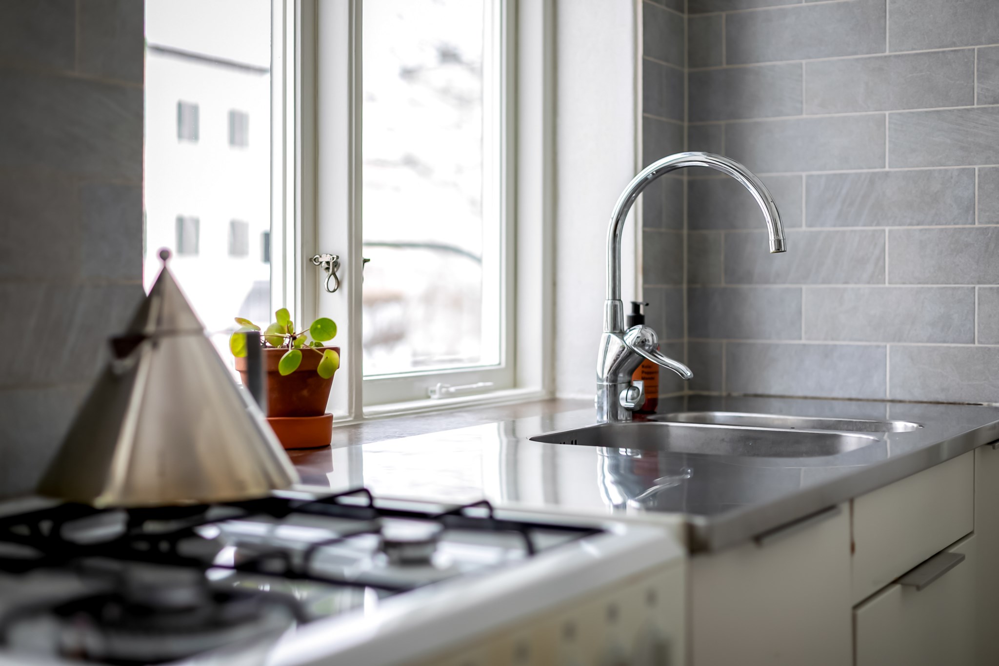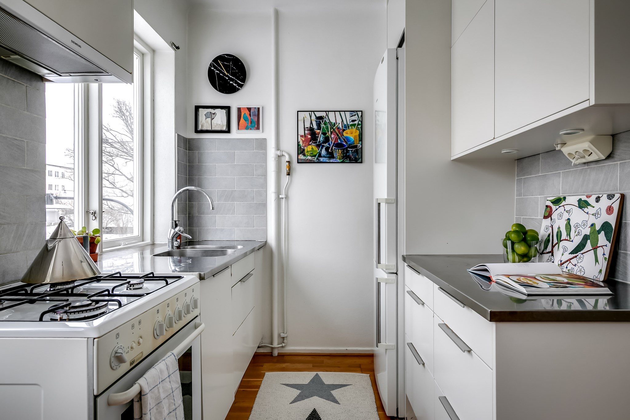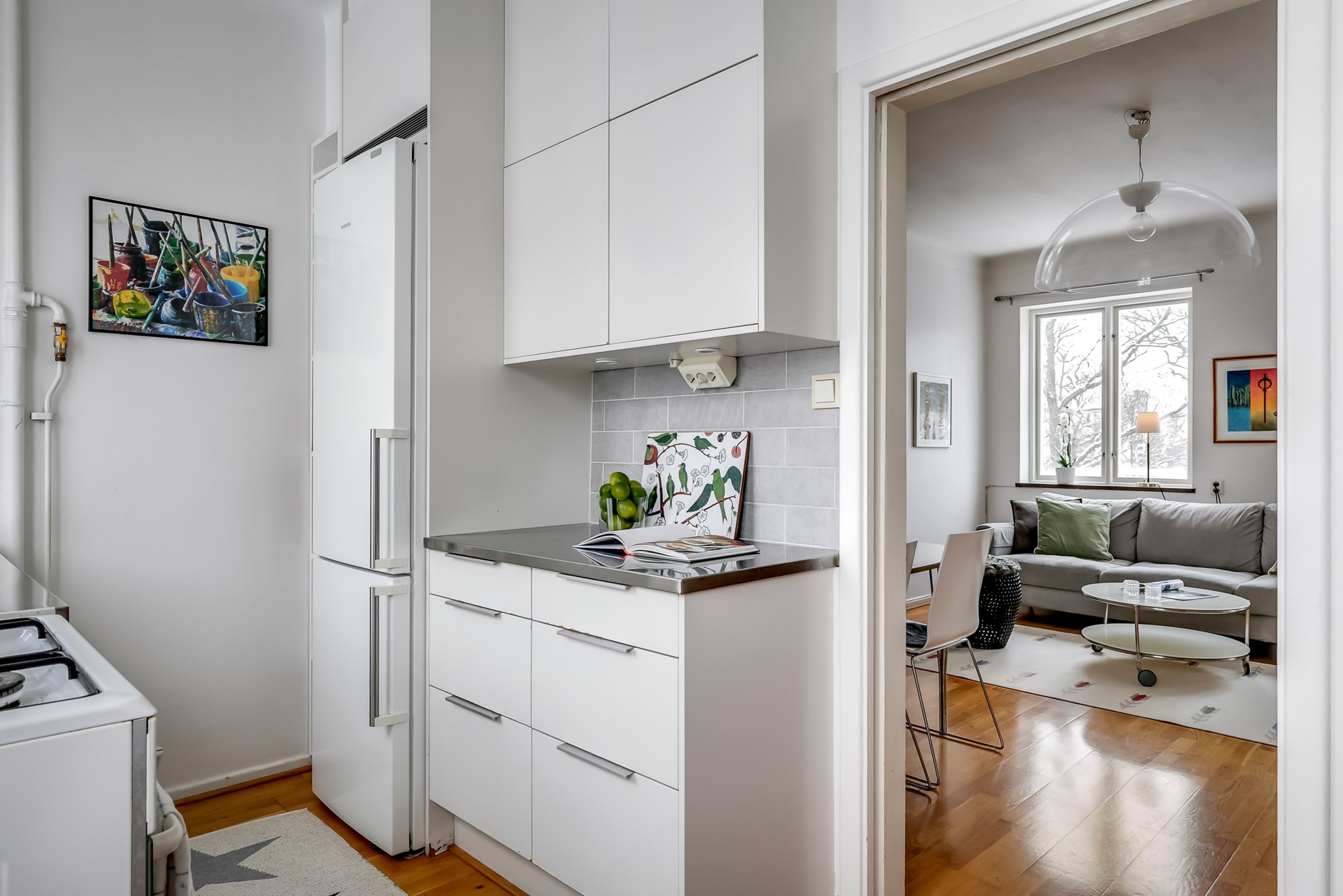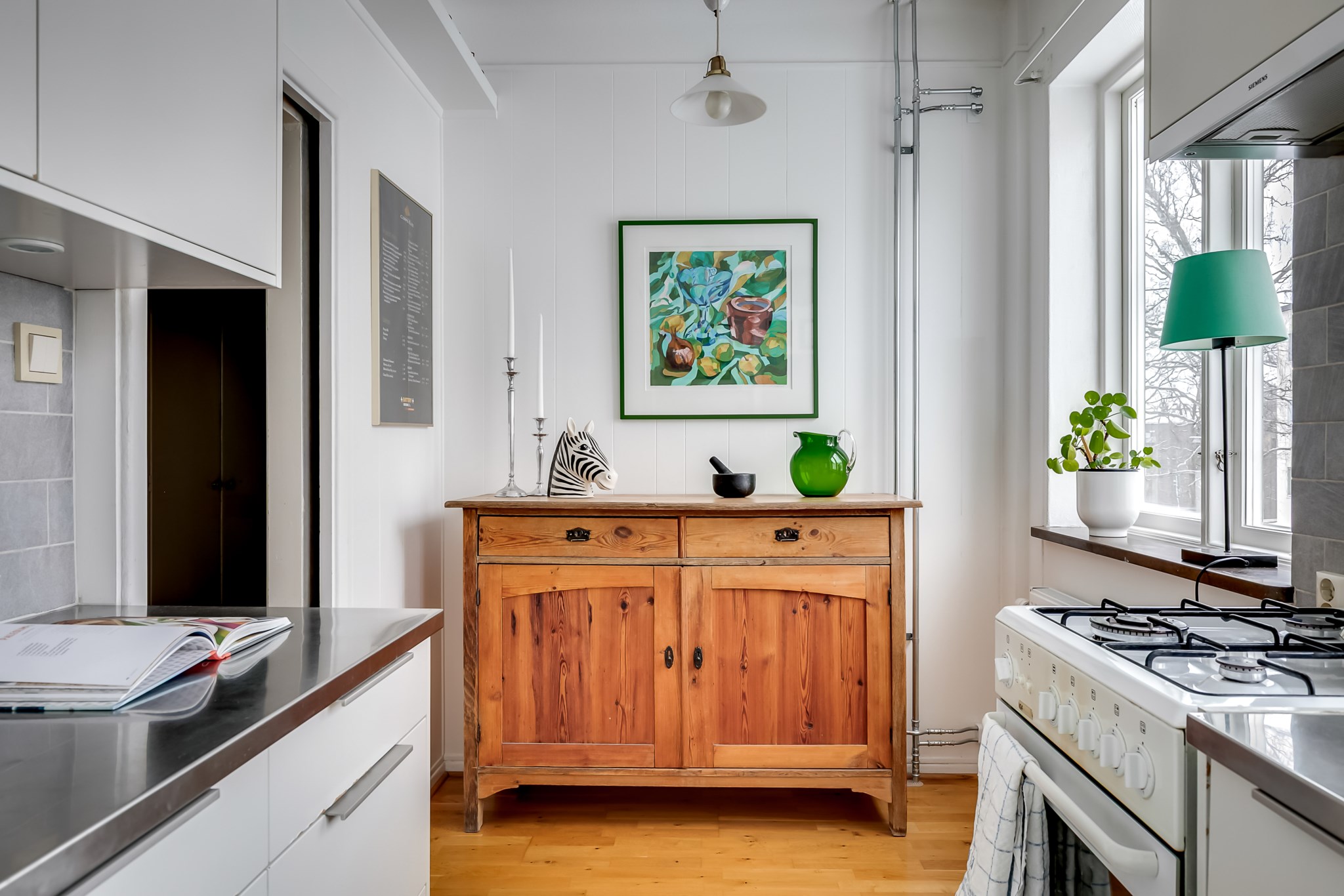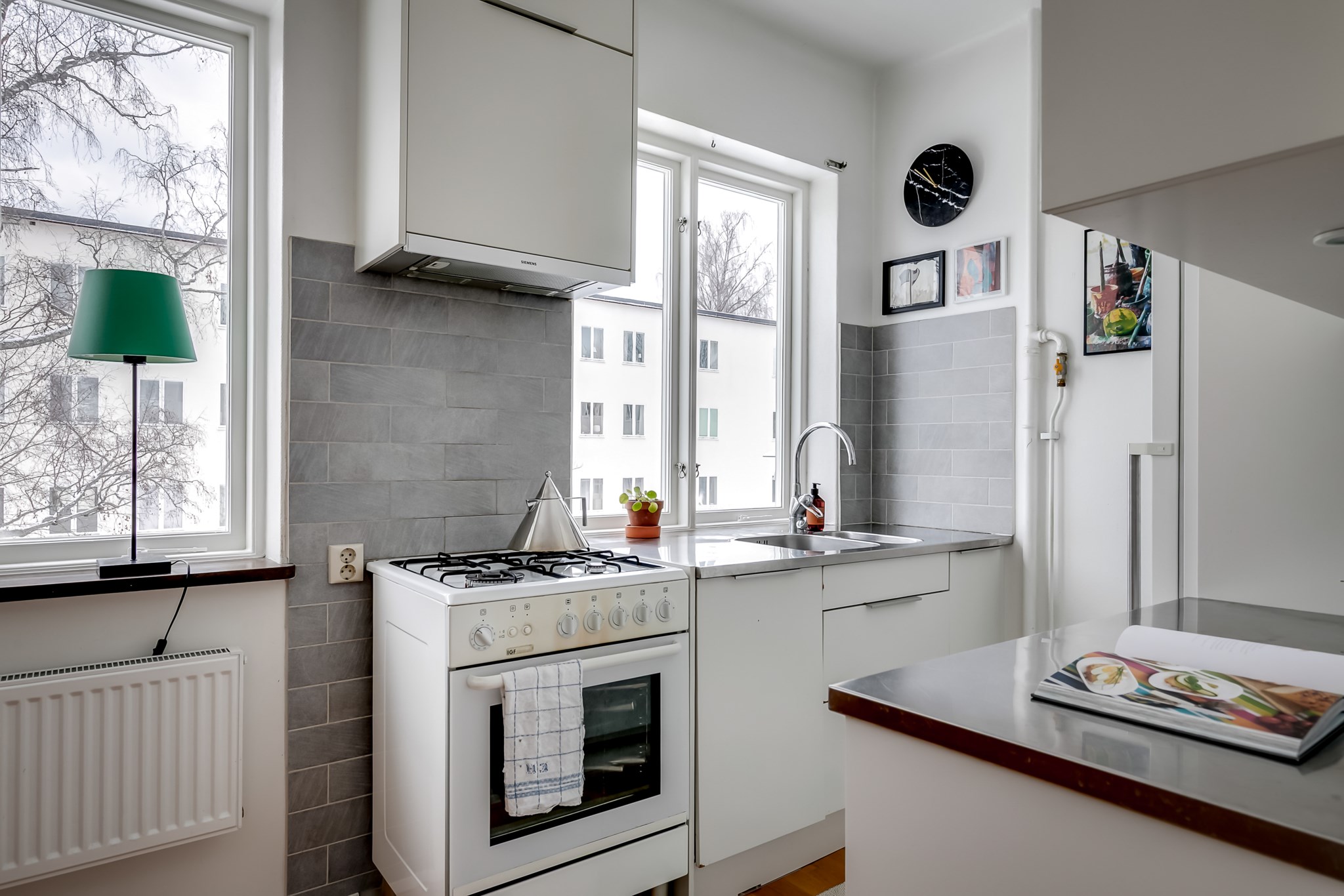 Kök inrett med ljusa skåpsluckor, grått kakel och arbetsbänk i rostfritt stål. Två fönsterpartier släpper in generöst med naturligt ljus och skapar en luftig känsla. Här finns även plats för ett mindre bord eller annan möblering efter önskemål och behov. Ljusa ytskikt och parkettgolv.
