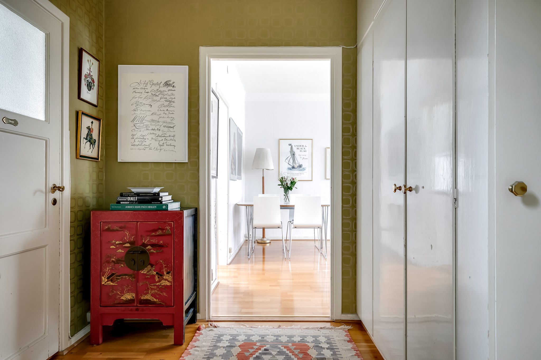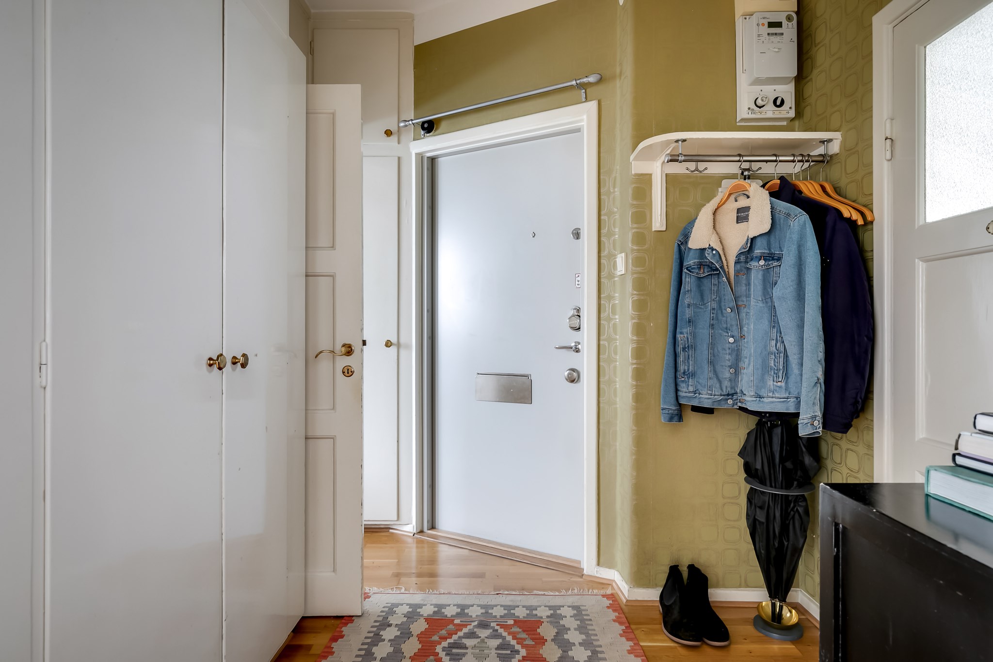 Rymlig och välkomnande hall med plats för avhängning av ytterkläder på hatthylla intill ytterdörren. Ytterligare förvaring erbjuds i flera inbyggda garderober. Tapetserade ytskikt och parkettgolv.