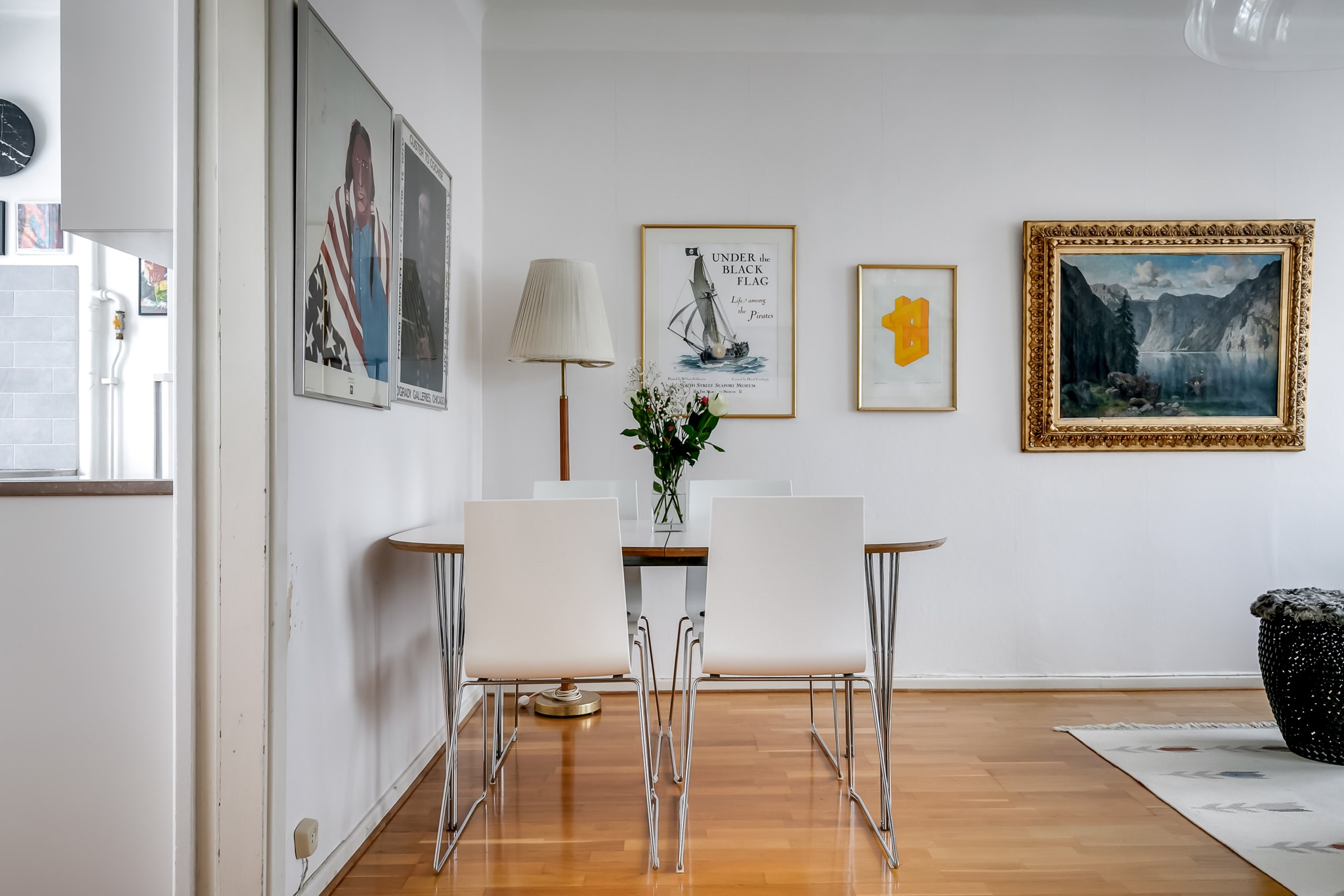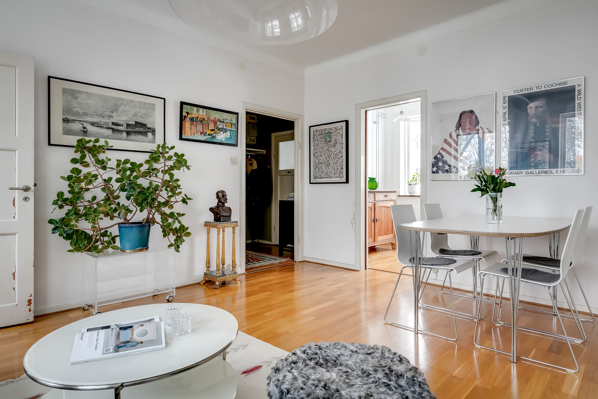 Ljust vardagsrum med fint ljusinsläpp från två fönsterpartier. Rummet är lättmöblerat med plats för både soffgrupp och matgrupp i en social och trivsam lösning. Ljusa ytskikt och parkettgolv.