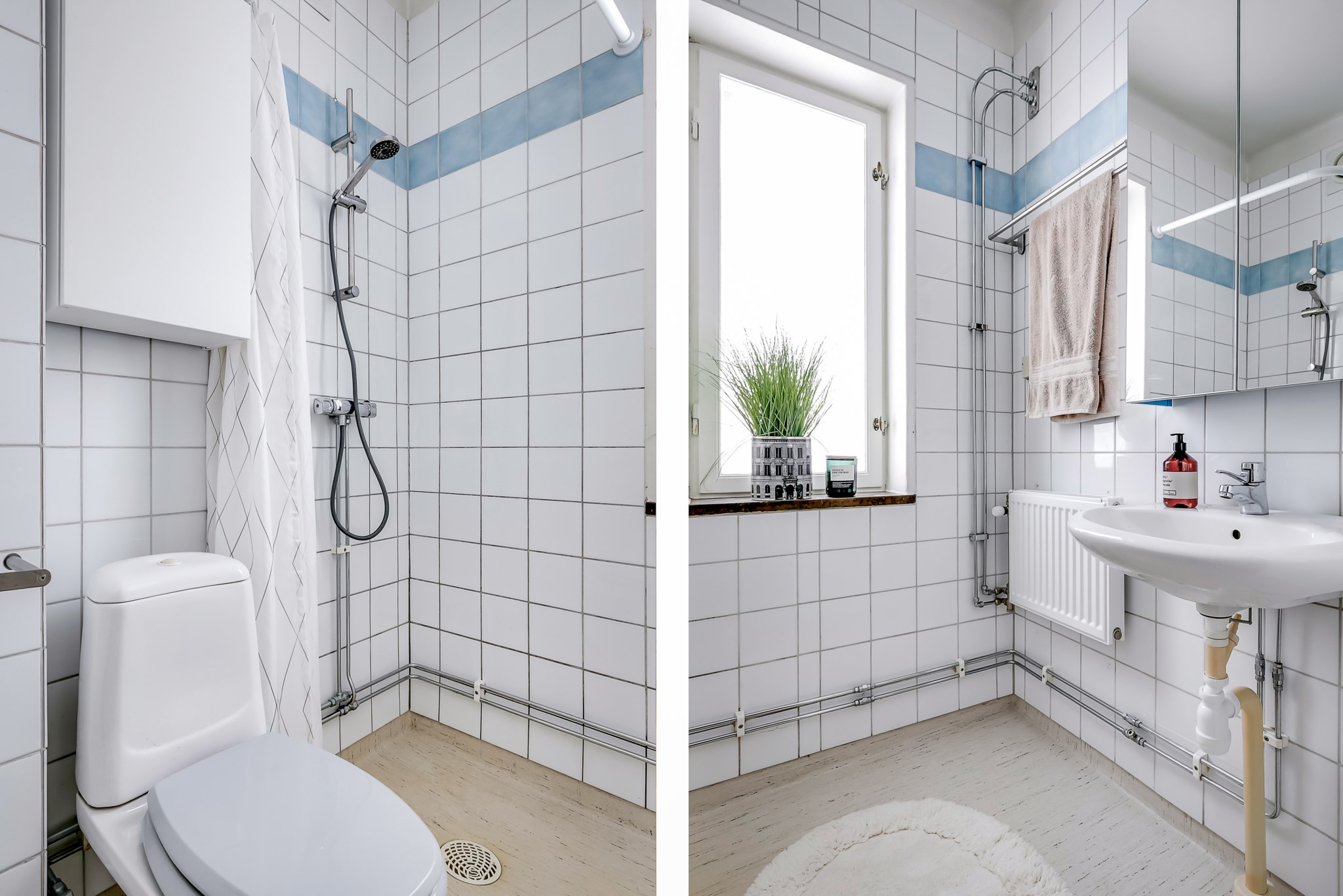 Badrum med kaklade väggar, ljust golv och ett fönster som tillför naturligt ljus och möjliggör vädring. Badrummet är inrett med WC, handfat, spegelskåp samt dusch.