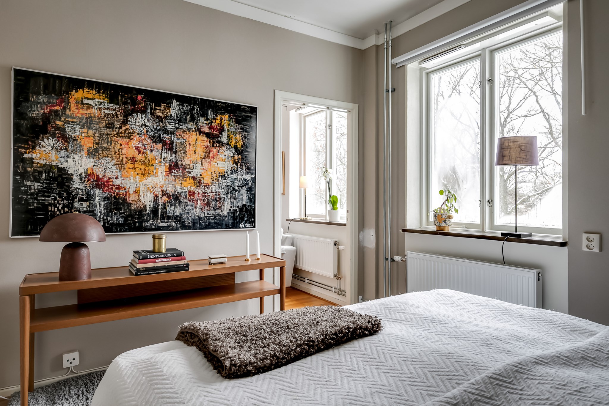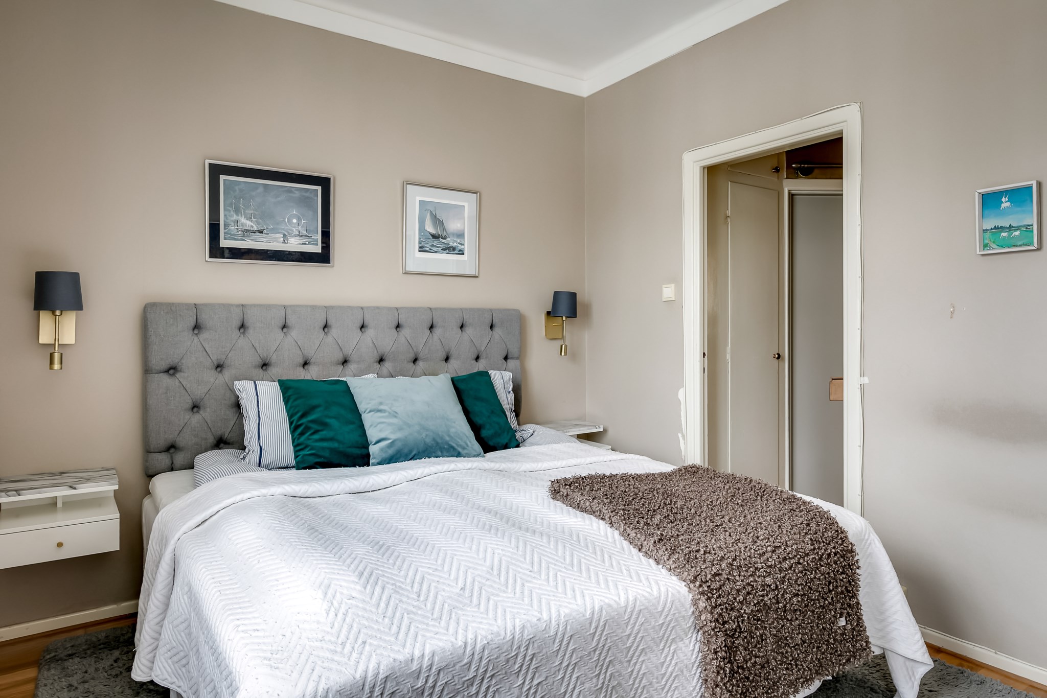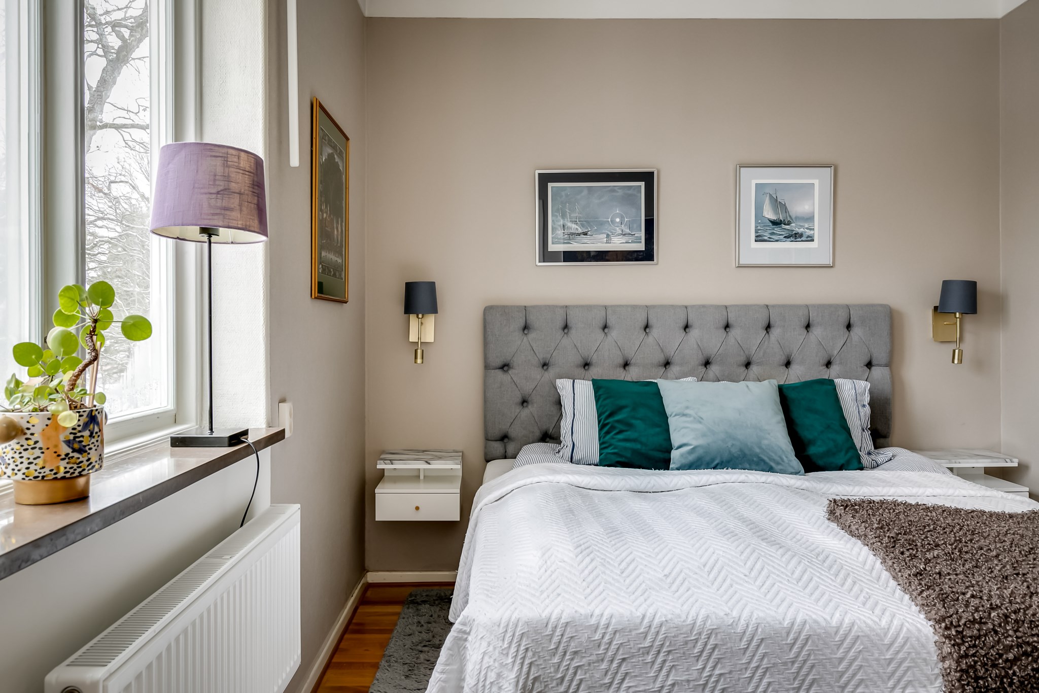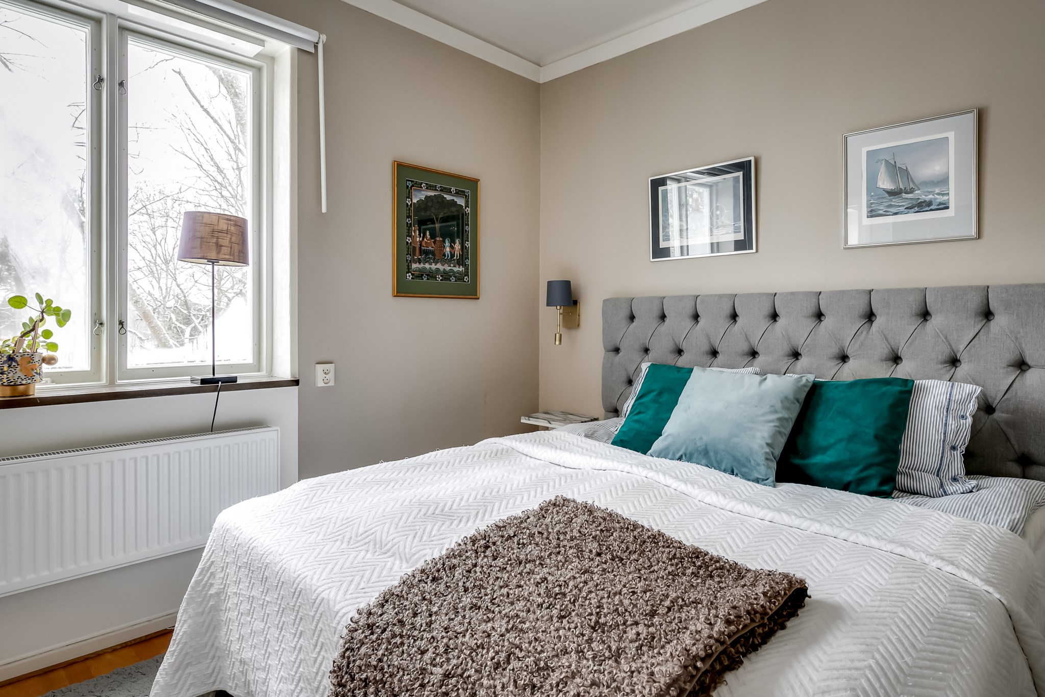 Rogivande sovrum med plats för dubbelsäng och tillhörande sängbord. Rummet erbjuder även utrymme för förvaringsmöbel eller annat möblemang efter behov. Neutralt målade ytskikt och parkettgolv.