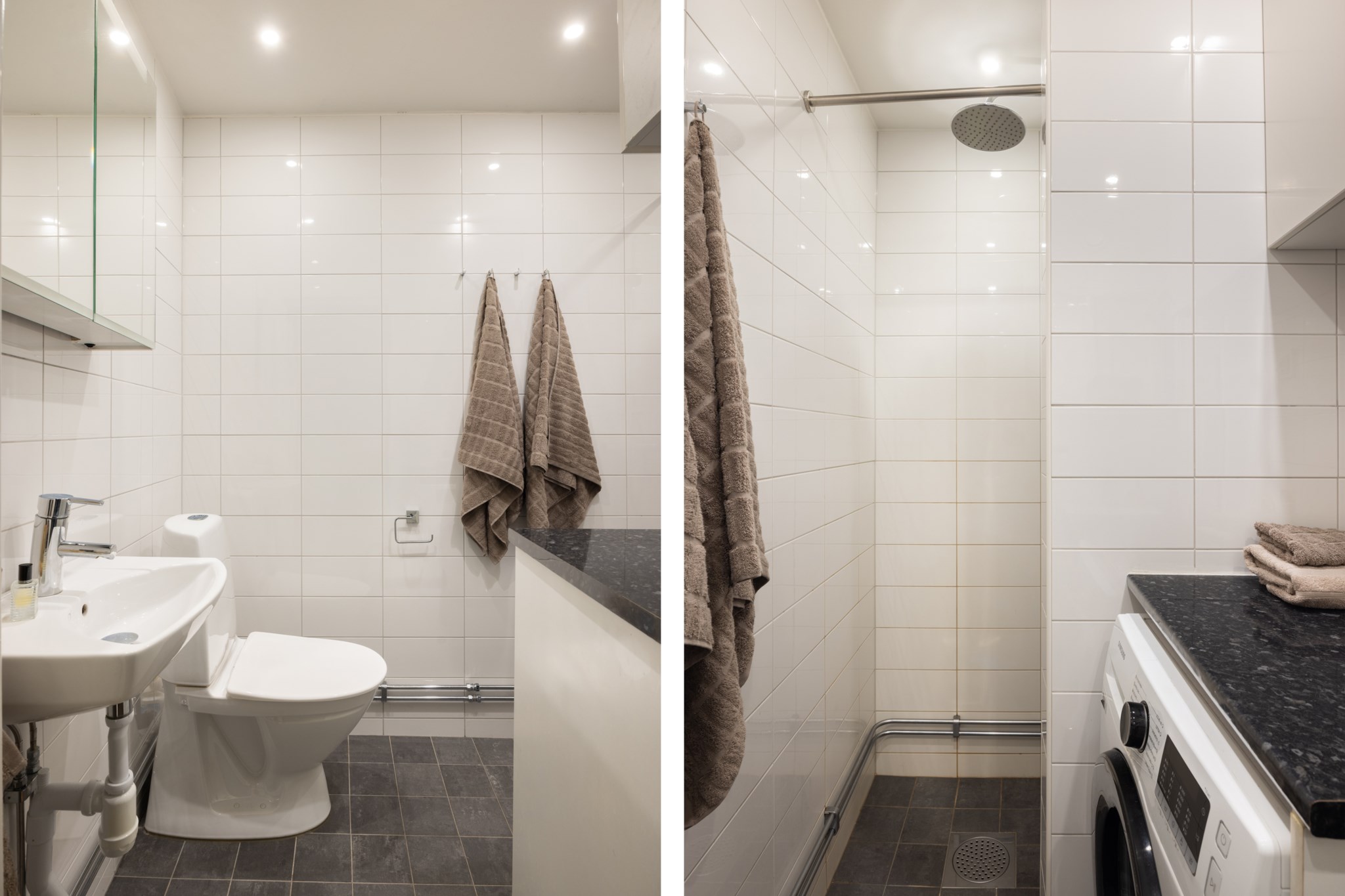 Modernt helkaklat badrum med ljust kakel och grått klinkergolv. Badrummet är inrett med WC, handfat, spegelskåp, badrumsförvaring samt tvättmaskin. Duschhörnan är utrustad med en lyxig takdusch.