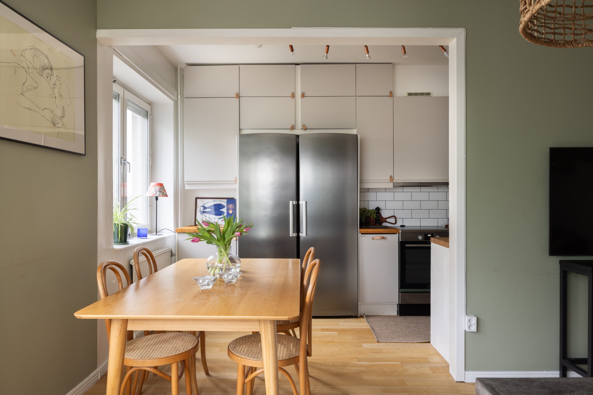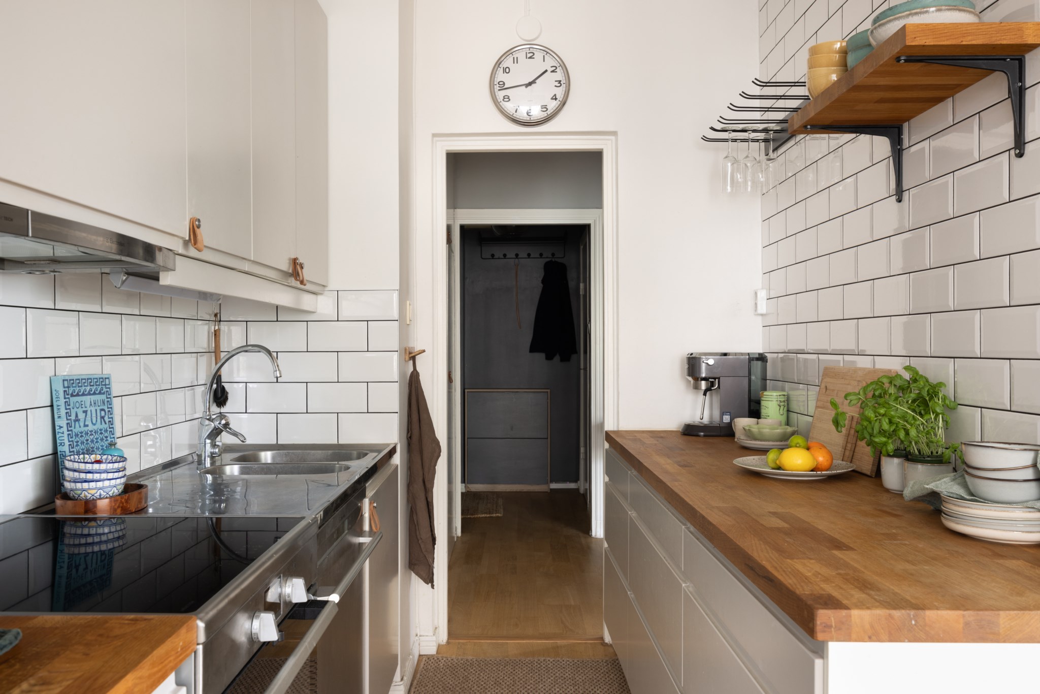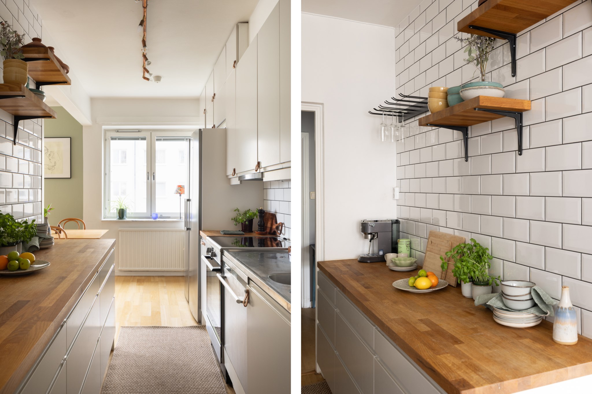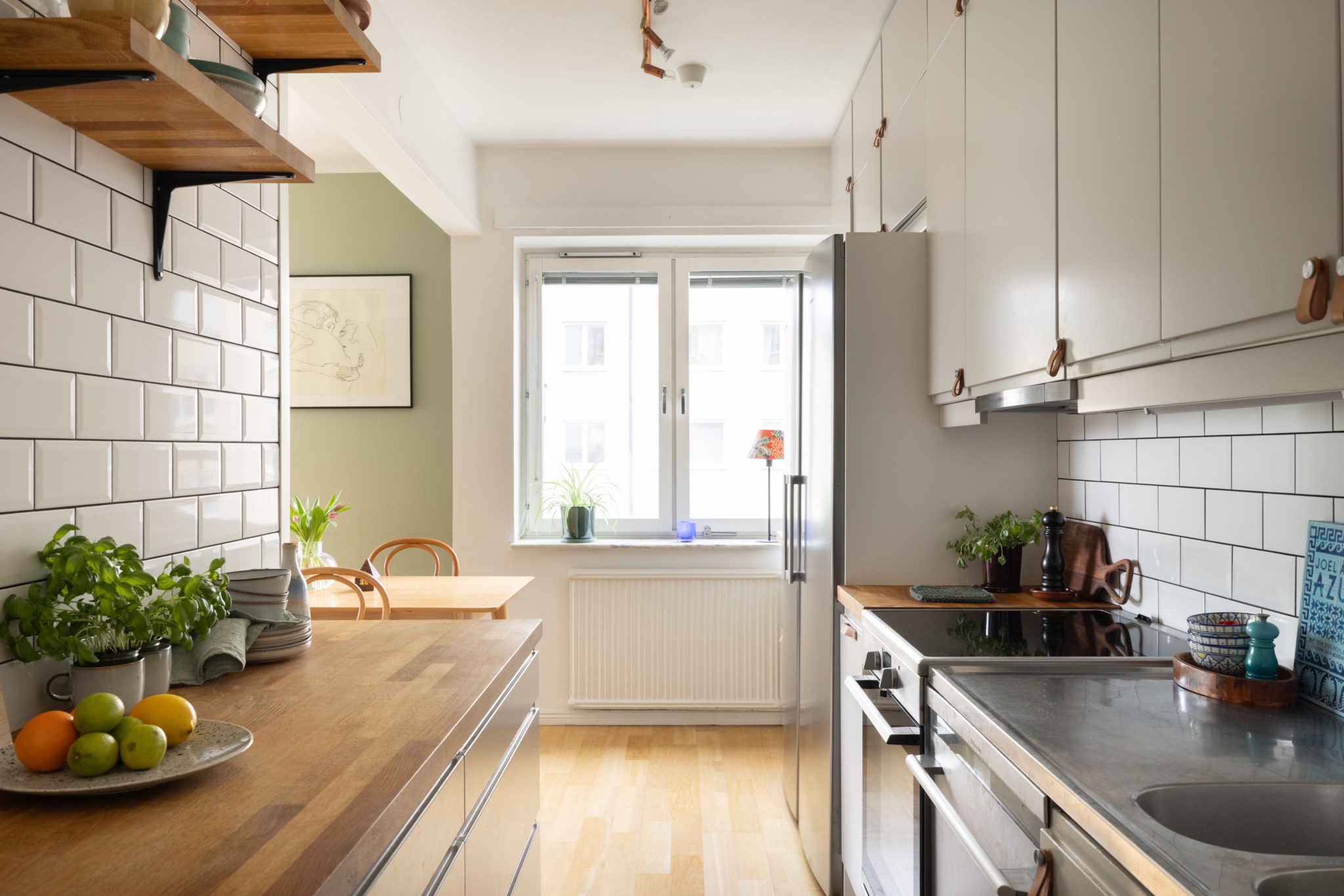 Klassiskt kök med goda arbetsytor och bra förvaring bakom släta, ljusa skåpsfronter. Den vita kaklade väggpanelen som sträcker sig hela vägen upp till tak kombineras med öppna trähyllor och en matchande bänkskiva i trä. Ett fint fönsterparti ger ett generöst ljusinsläpp och skapar en naturlig plats för matbord intill. Köket är halvöppet mot vardagsrummet och utrustat med kyl/frys, spis, fläkt, ugn och diskmaskin. Ljusa ytskikt och parkettgolv.