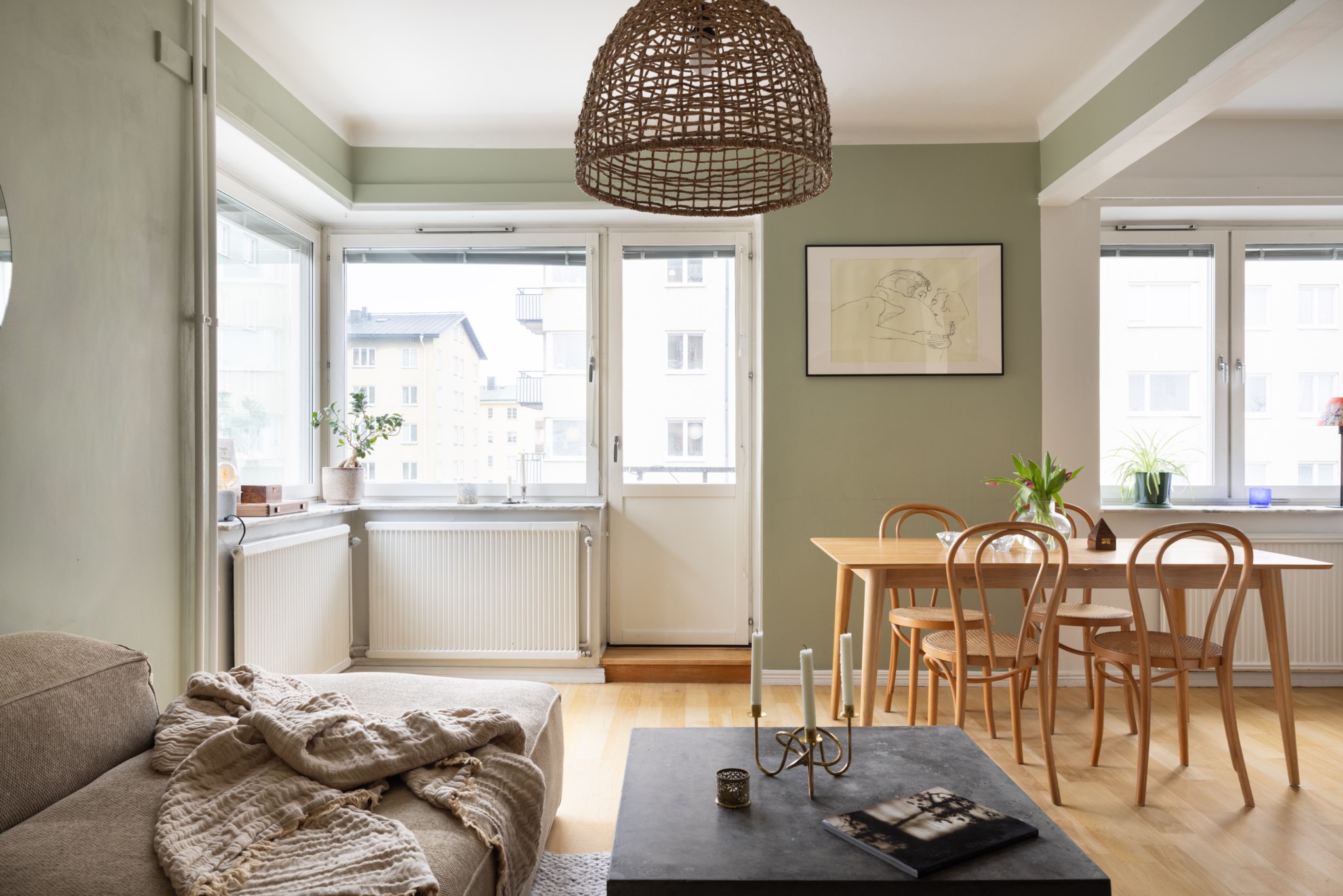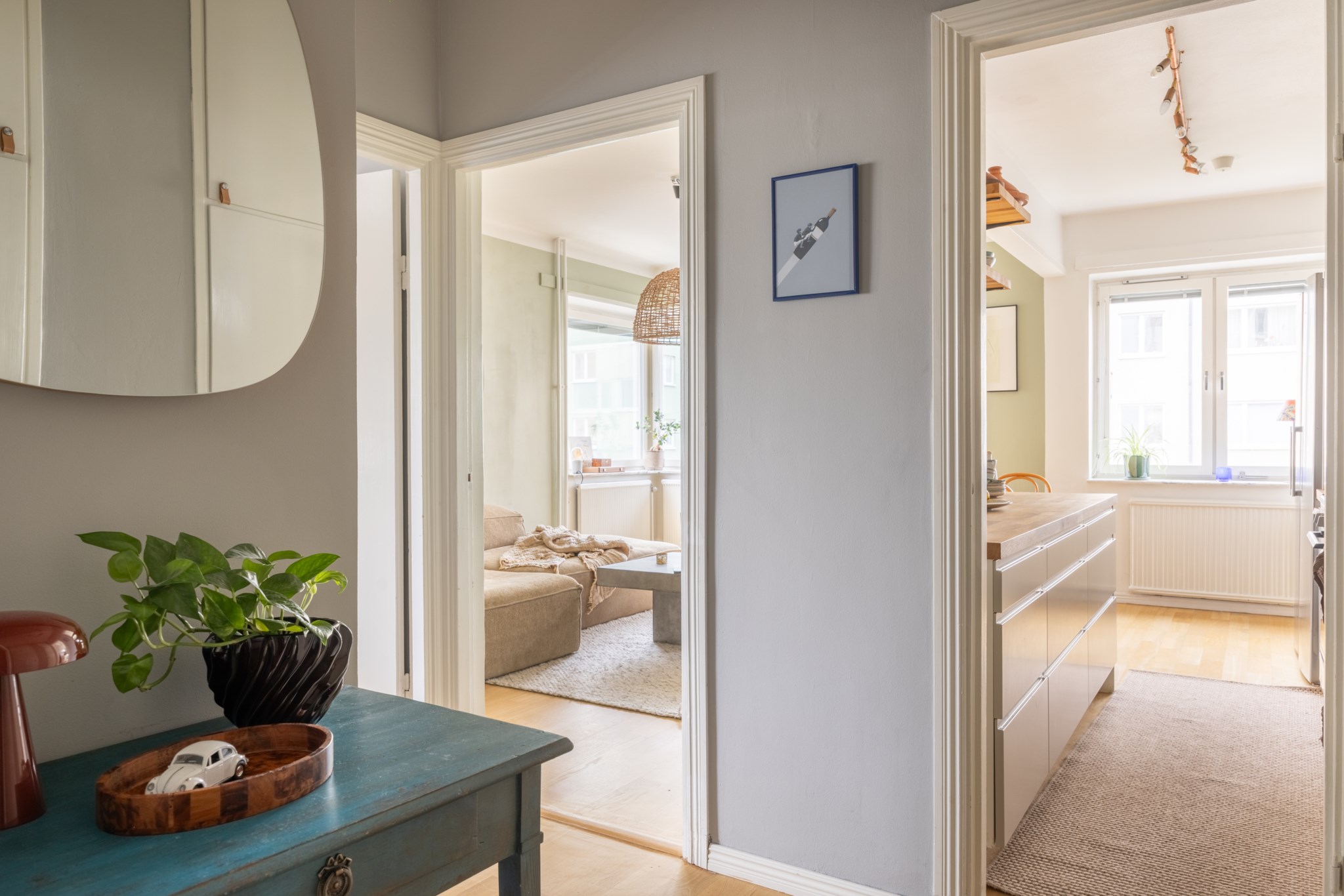 Här erbjuds en perfekt planerad lägenhet med trevligt kök i öppen planlösning mot vardagsrummet – en social och inbjudande yta som passar både vardag och umgänge. Stora fönsterpartier i vackert gavelläge tillsammans med den soliga balkongen ger ett fantastiskt ljusinsläpp och en härlig känsla av rymd.