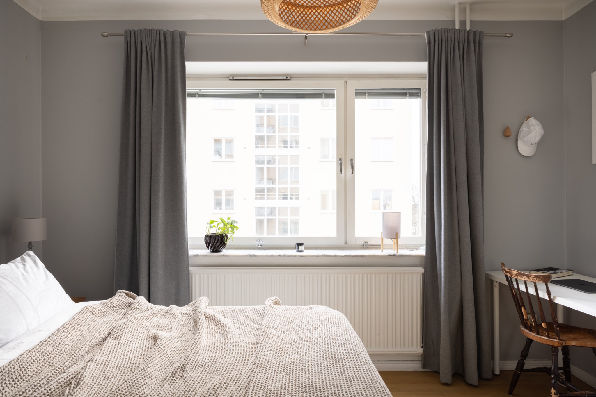 Rogivande sovrum med generöst ljusinsläpp från ett stort fönsterparti. Här finns plats för dubbelsäng med tillhörande sängbord samt förvaring i garderob. Rummet erbjuder även utrymme för ytterligare förvaringsmöbel, skrivbord eller annat möblemang efter behov. Ljusa ytskikt och parkettgolv.